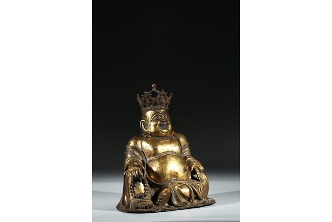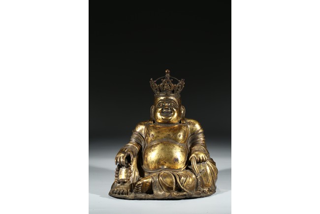 The laughing Buddha seated in rajalilasana, the right hand resting on the raised right knee holding a beaded necklace, dressed in loose robes opening at the chest to reveal the large belly, the face with a cheerful expression, flanked by a pair of long pendulous ears, crowned with a tiara. Ming Dynasty period.