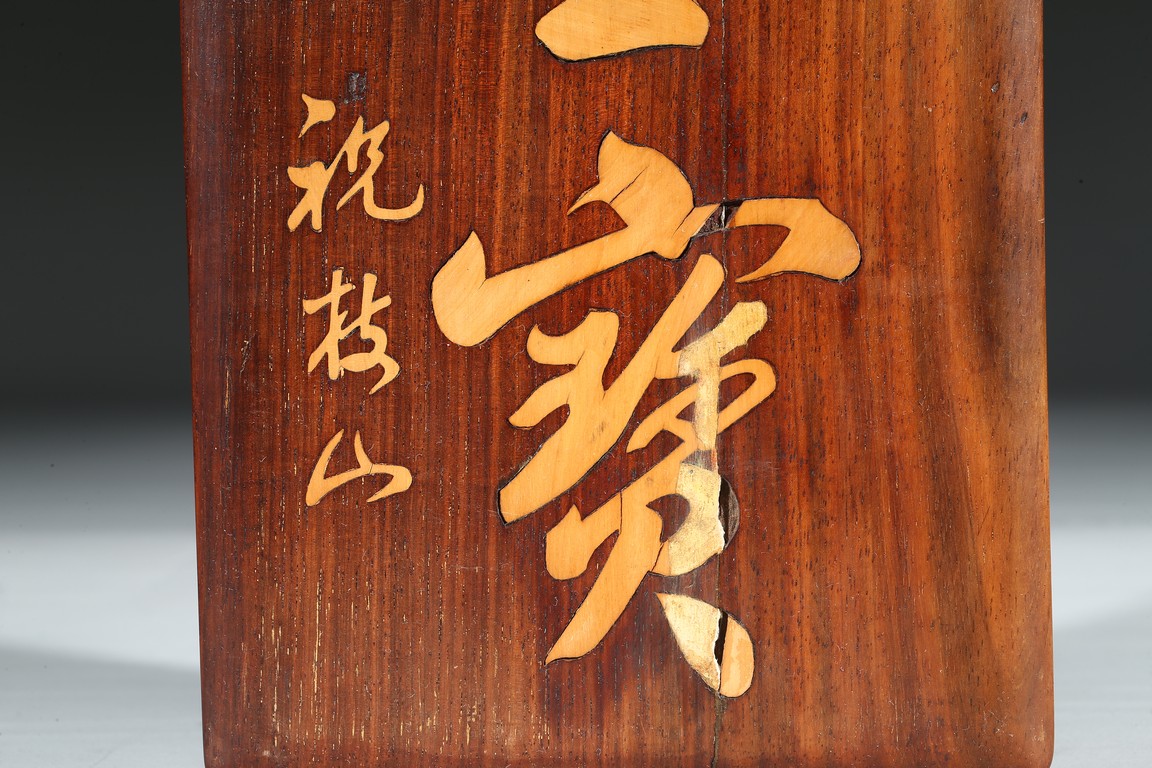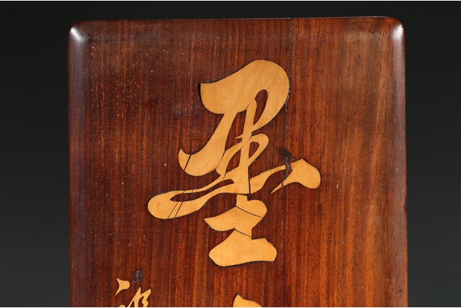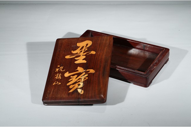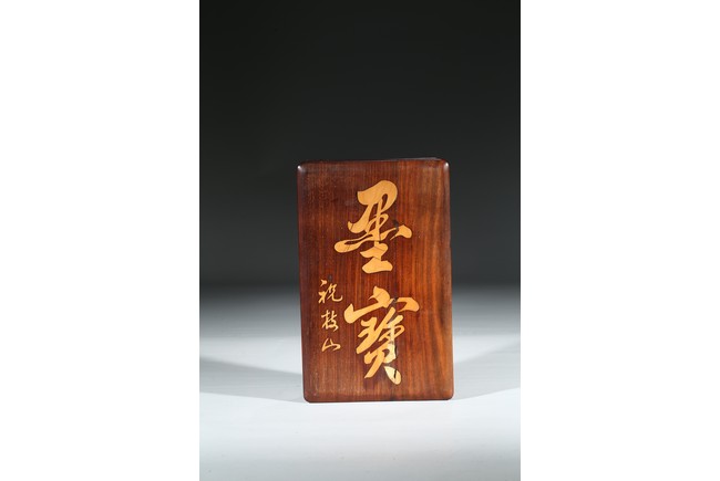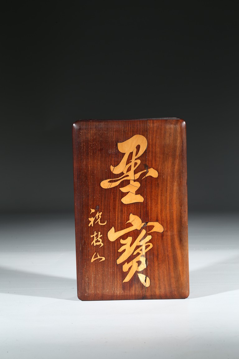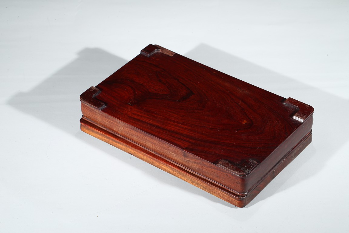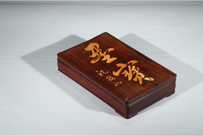 The shallow wood cover with a single panel top, gently curving to a beaded edge and straight sides, inlaid with two character 'Mo Bao' and signed 'Zhu Zhi Shan', with conforming base.