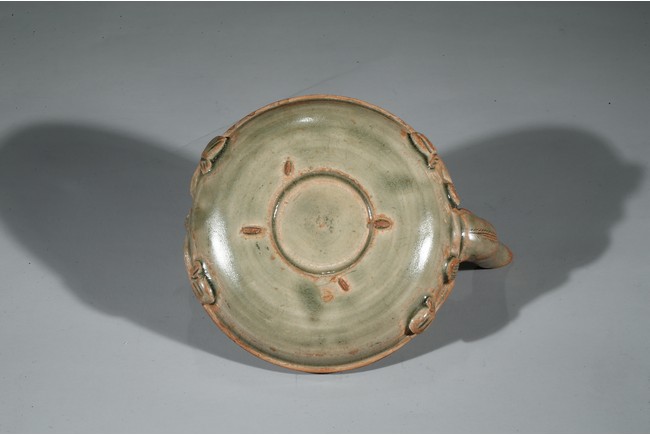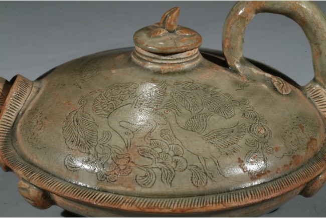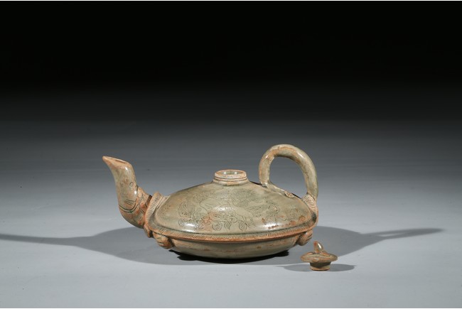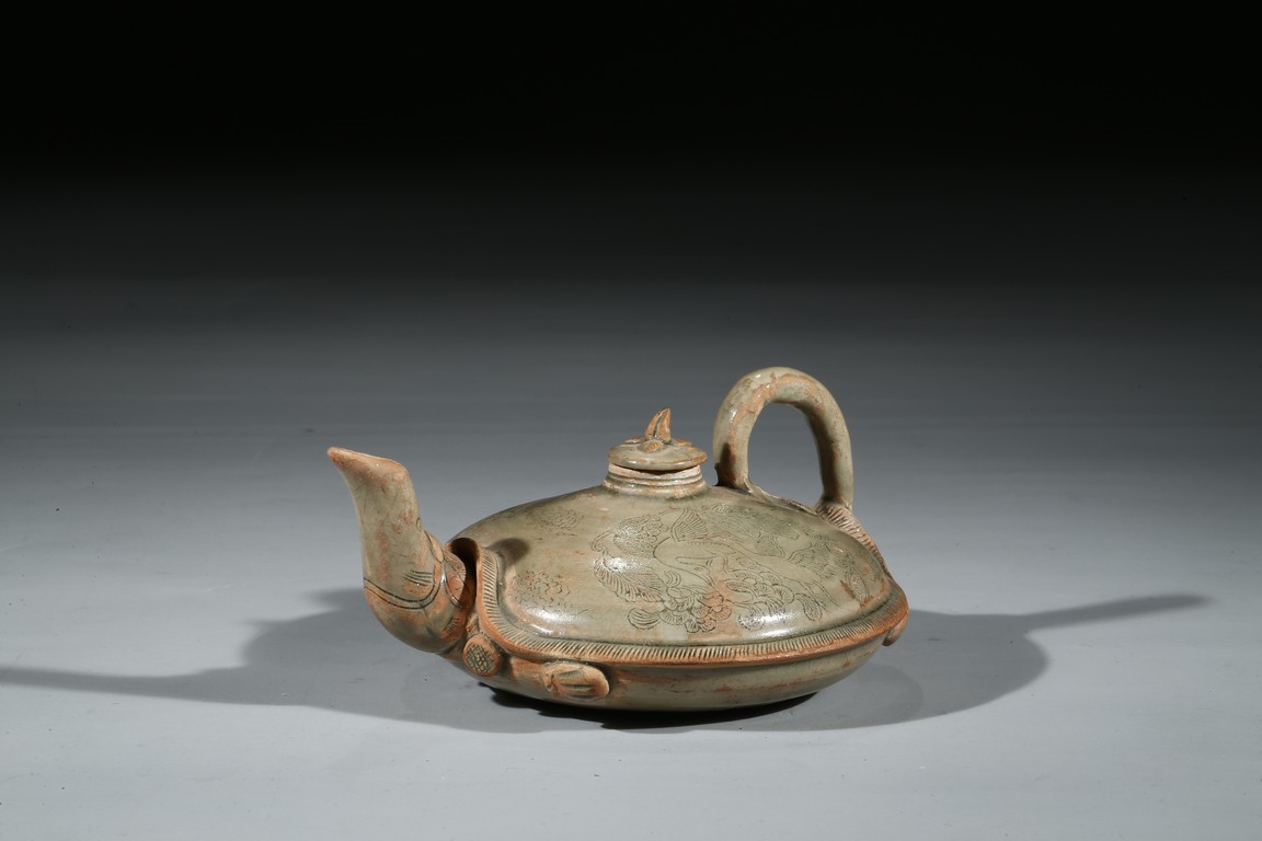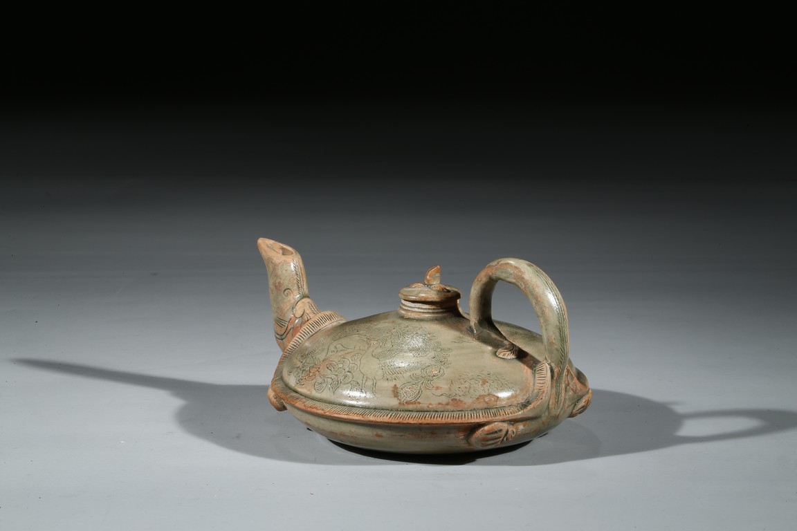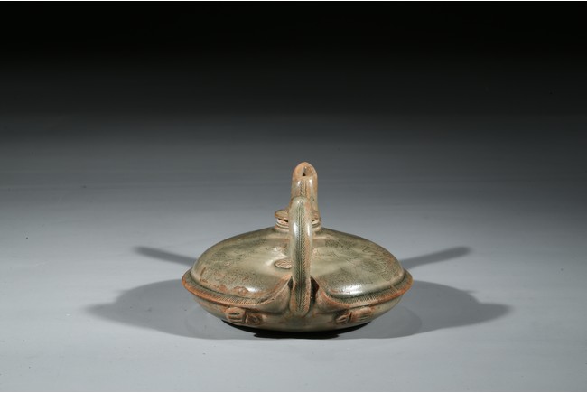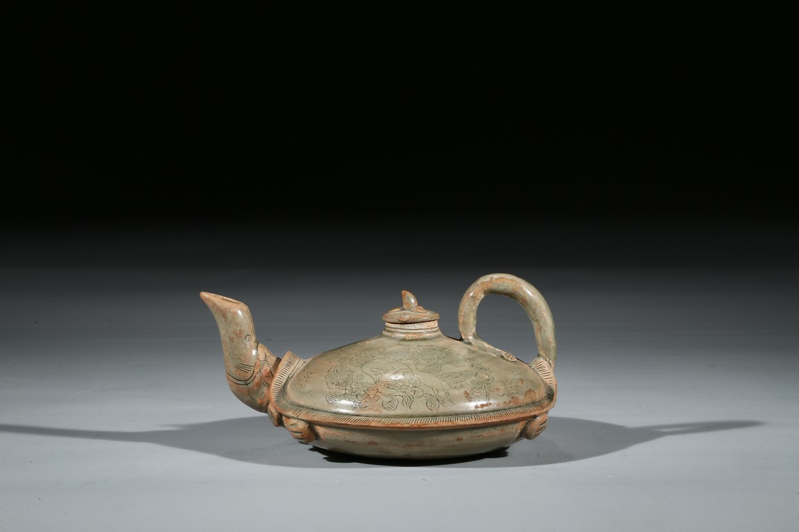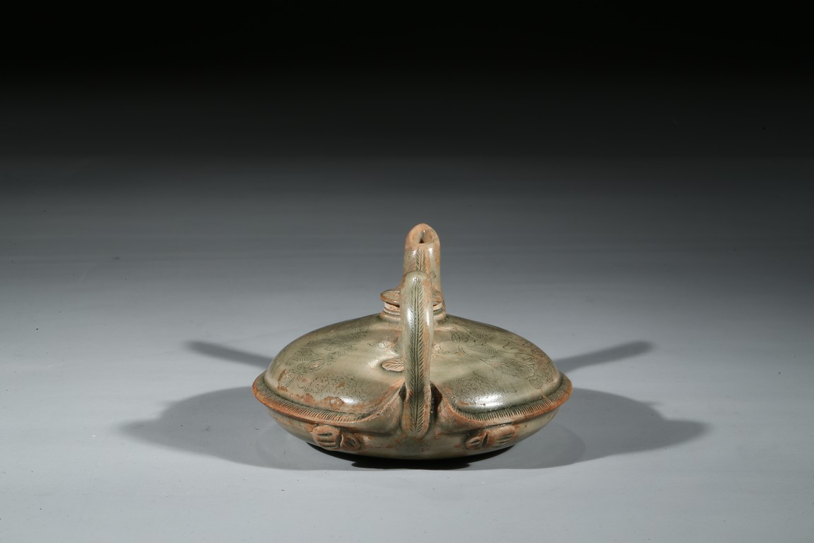 A CELADON INCISED COMPRESSED TEAPOT 明 青釉扁壺