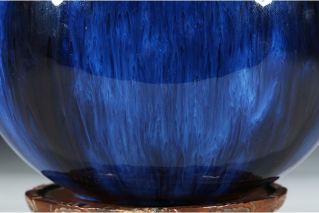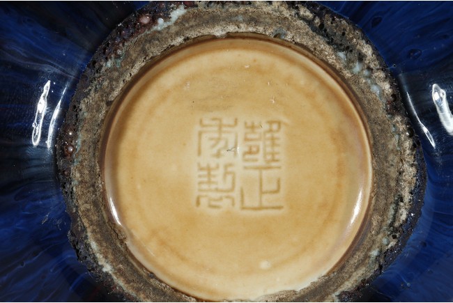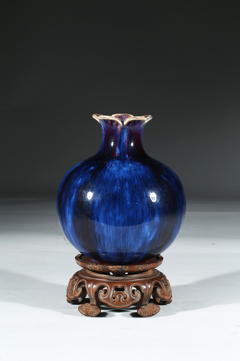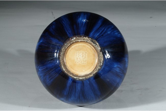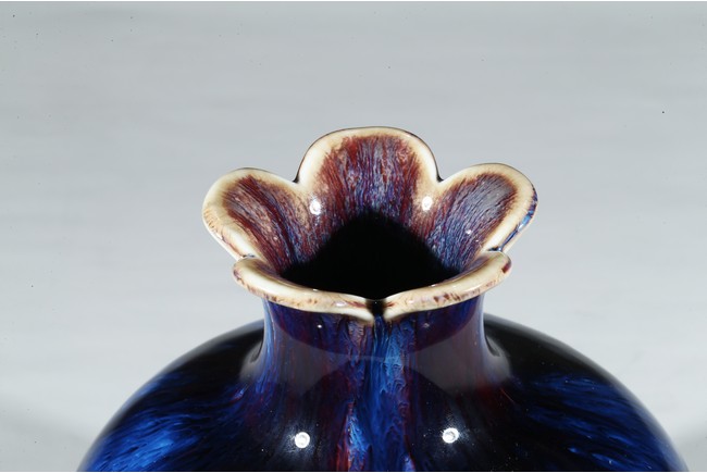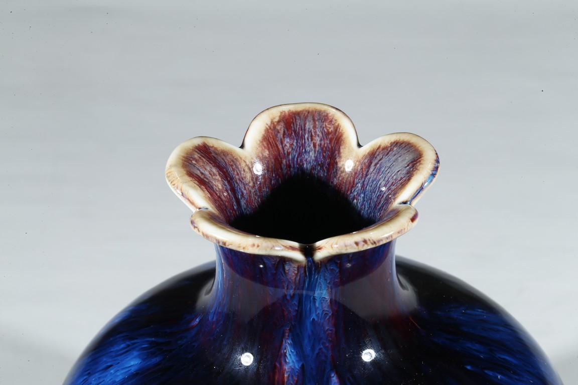 此尊花口翻沿,溜肩,圓腹下收,圈足。線條飽滿,造型端莊。全器滿施窯變釉,釉面晶瑩簡潔,紅藍暈散交融,給人一種變幻莫測、撲朔迷離之感,別具情趣。足底施醬黃色釉,底刻“雍正年製”款識。