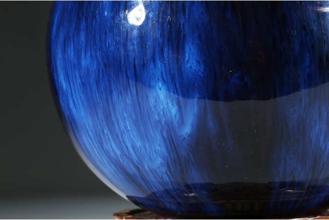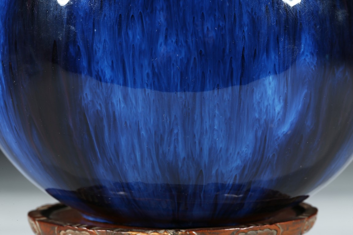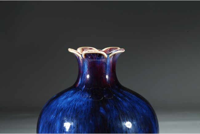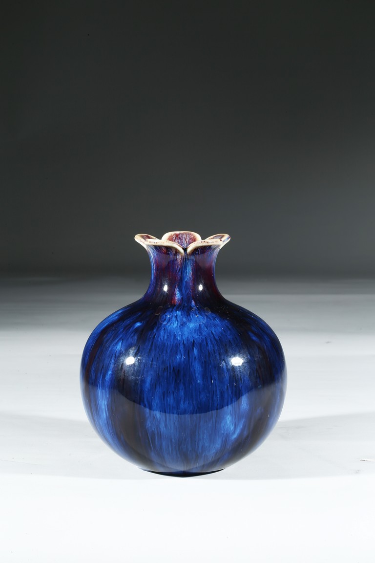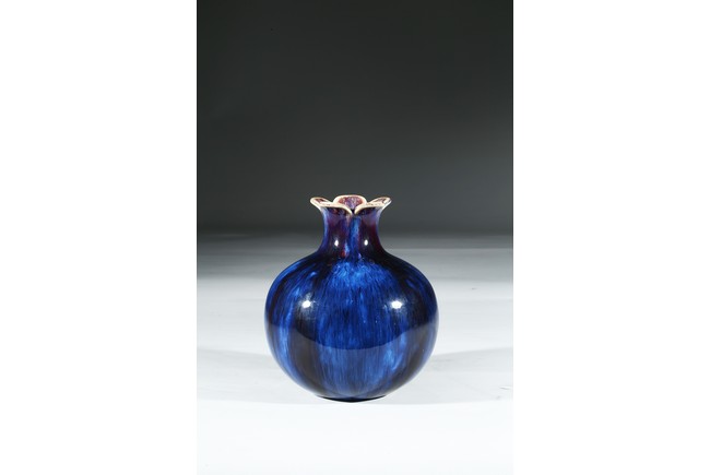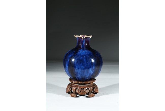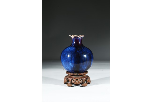 The vase is finely potted with a globular body rising to a waisted neck that supports a flared mouth in the form of five barbed sepals, the exterior is covered overall with a lustrous purplish blue glaze suffused with lavender streaks, the base inscribed with four character Qianlong mark. Qing Dynasty Qianlong mark.