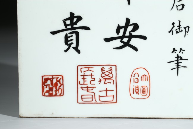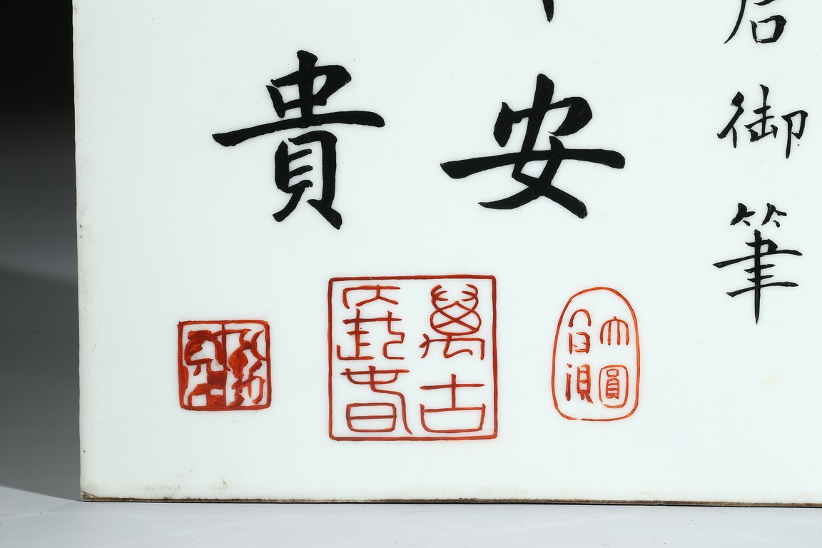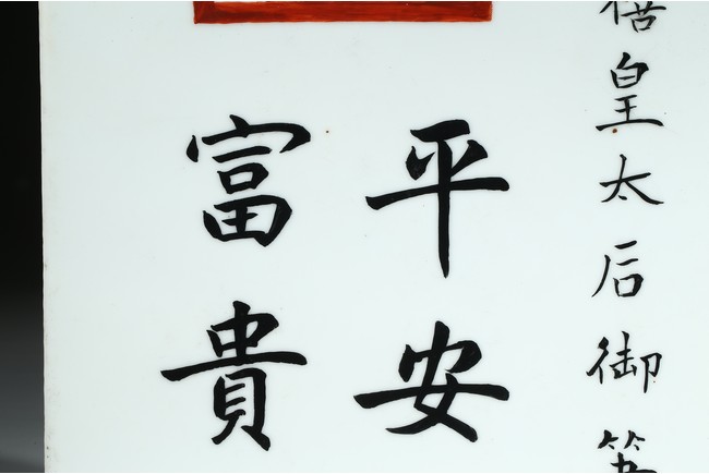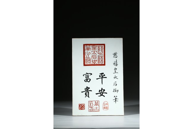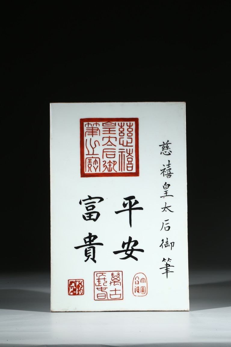 The rectangular porcelain panel enamelled with the four character Imperial inscription 'Fu Gui Ping An' by Empress Dowager with four seal marks. Qing Dynasty period.
