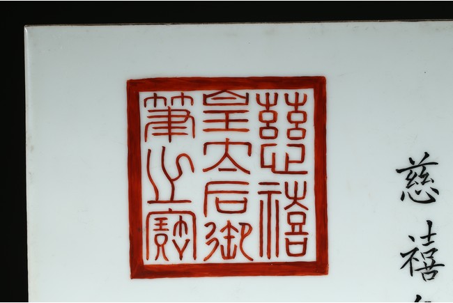 慈禧雅好文墨,偶事丹青,早為世人熟知,在瓷板寫作實為極其稀少難得。此作淋漓痛快,無扭捏做作之態,當系親筆所為。字蒼勁有力,雄強磅礴,密實惇厚,嚴守法度,勻稱有致,圓筆中鋒,收落皆藏之,韻潤內斂,端莊儒雅,拙而不板。題識:慈禧皇太后御筆;鈐印: “慈禧皇太后御筆之寶”;“萬古長春”。