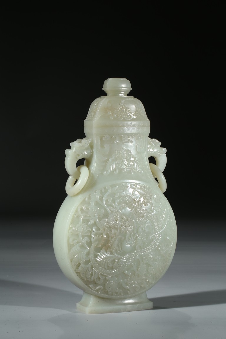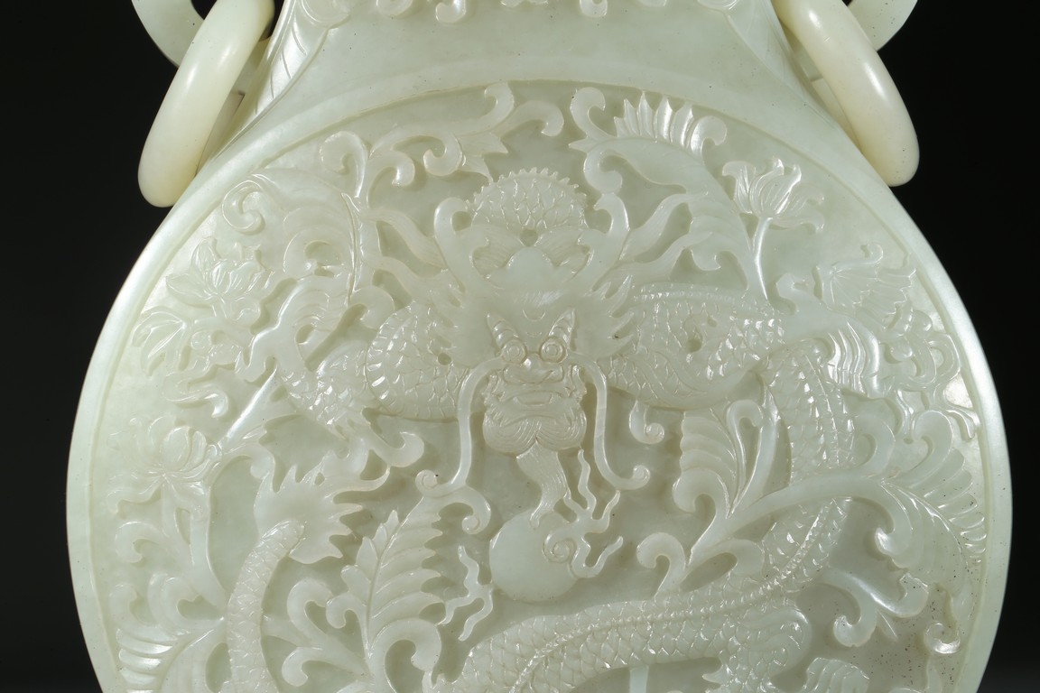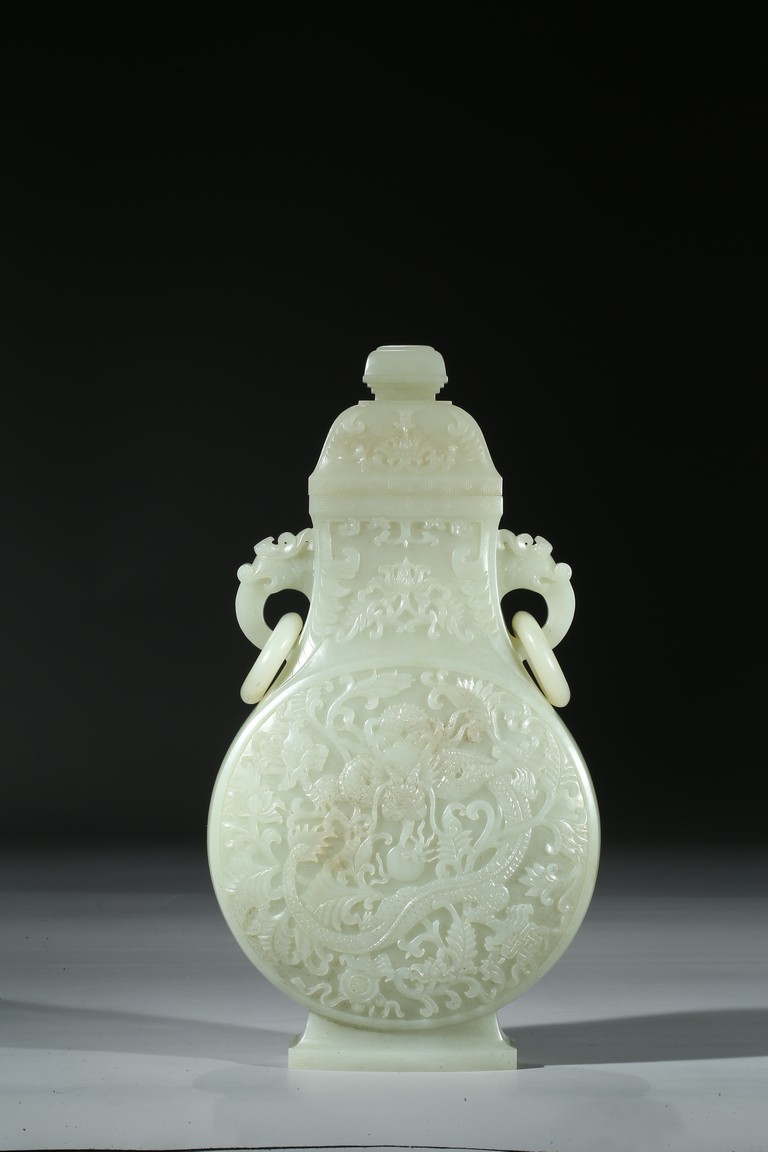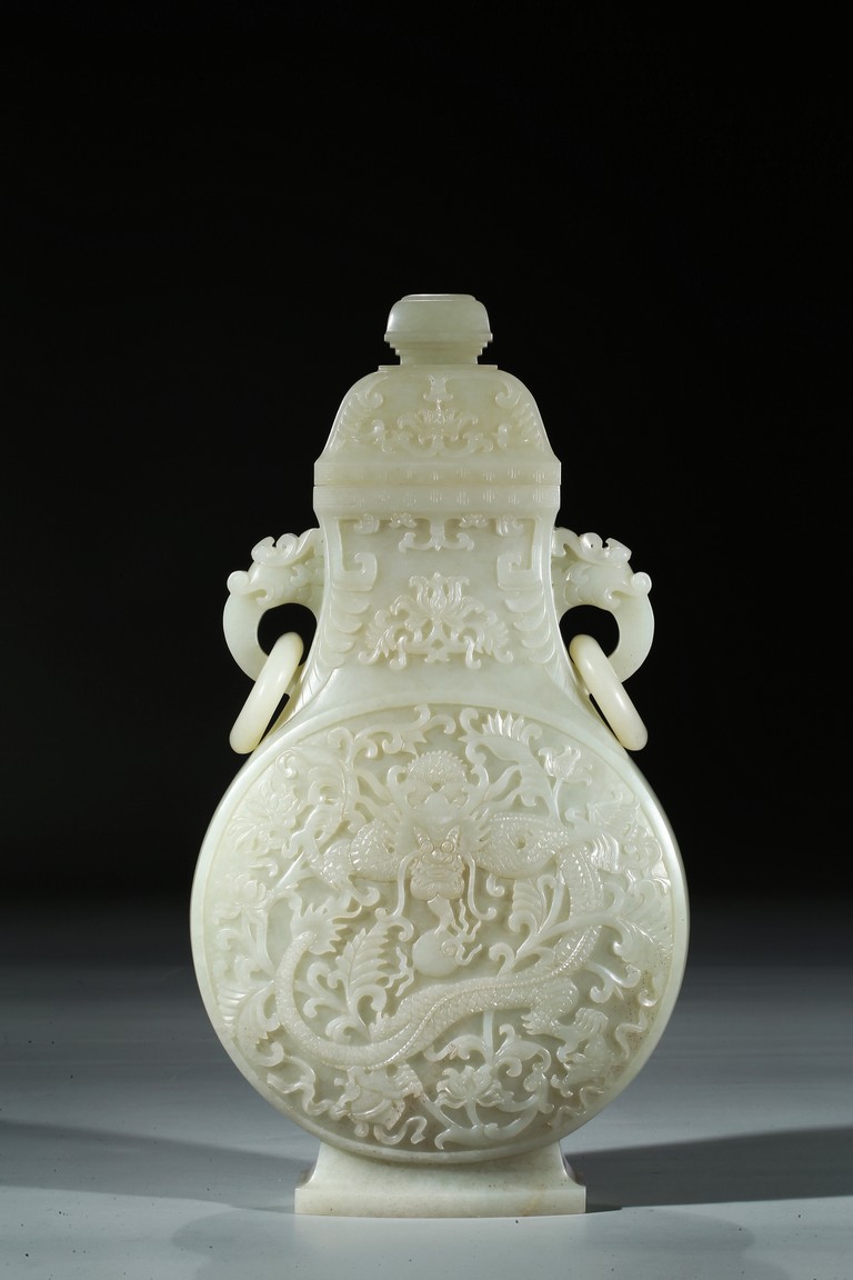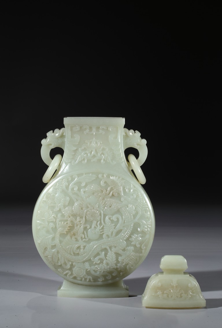 Provenance: Property from an important private collection, New York 八吉祥,原為佛前供器,藏文稱之為「八吉祥相」,即由法輪、法螺、寶傘、華蓋、蓮花、寶罐、金魚、盤長等八種法物組成。其中法輪代表佛說大法圓轉,萬劫不息;法螺代表菩薩果妙音吉祥;寶傘代表張弛自如,曲覆眾生;華蓋代表遍覆三千,淨一切樂;蓮花代表出五濁世無所染;寶罐代表福智圓滿,具完無漏;金魚代表堅固活潑,能解壞劫;盤長代表回環貫徹,一切通明。因為八吉祥寓意吉祥,清帝亦篤信佛教,而使此紋飾成為深受宮廷喜愛的經典裝飾題材。此瓶以白玉琢成,玉質溫潤。器身呈扁圓形,瓶頸兩側鏤雕獸首銜活環為耳,獸首呈扁而寬狀,自眼部向外有勾雲飛出,兩眼之間頂出一獨角,造型誇張。瓶腹兩面於圓形開光內高浮雕盤龍戲珠圖案,所刻花葉繁茂,寶傘、盤長、法輪、法螺、華蓋、金魚、寶罐、蓮花八種吉祥寶物分托雙龍龍爪之中,寓有八吉祥護身之意。此瓶為重要宮廷陳設用器,整器紋飾雕刻龍騰雲湧,給人以氣勢磅礴之感,皇家氣韻十足,為清代宮廷玉器登峰造極之作。類似大小和器型之白玉瓶,可參考紐約大都會藏品。參考: 香港佳士得2011年11月30日 拍品號2971 成交價HKD 33,140,000 來源: 紐約重要私人藏家收藏