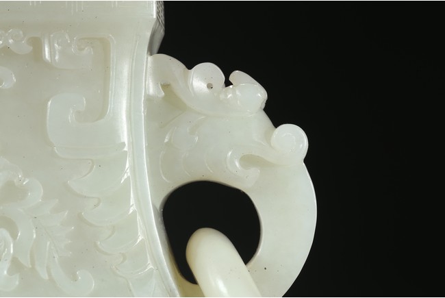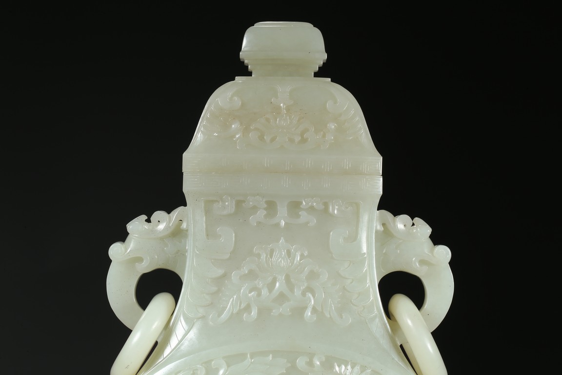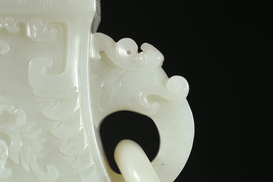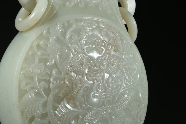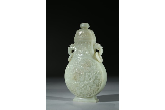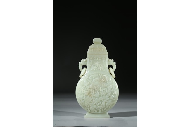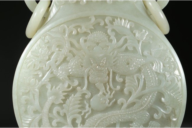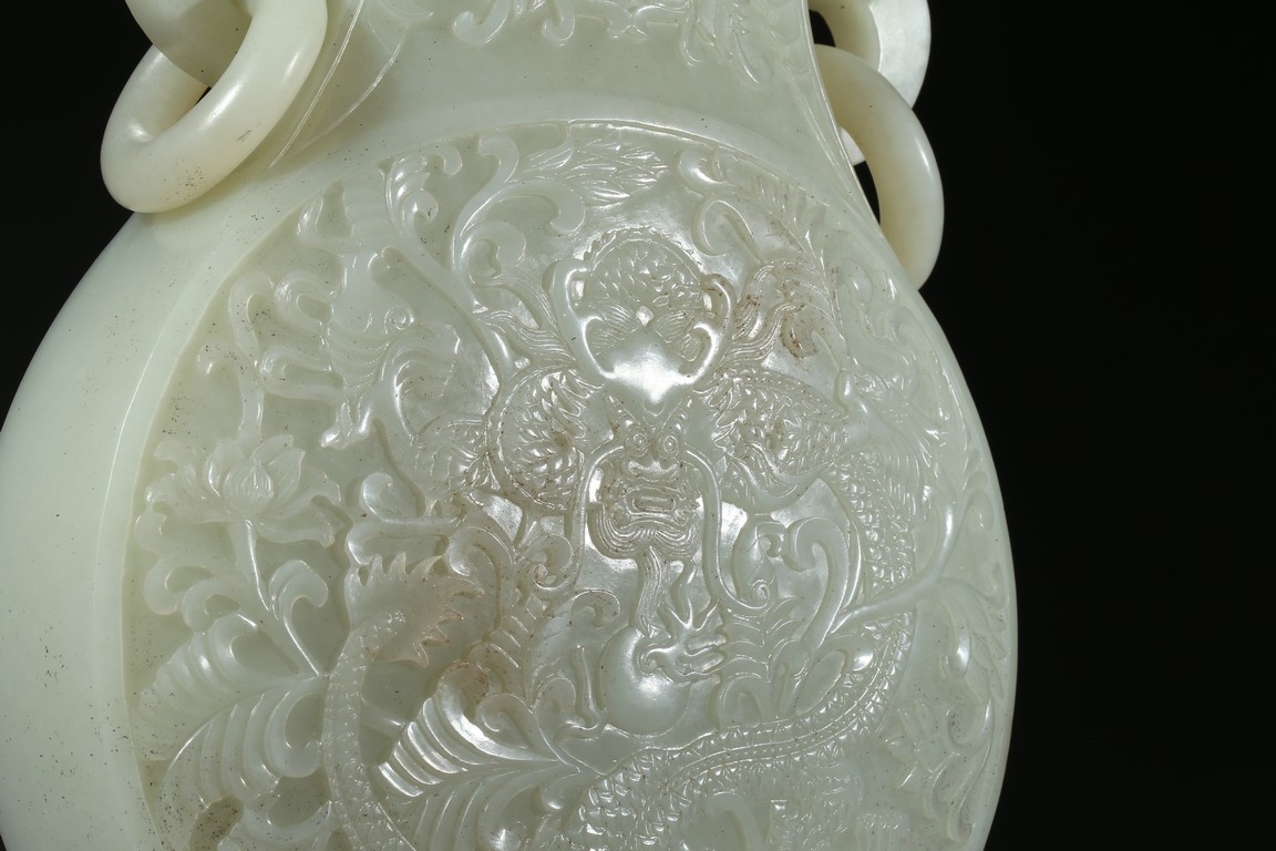 Provenance: Property from an important private collection, New York 八吉祥,原為佛前供器,藏文稱之為「八吉祥相」,即由法輪、法螺、寶傘、華蓋、蓮花、寶罐、金魚、盤長等八種法物組成。其中法輪代表佛說大法圓轉,萬劫不息;法螺代表菩薩果妙音吉祥;寶傘代表張弛自如,曲覆眾生;華蓋代表遍覆三千,淨一切樂;蓮花代表出五濁世無所染;寶罐代表福智圓滿,具完無漏;金魚代表堅固活潑,能解壞劫;盤長代表回環貫徹,一切通明。因為八吉祥寓意吉祥,清帝亦篤信佛教,而使此紋飾成為深受宮廷喜愛的經典裝飾題材。此瓶以白玉琢成,玉質溫潤。器身呈扁圓形,瓶頸兩側鏤雕獸首銜活環為耳,獸首呈扁而寬狀,自眼部向外有勾雲飛出,兩眼之間頂出一獨角,造型誇張。瓶腹兩面於圓形開光內高浮雕盤龍戲珠圖案,所刻花葉繁茂,寶傘、盤長、法輪、法螺、華蓋、金魚、寶罐、蓮花八種吉祥寶物分托雙龍龍爪之中,寓有八吉祥護身之意。此瓶為重要宮廷陳設用器,整器紋飾雕刻龍騰雲湧,給人以氣勢磅礴之感,皇家氣韻十足,為清代宮廷玉器登峰造極之作。類似大小和器型之白玉瓶,可參考紐約大都會藏品。參考: 香港佳士得2011年11月30日 拍品號2971 成交價HKD 33,140,000 來源: 紐約重要私人藏家收藏