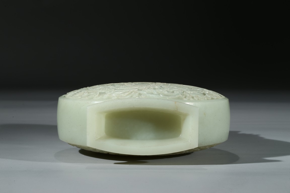 Of flattened globular form, well carved on each side with a frontal five-clawed dragon, its sinuous body wrapped around a 'flaming pearl', leaping amongst lotus scrolls and the eight auspicious motifs, the waisted neck adorned with stylised floral and foliate designs, flanked by a pair of dragon ring handles, the domed cover surmounted by a stepped rounded oval finial, the stone of an even white tone with natural inclusions. Qing Dynasty Qianlong period.