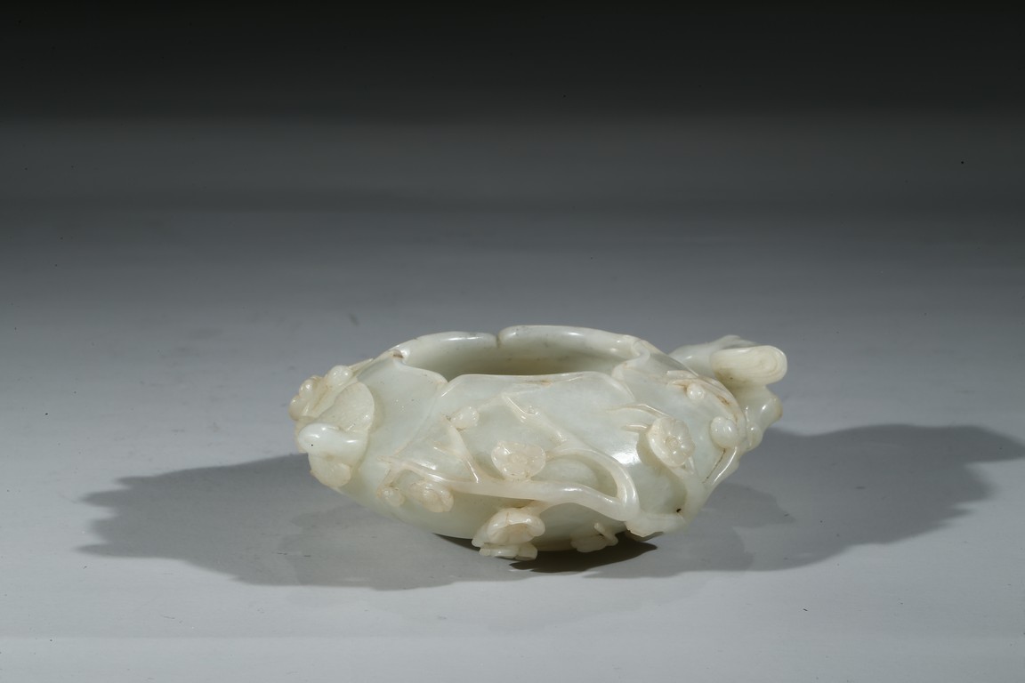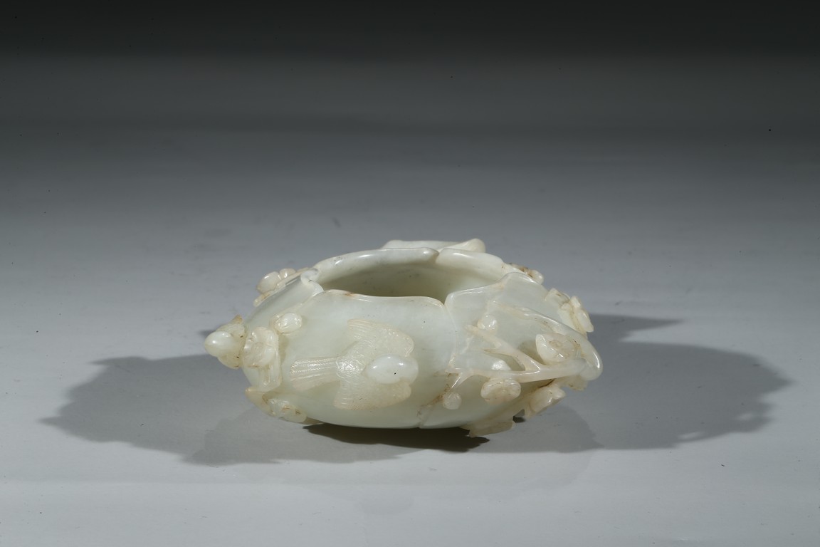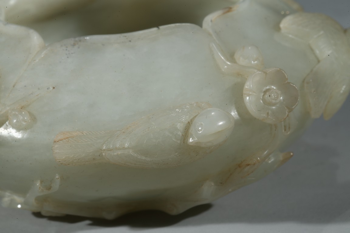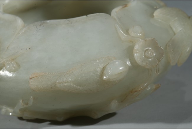 筆洗取整料雕琢而成, 玉質細膩溫潤,包漿自然。器壁挖膛均勻, 洗內深腹。筆洗敞口, 口沿圓潤, 以隨形根枝作柄, 另琢梅花、枝幹, 以數隻喜鵲盤旋其間。古人以喜鵲作為喜慶的象徵, 古人常以梅花諧音“ 眉”字, 畫喜鵲站於梅花枝幹, 即組成了“ 喜上眉梢”的吉祥圖案,廣為流傳。