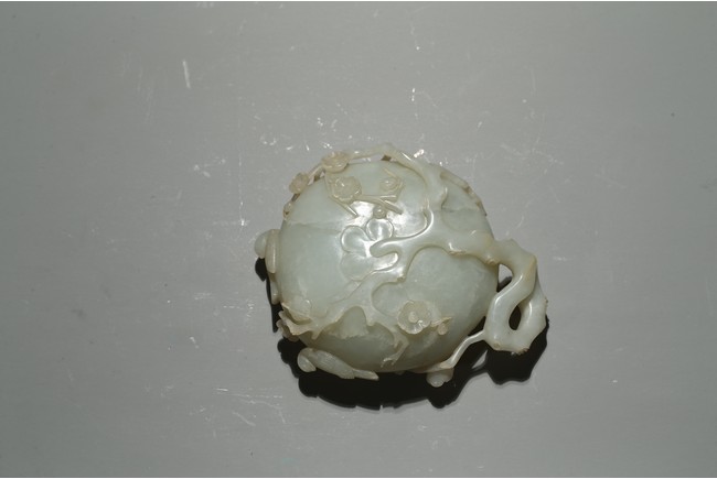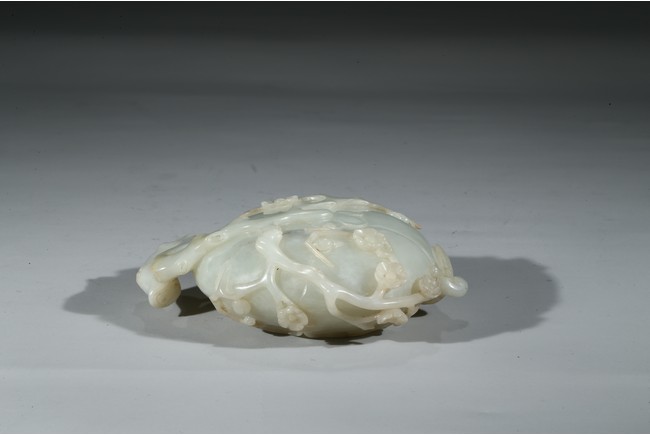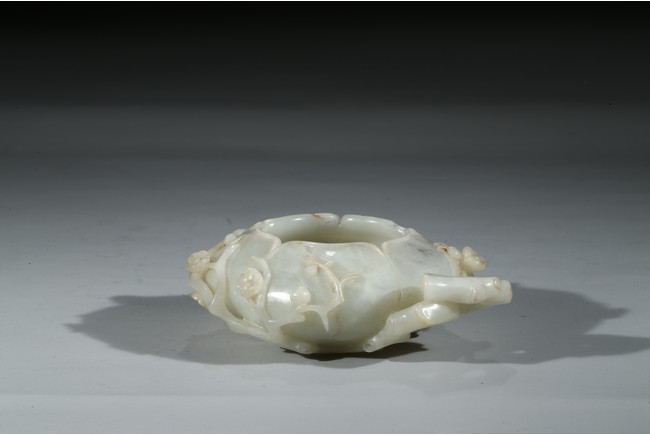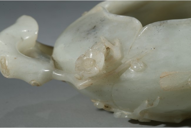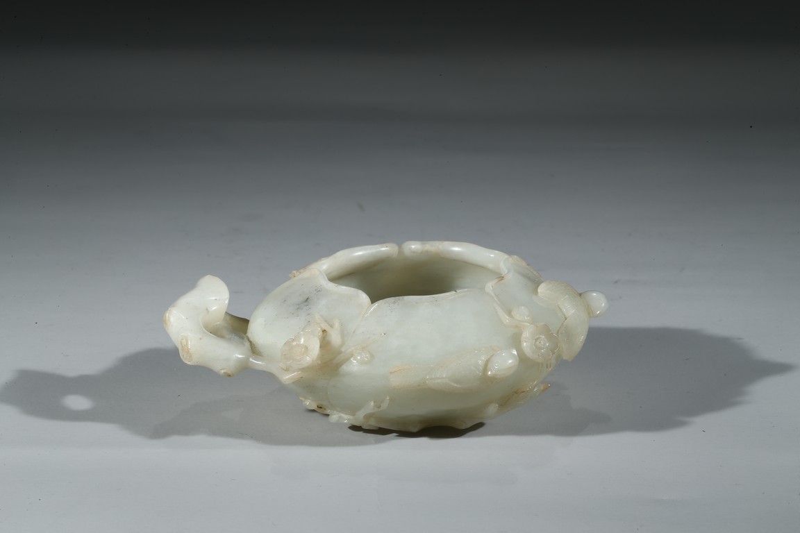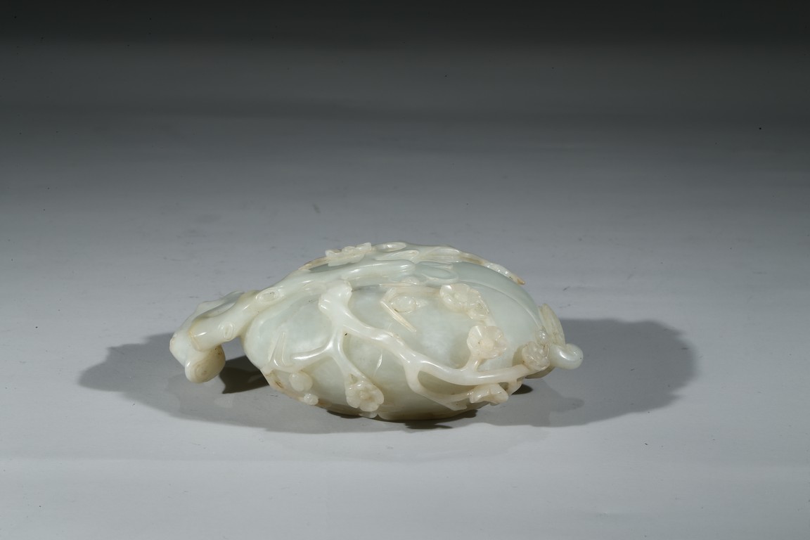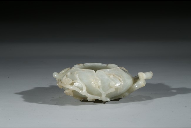 筆洗取整料雕琢而成, 玉質細膩溫潤,包漿自然。器壁挖膛均勻, 洗內深腹。筆洗敞口, 口沿圓潤, 以隨形根枝作柄, 另琢梅花、枝幹, 以數隻喜鵲盤旋其間。古人以喜鵲作為喜慶的象徵, 古人常以梅花諧音“ 眉”字, 畫喜鵲站於梅花枝幹, 即組成了“ 喜上眉梢”的吉祥圖案,廣為流傳。