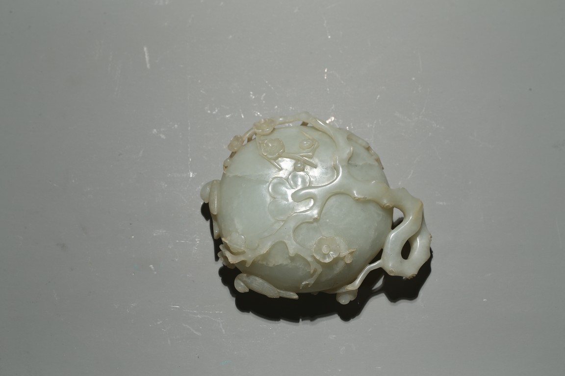 Carved in the form of furled lotus-leaf shape, the exterior carved in high relief with a plum blossom and a magpie in flight. Qing Dynasty period.