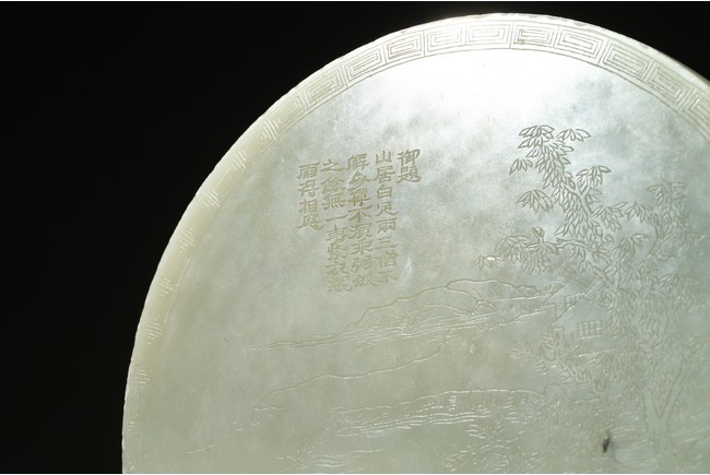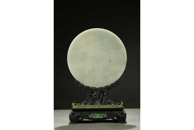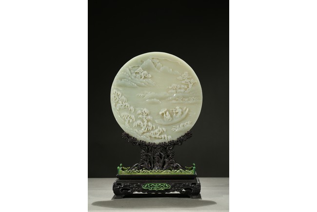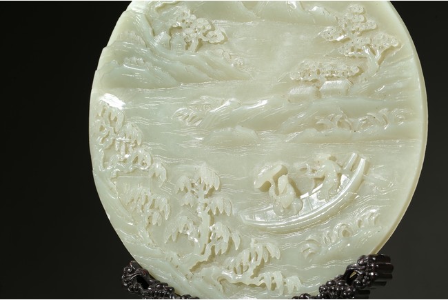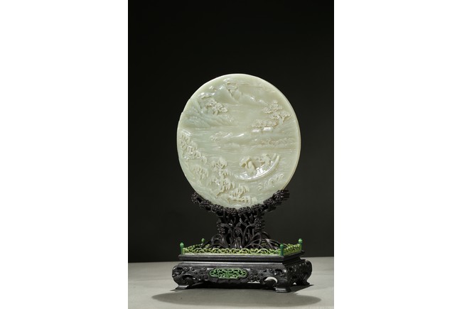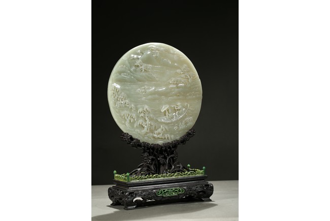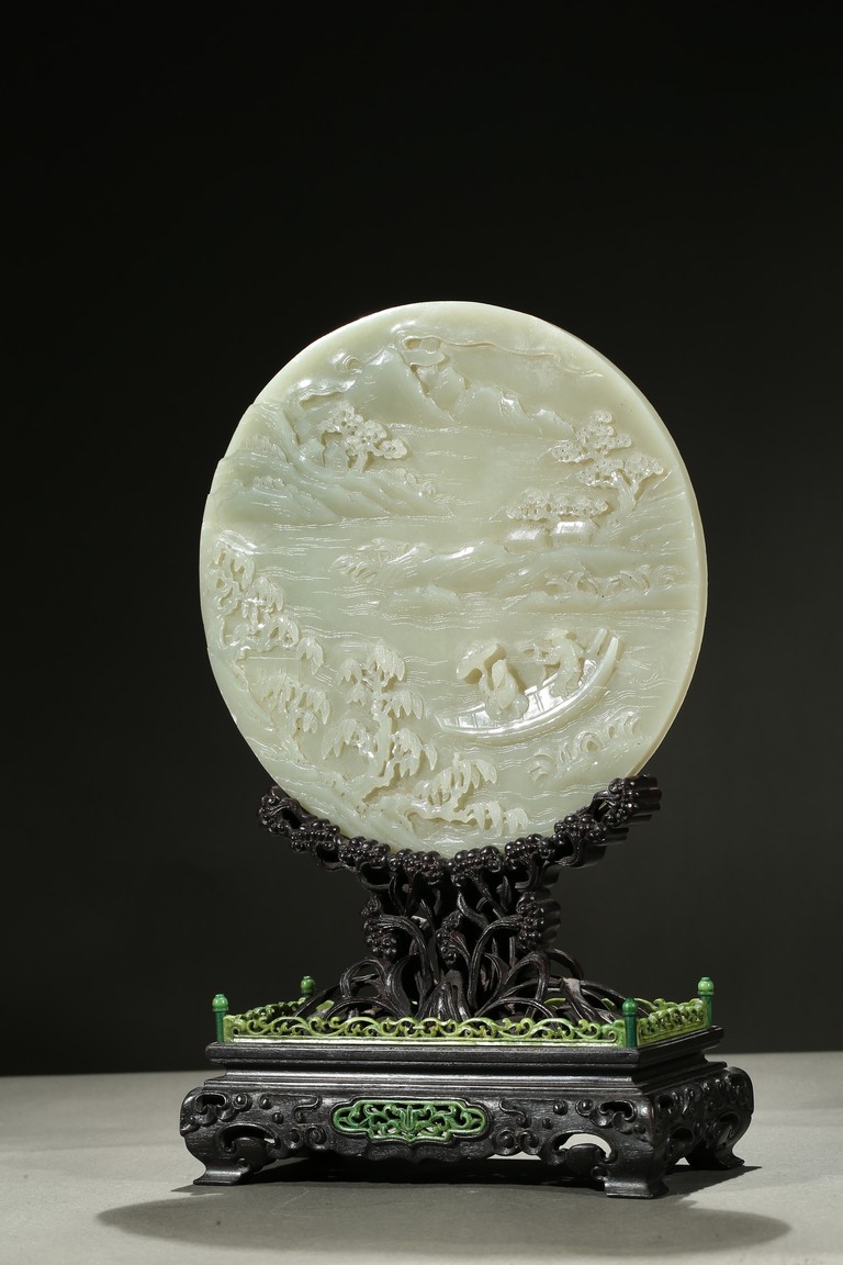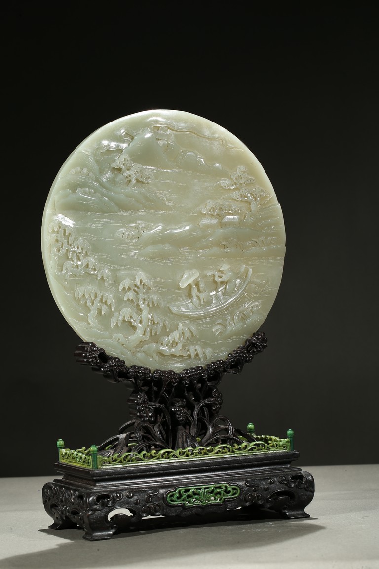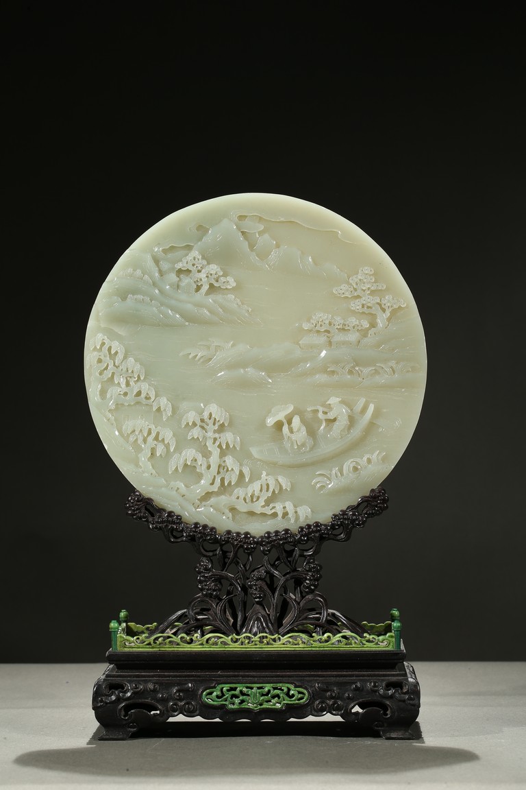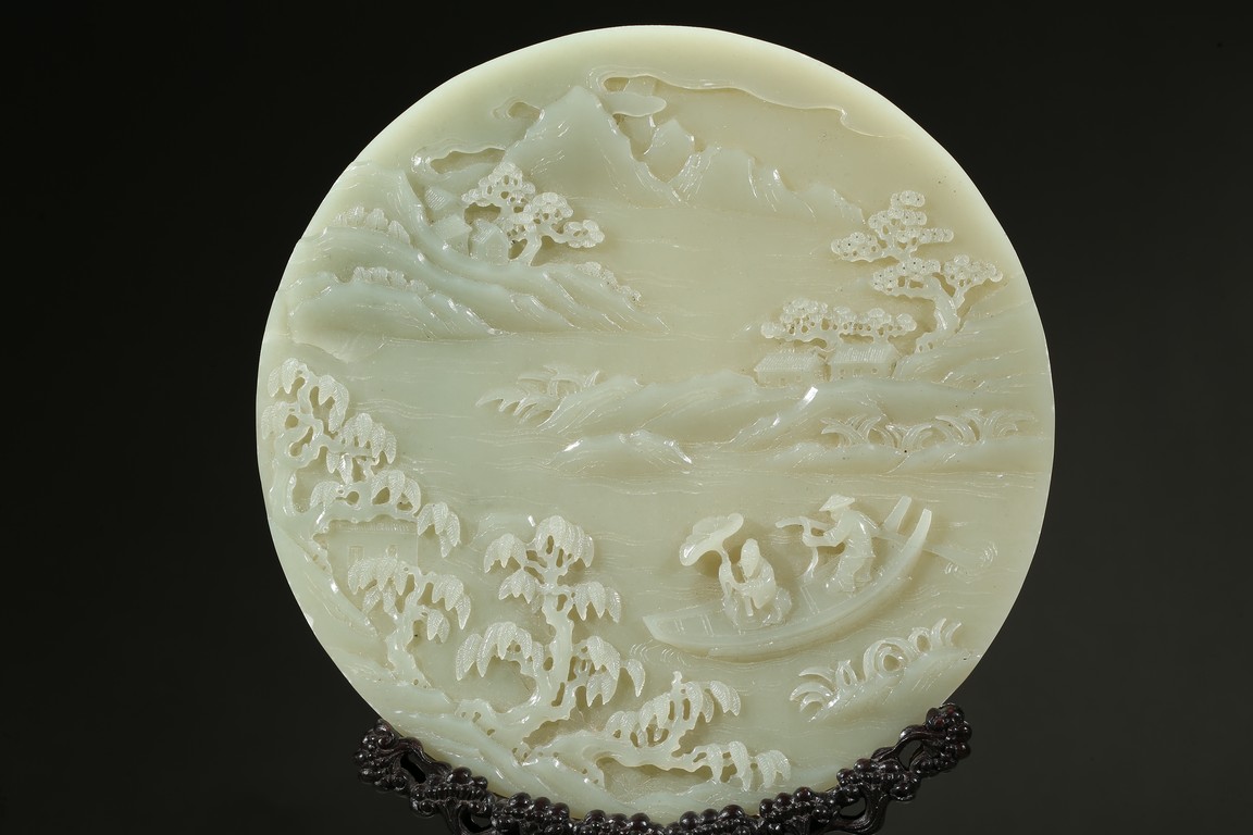 Of circular form, carved on one side in shallow relief with a scene of two figures on a small boat in a lakeside landscape setting, the scene framed by mountains and clouds, the reverse finely incised with a scene of village riverscape and an Imperial poem, all supported on elaborately carved zitan stand. Qing Dynasty period.