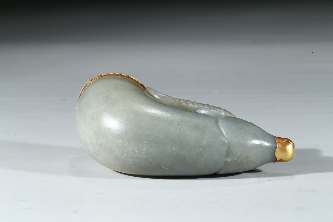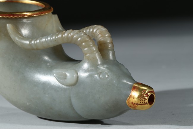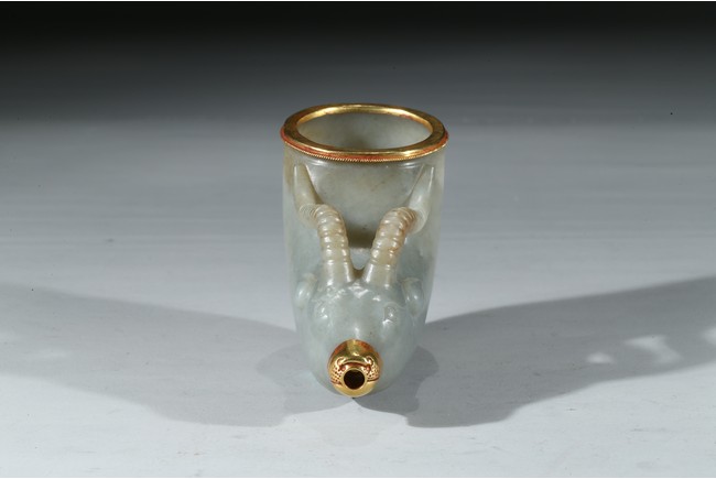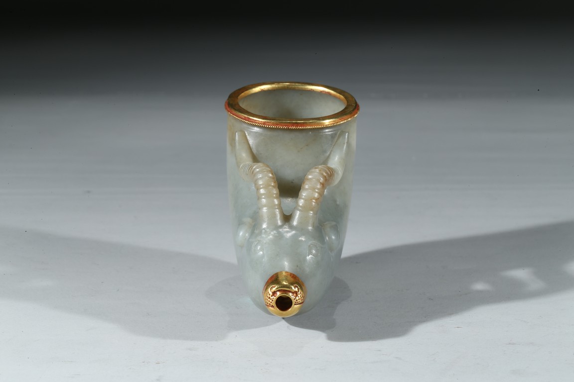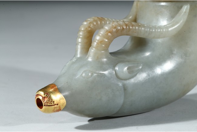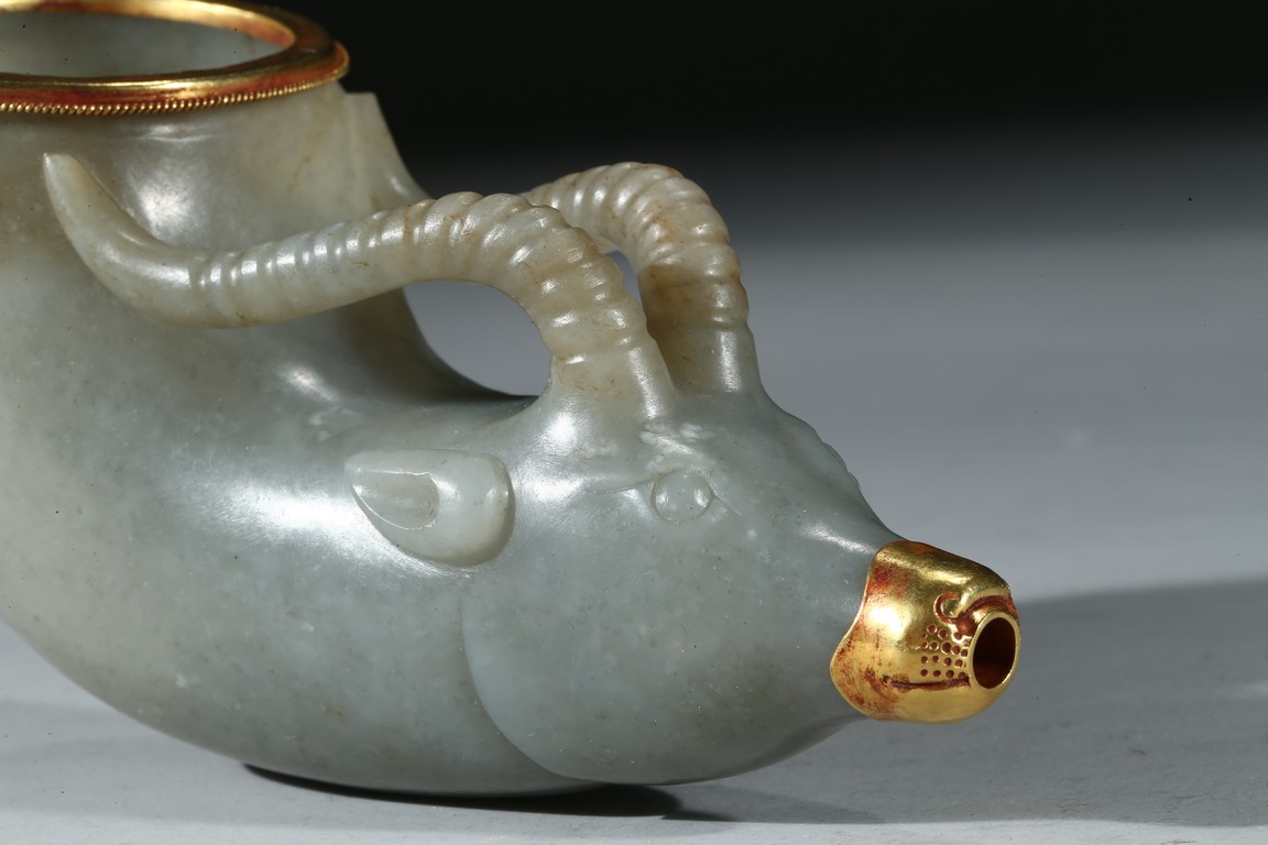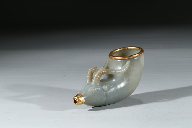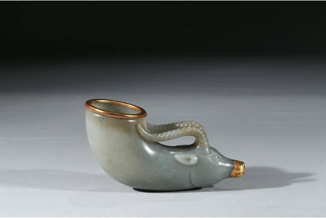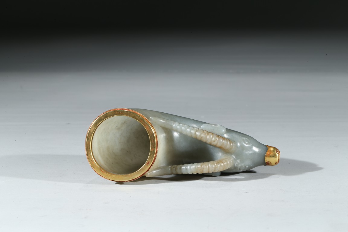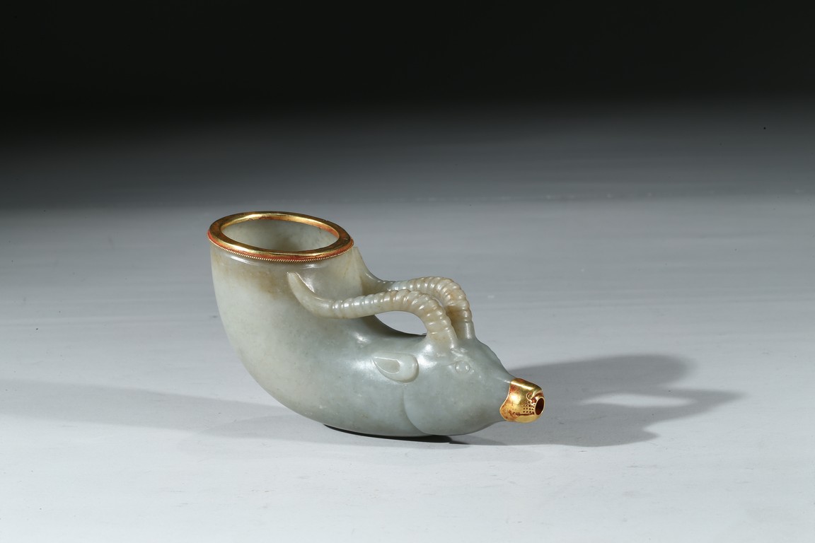 兕觥是中國古代盛酒或飲酒器,或兩軍盟誓及國禮大典時用之禮器,盛行商和西周前期。此件兕觥為清代仿古器型,用青白玉製作而成,玉質溫潤細膩,晶瑩潤澤。器呈牛角狀,器首為圓雕羊頭,眼瞪大如鈴,羊角向後豎立,雙耳緊貼部,威猛霸氣。器口部鑲足金,此器端莊大氣,構思巧妙,工藝精湛,實屬難得。