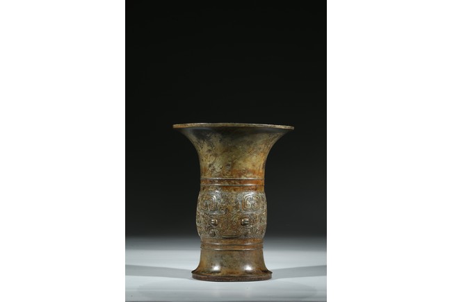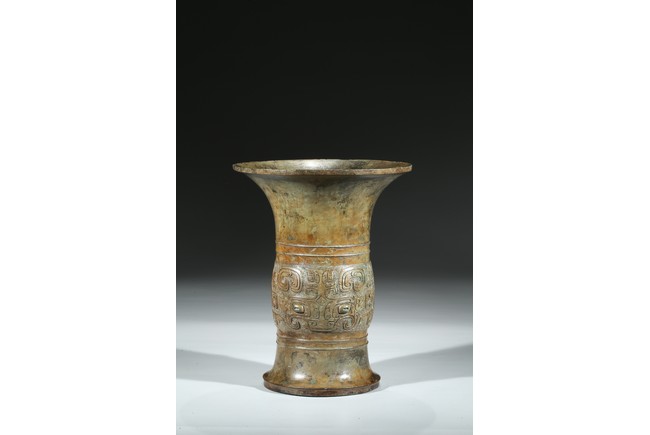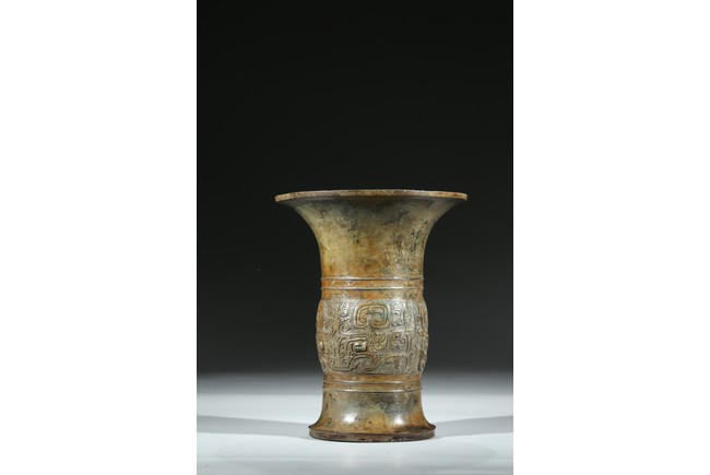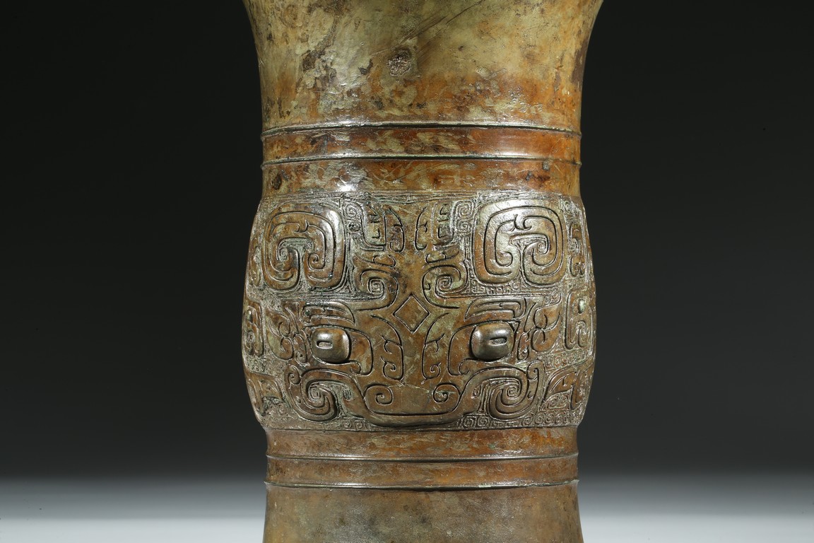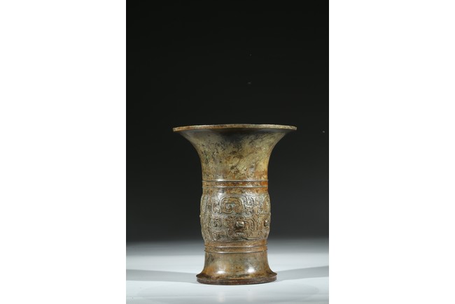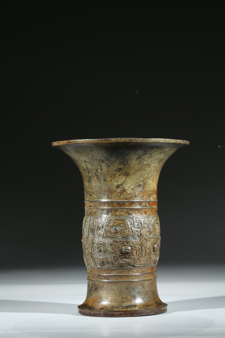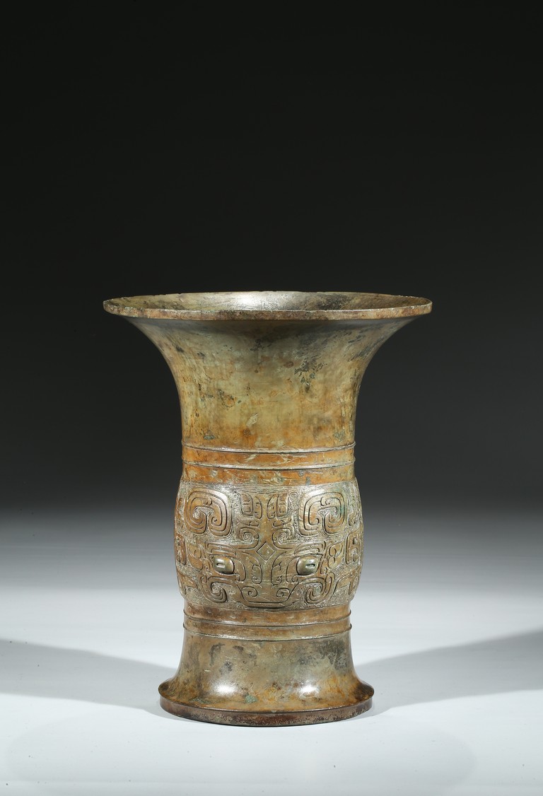 Provenance: Property from an important private collection, New York 《說文》:「尊,酒器也,從酋,廾以奉之。」尊是一種盛酒器,流行於商周時期,由史料文獻可知尊既是生活用具,同時也作為禮器,對於古代的社會和政治具有重要意義。此青銅尊製作精細,器表通體呈褐色,局部偶有綠綉,造型完整而典雅。侈口, 上部光素,近頸部下方有著兩條明顯的弦紋。腹部微微鼓出,弦紋之間前後兩面飾饕餮紋。 底部鑄有銘文六字,待考。青銅尊作為青銅器中的典型作品,其審美價值是無與倫比的。此件青銅饕餮纹尊造型飽滿穩定,裝飾細緻,曲線流暢,曲直相對,收張相合,使人在平和中亦能感受到線條的律動,精湛的工藝顯示其重要的藝術及收藏價值。 來源: 紐約重要私人藏家收藏
