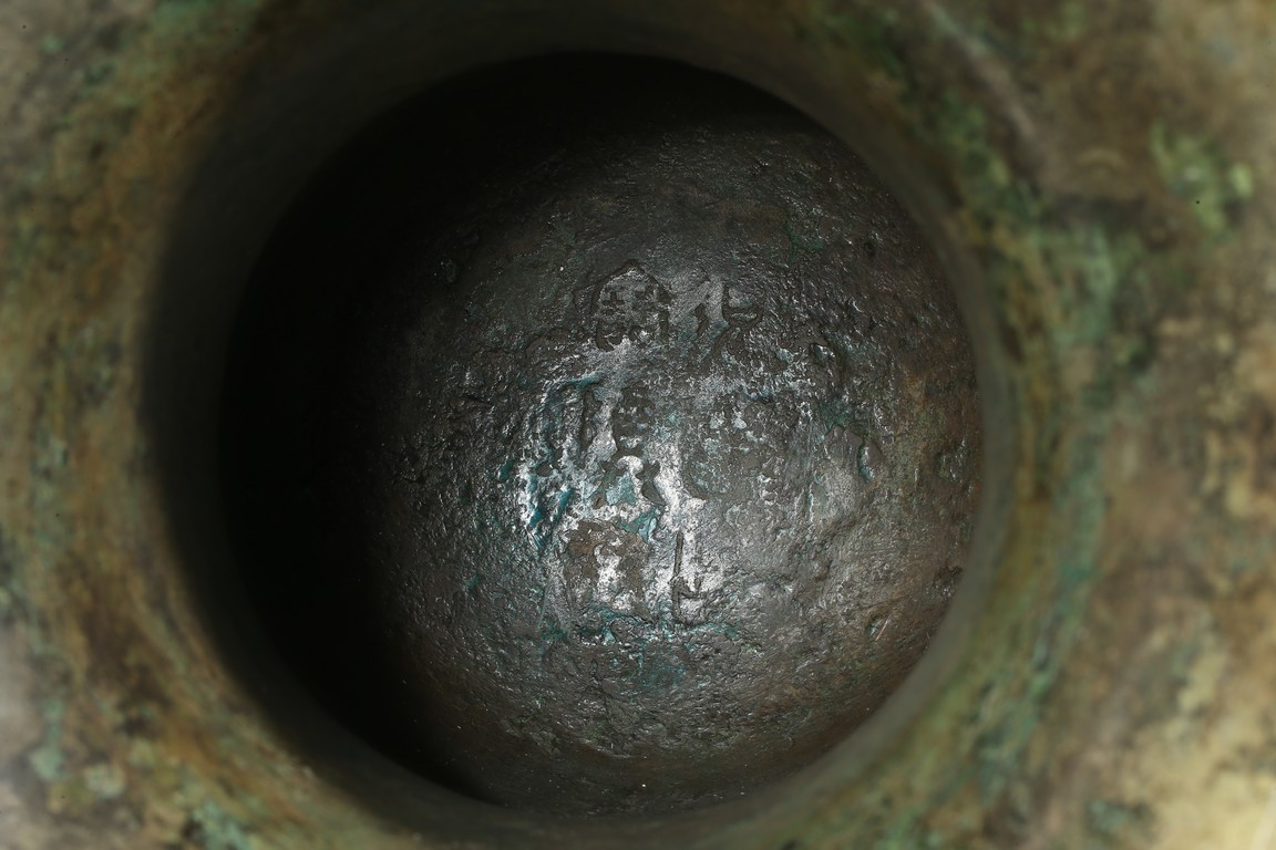 The central bulb cast in relief with a pair of taotie masks with bulging eyes among scrollwork decorations, set between a pair of raised lines on tall flaring neck and spreading foot cast, the bronze with the patina of warm greenish brown tone, the interior of the base cast with six characters. Western Zhou Dynasty period.