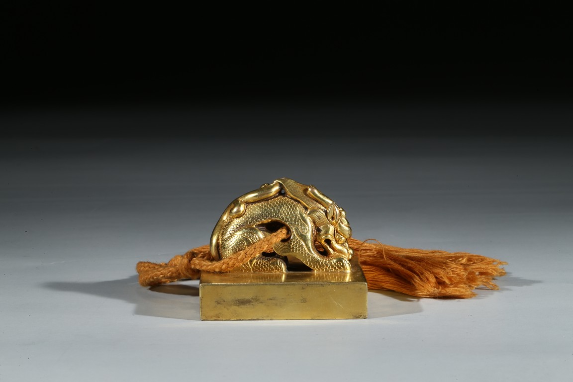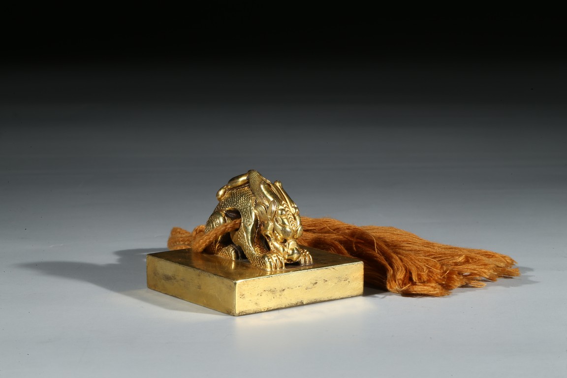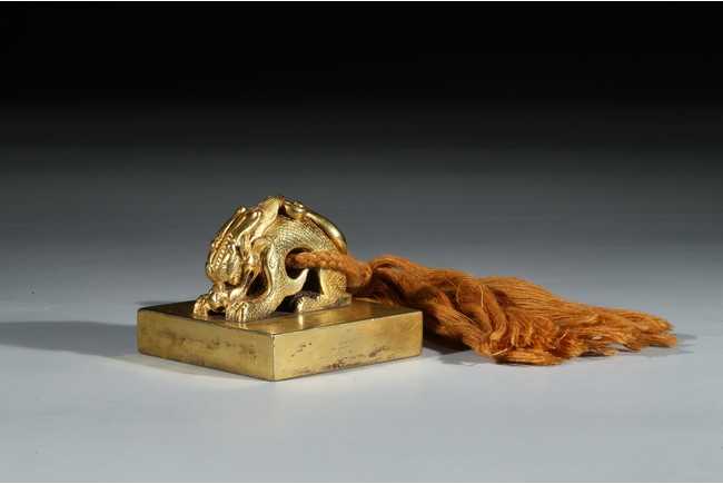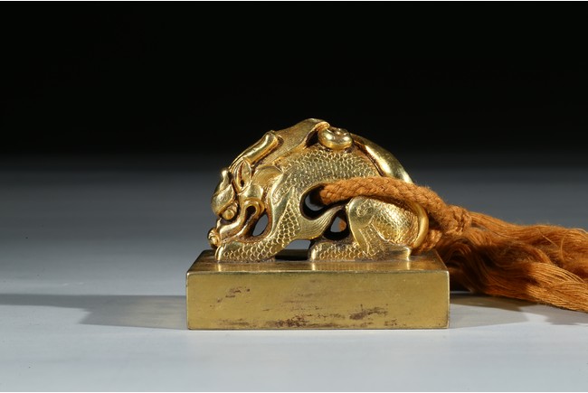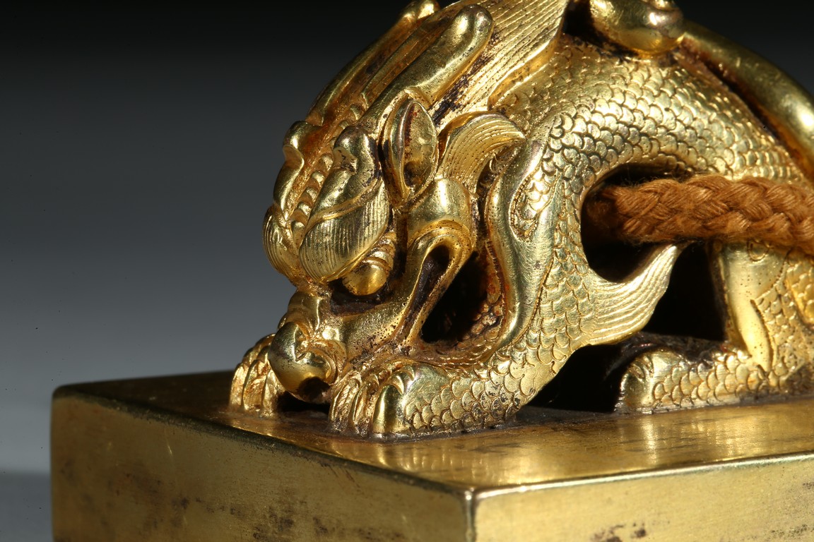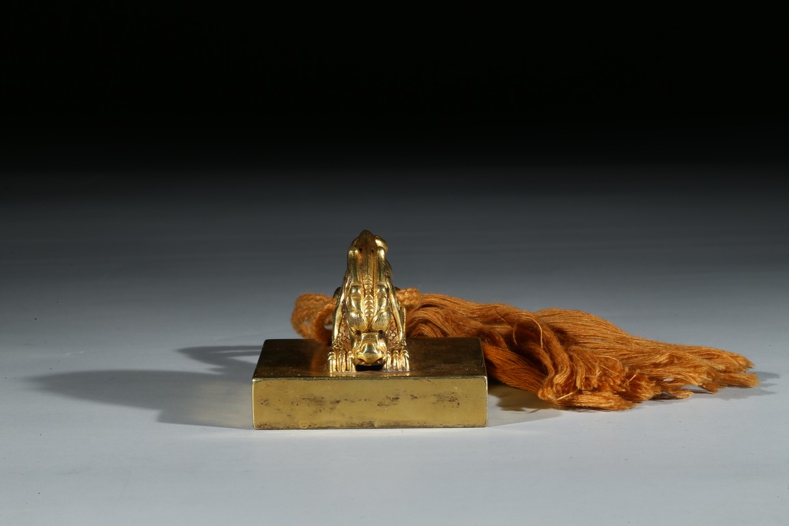 Of square section, the seal surmounted with a finely cast recumbent mythical beast, the head facing downward, protruding eyes and prominent snout, with incised mane and split tail, scaly body. The seal base cast with four character inscription. Ming Dynasty period.