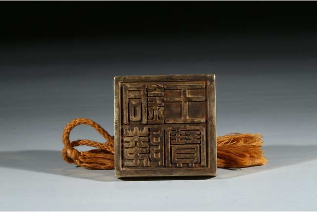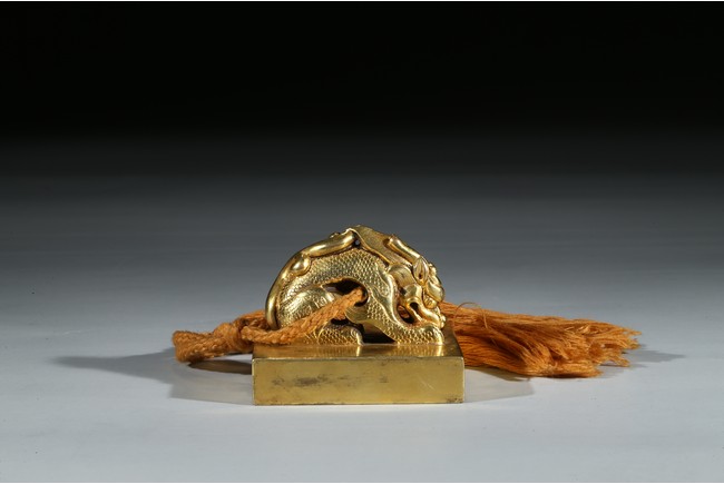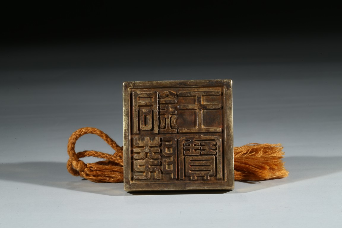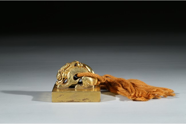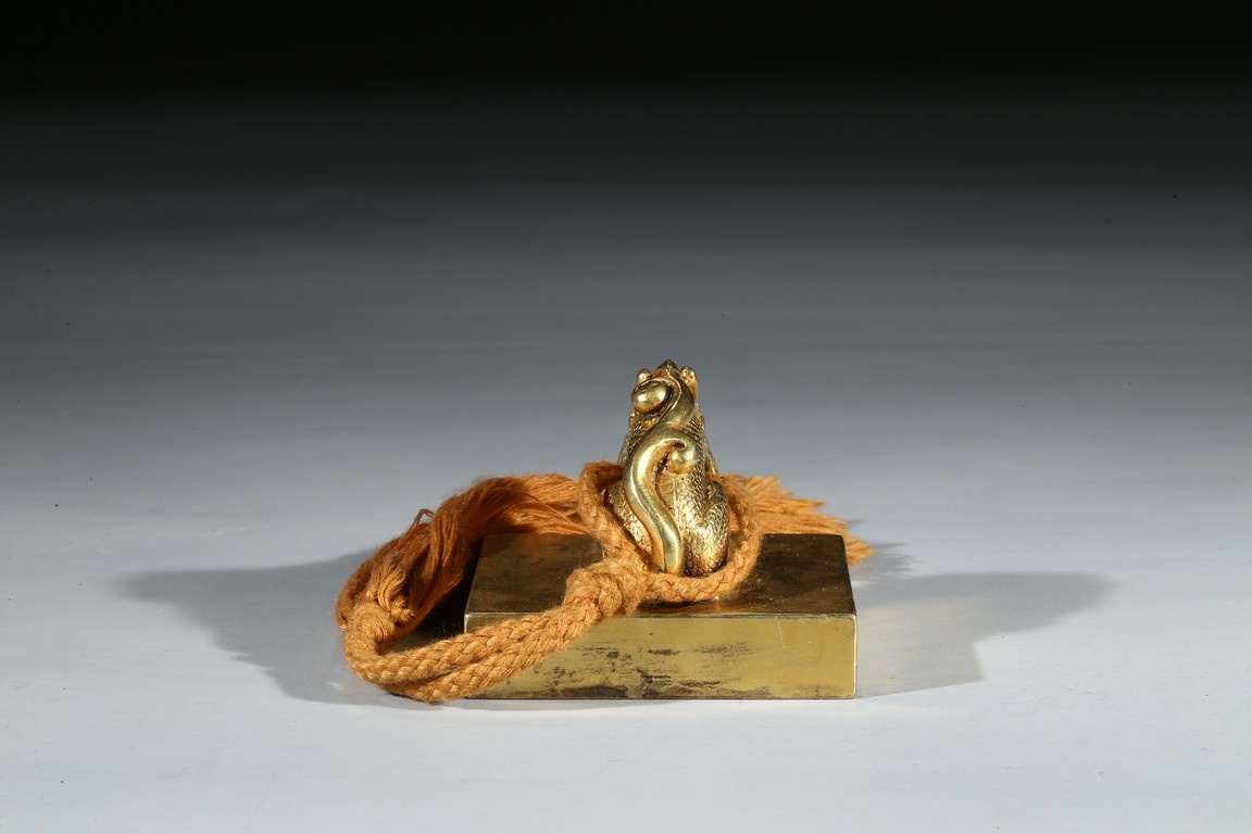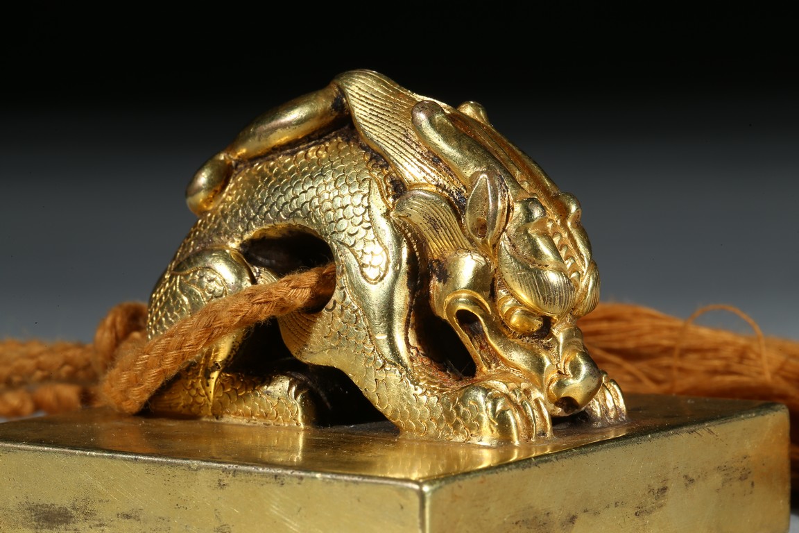 Of square section, the seal surmounted with a finely cast recumbent mythical beast, the head facing downward, protruding eyes and prominent snout, with incised mane and split tail, scaly body. The seal base cast with four character inscription. Ming Dynasty period.