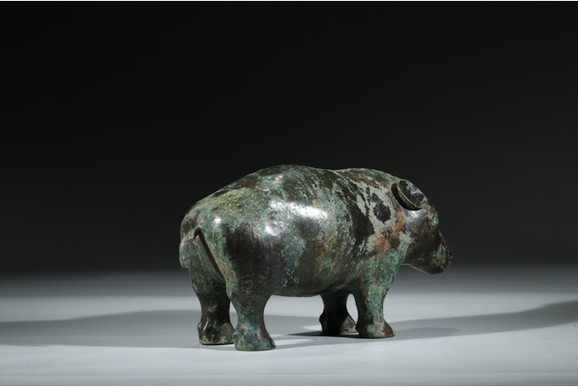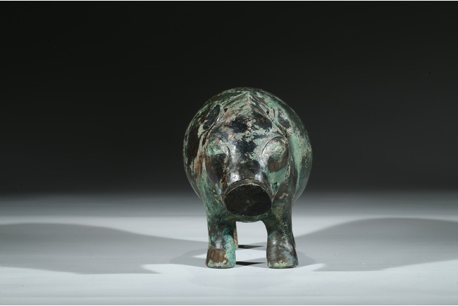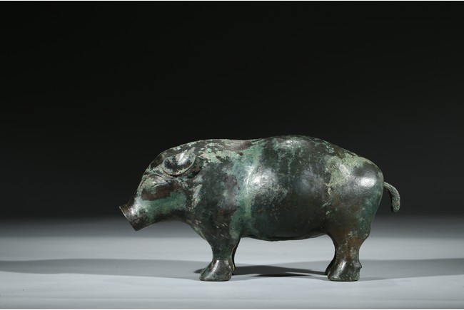 Naturalistically modelled as a pig standing four-square without a base, the head facing forward with large snout, the floppy ears slightly lifted, the bronze covered with green malachite encrustation. Han Dynasty period or later.