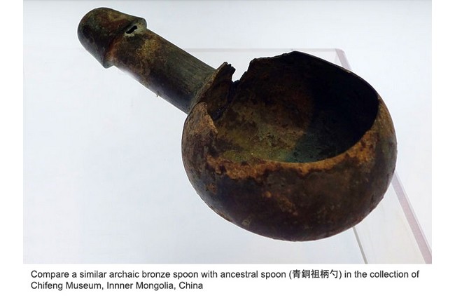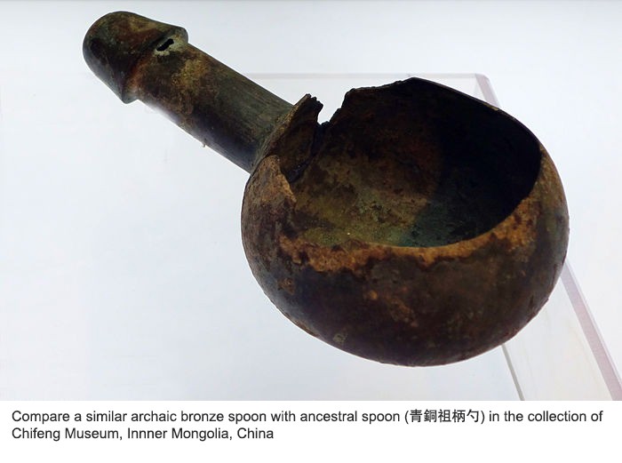 Reference: Warring State Period Bronze spoon with ancestral handle excavated in Inner Mongolia, China. Permanent collection of Chi Feng Museum, Inner Mongolia. Provenance: Property from a private collection, Toronto, Canada 參考: 内蒙古赤峰博物馆藏戰國祖柄青銅勺 來源: 加拿大多倫多私人藏家收藏