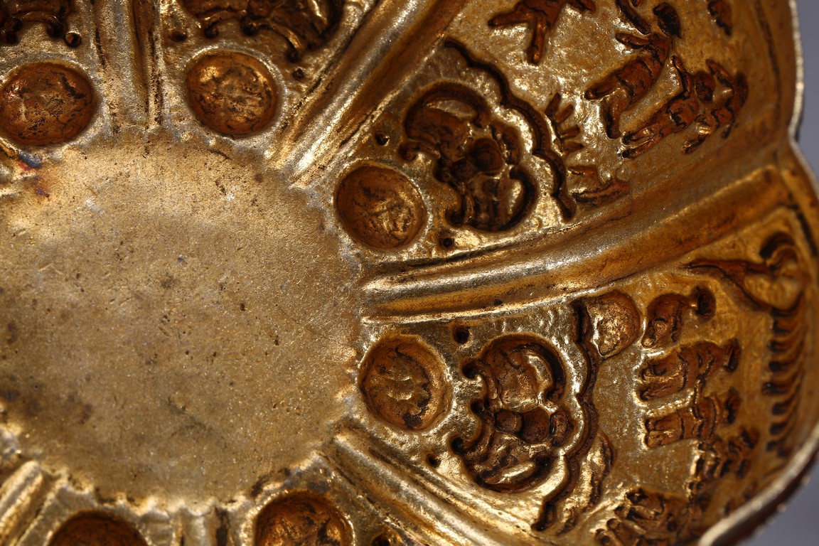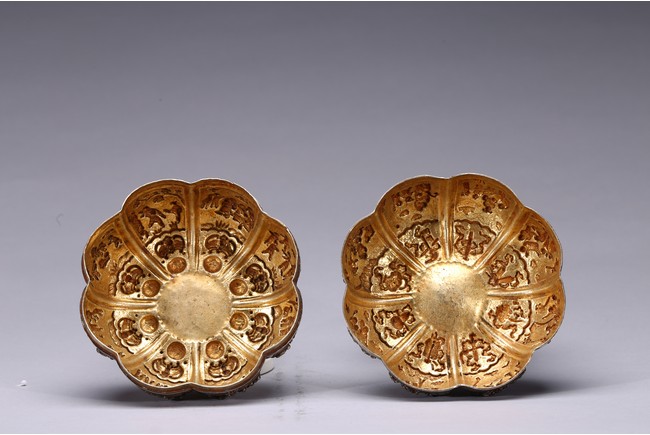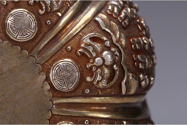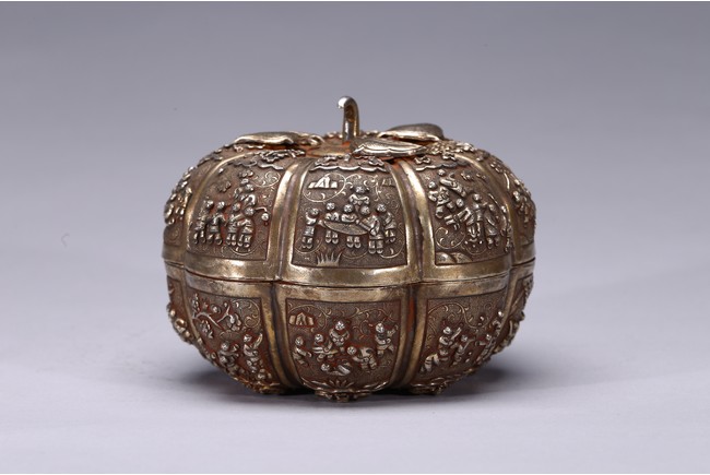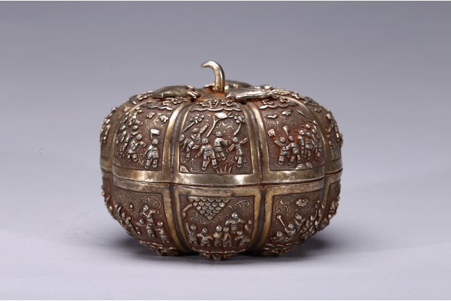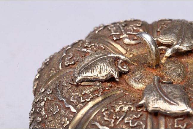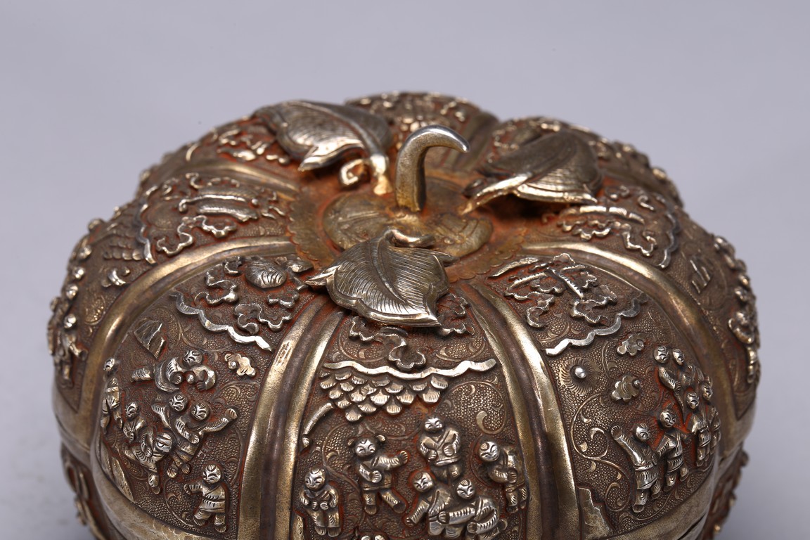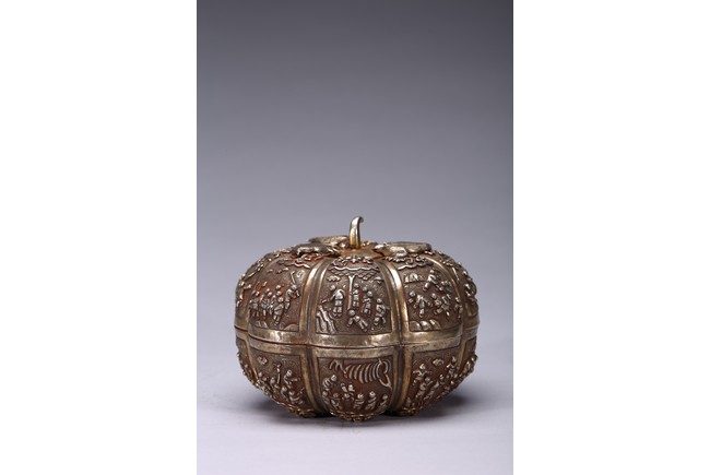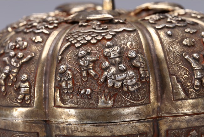 Modelled in the form of pumpkin with eight lobes, the exterior moulded in repousse in each section depicting boys engaging in various leisurely activities above a bat above shou medallion, the cover top modelled with leaves and stem as finial. Qing Dynasty period.