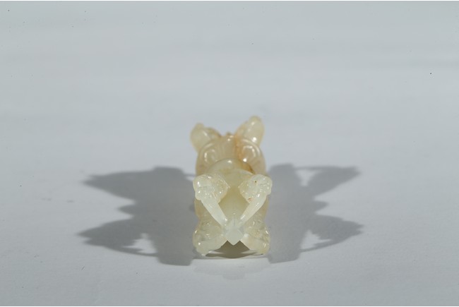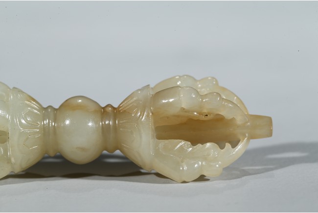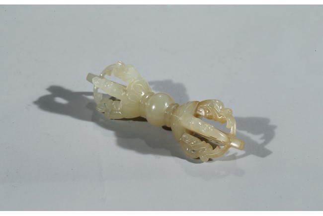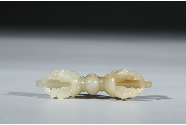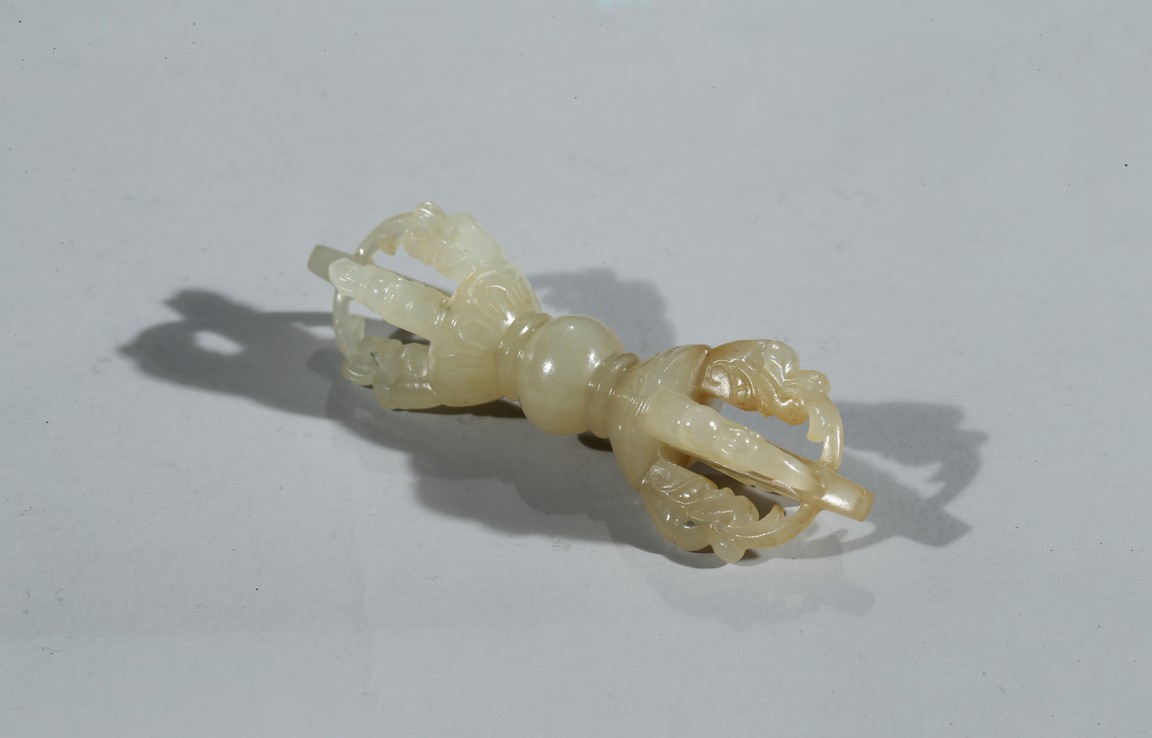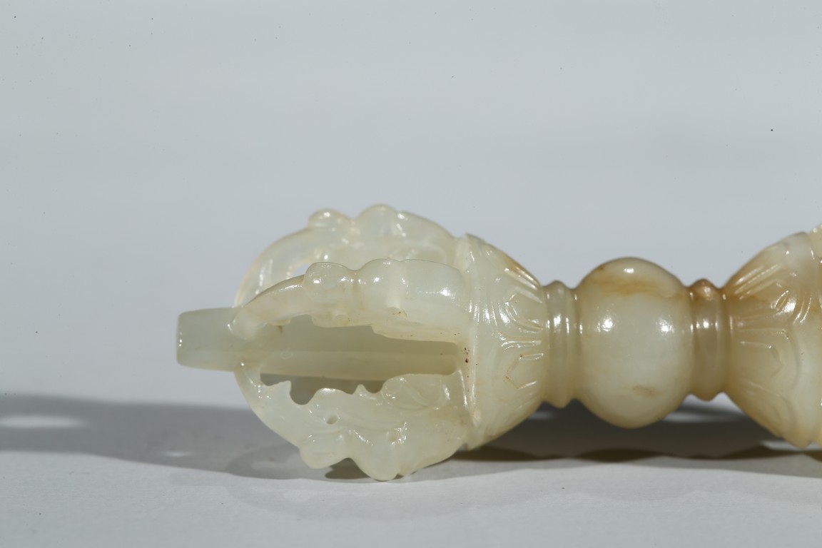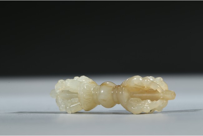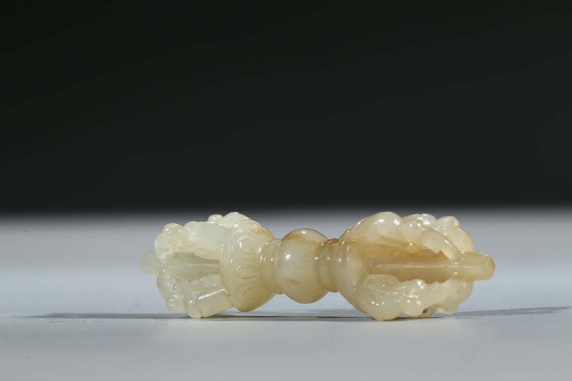 Carved in the form of Tibetan ritual instrument vajra with each end modelled with four curved prongs surrounding a central shaft, each prong further detailed with scrollwork, the stone of a celadon white tone. Ming Dynasty period.