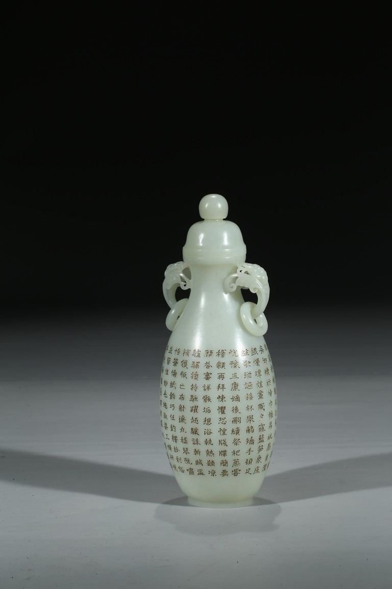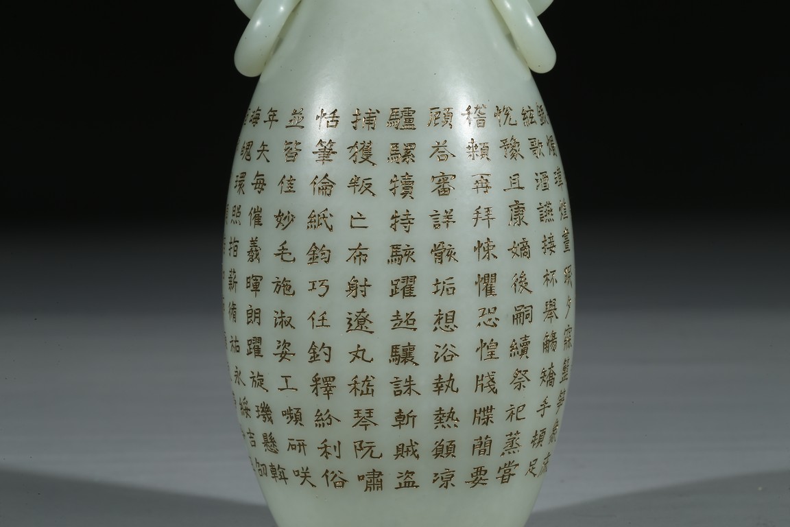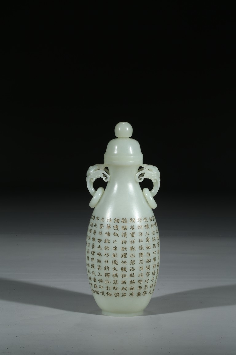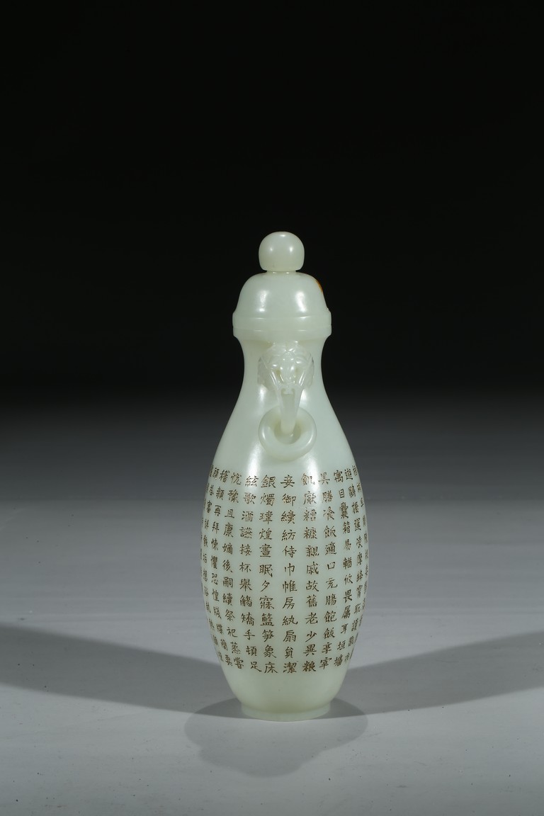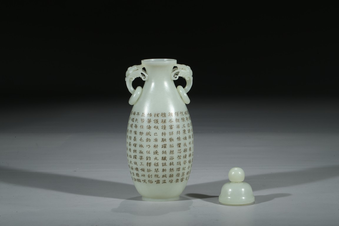 The slender ovoid body tapering to the neck that flares towards the mouth rim, flanked by a pair of mythical beast mask and loose ring handles, the body inscribed in regular script and in gilt with classical poem, completed with finial. The stone is of even white tone.