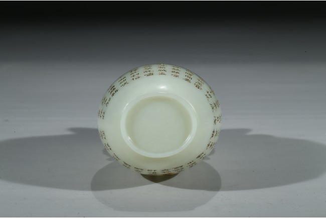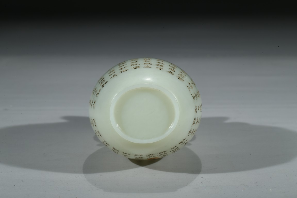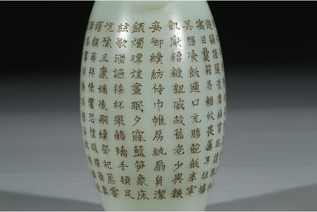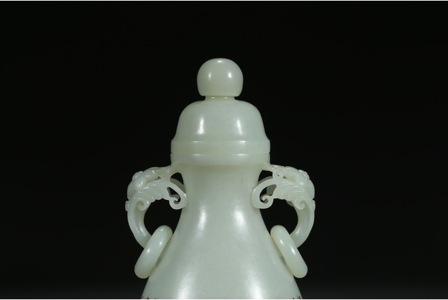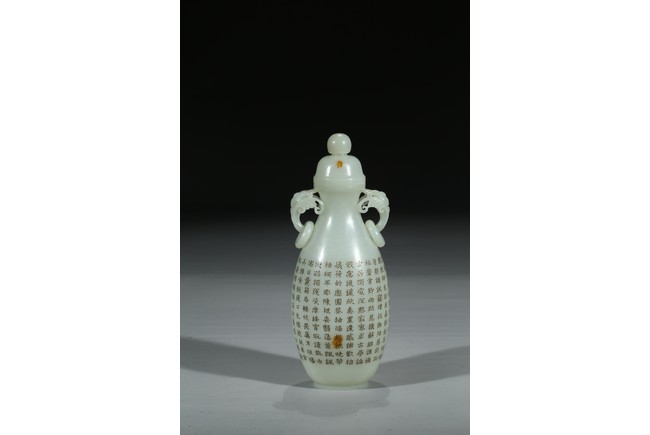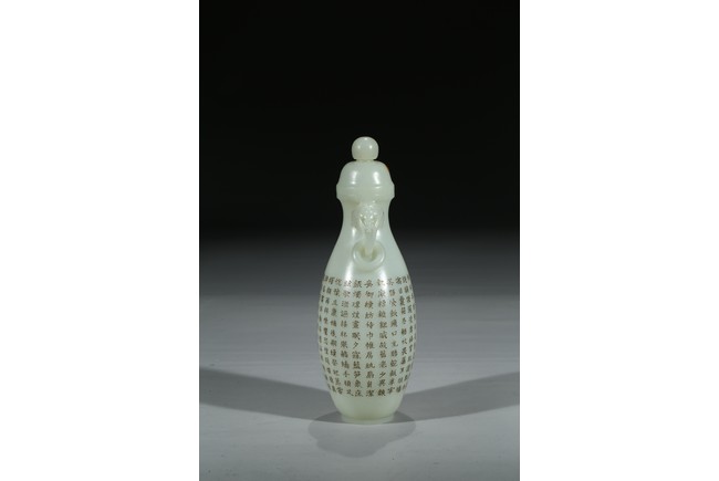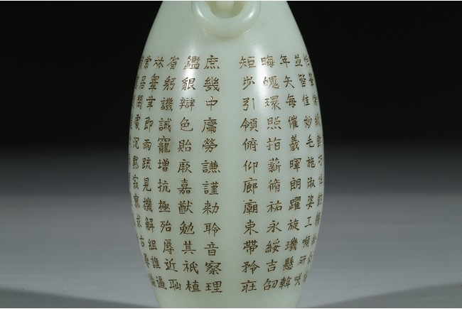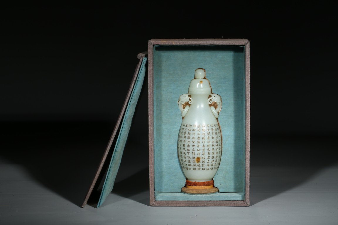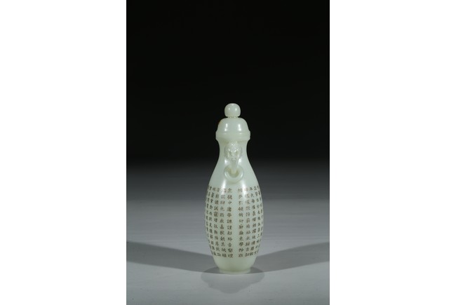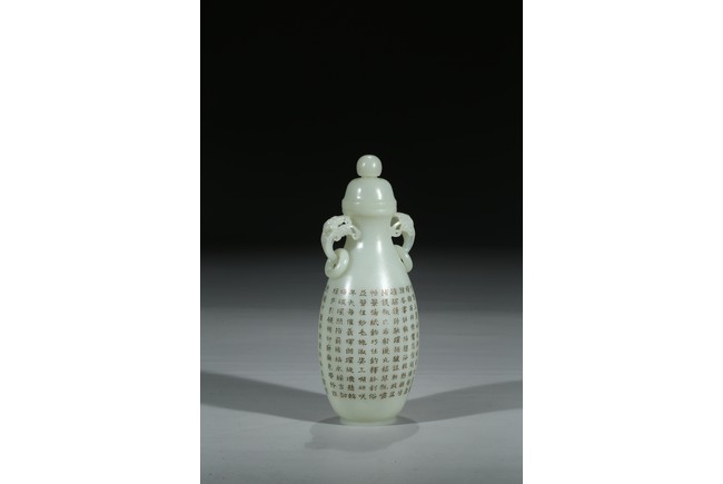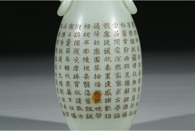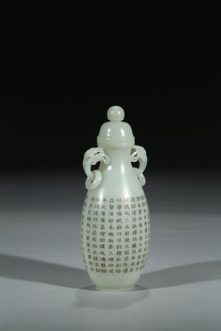 The slender ovoid body tapering to the neck that flares towards the mouth rim, flanked by a pair of mythical beast mask and loose ring handles, the body inscribed in regular script and in gilt with classical poem, completed with finial. The stone is of even white tone.