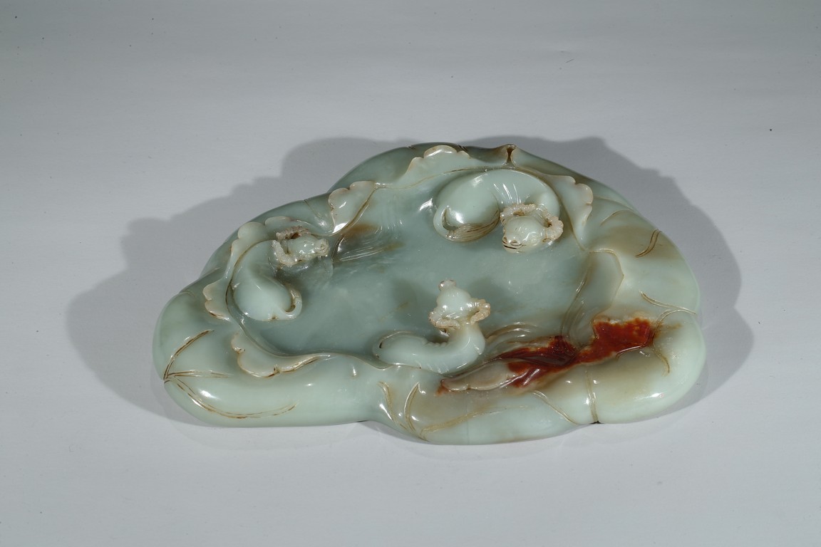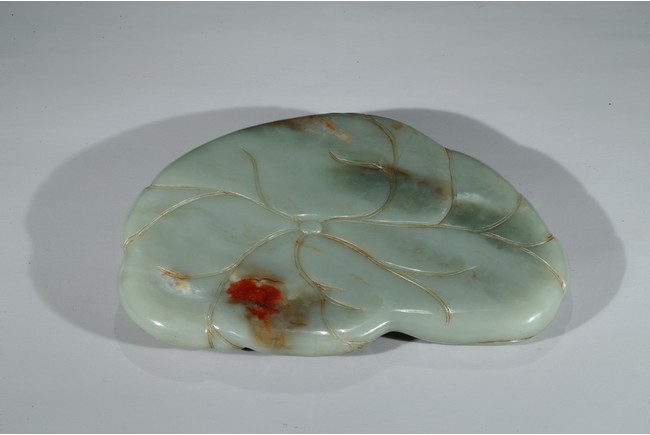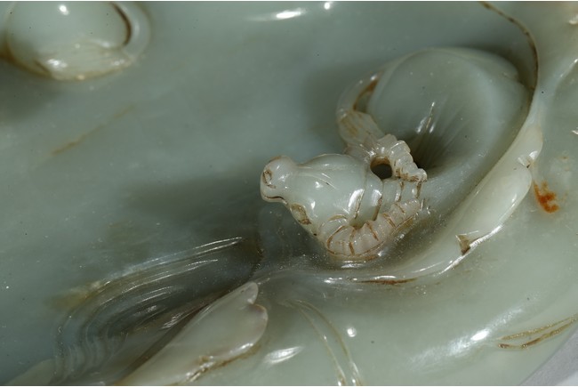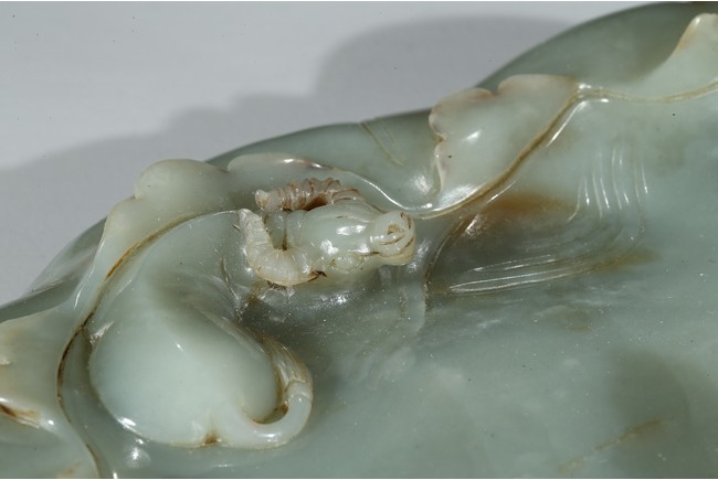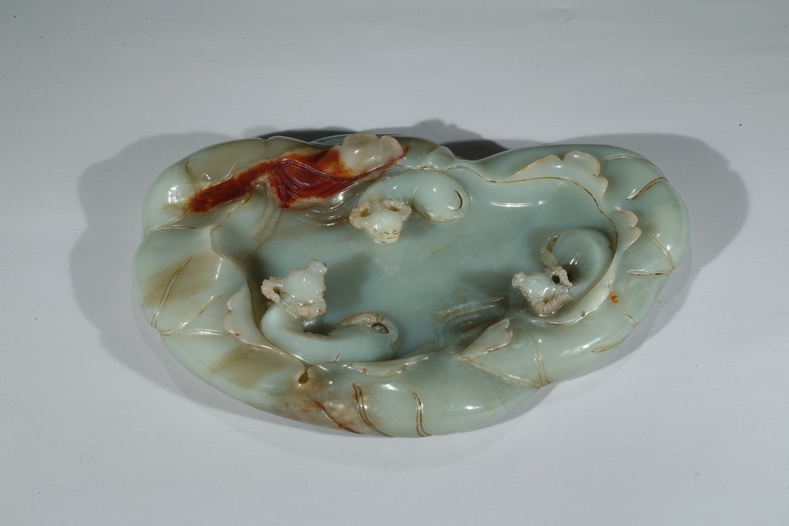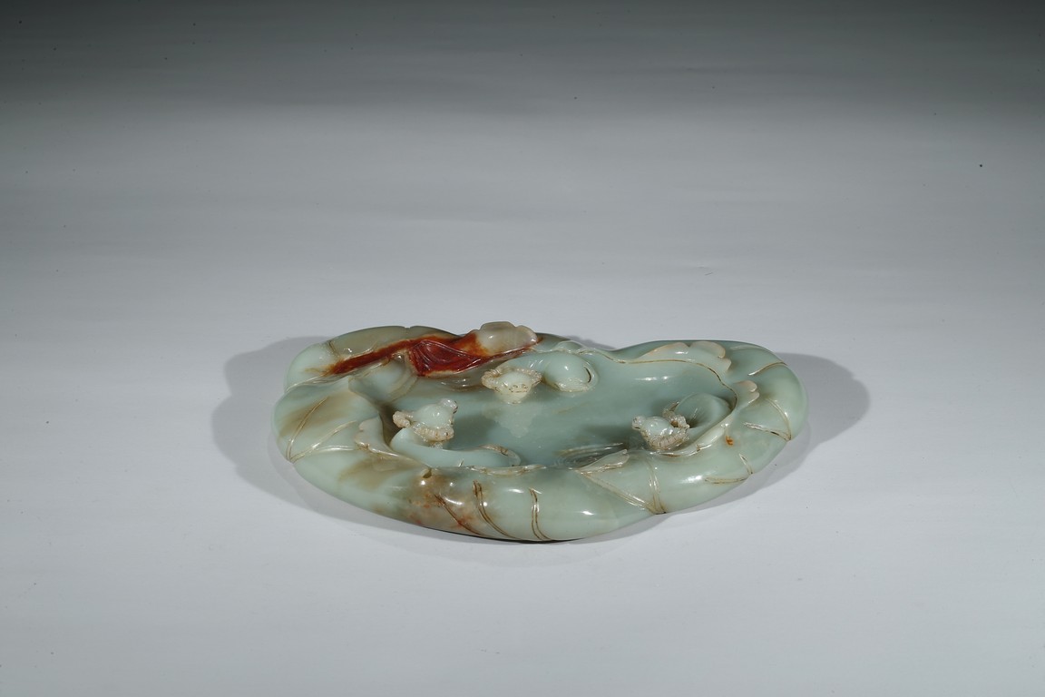 本件器物以青玉雕制而成,材質緻密溫潤,局部有帶紅褐色沁色。器物扁平隨形設計,以舒展內斂的荷葉形成筆洗,荷莖及葉脈紋理清晰。另在洗池內浮雕三牛相望,造型圓潤厚重,沉穩大方。整器情趣盎然,趣味橫生。