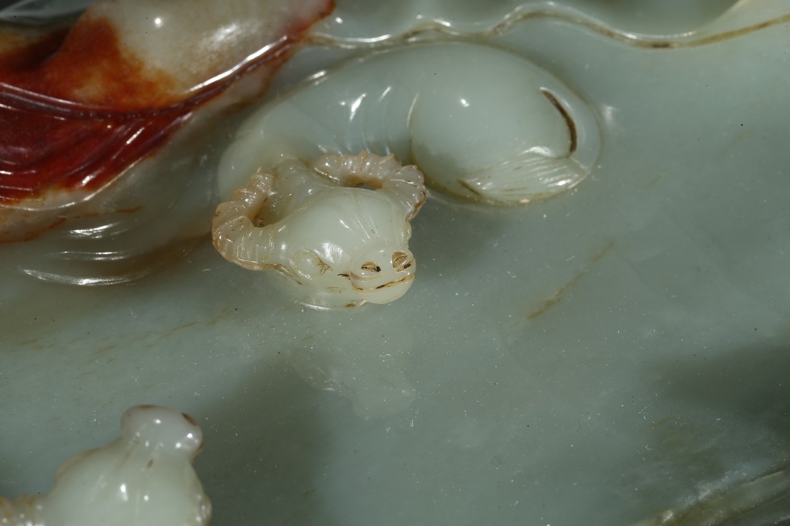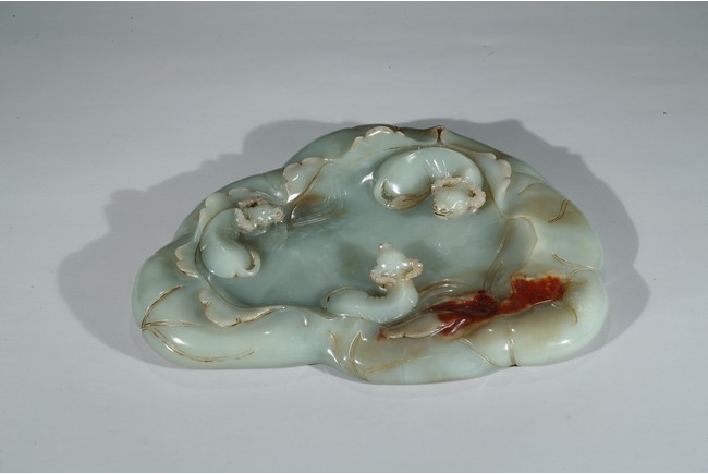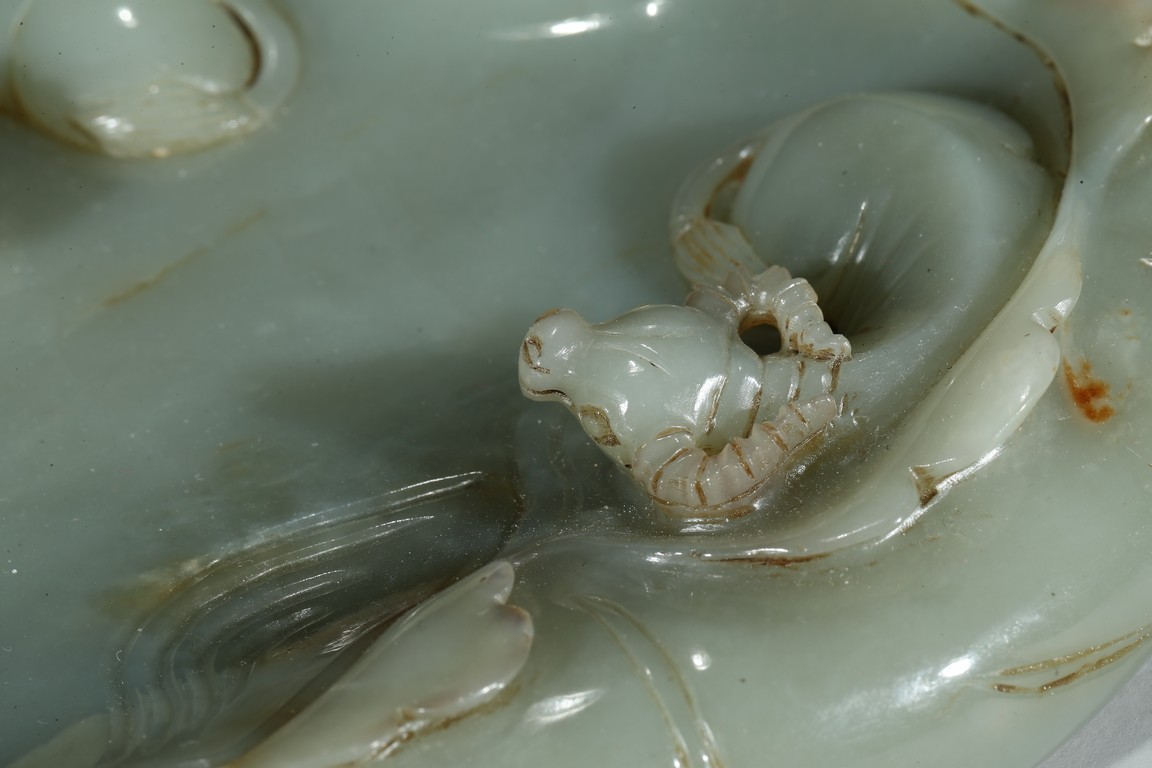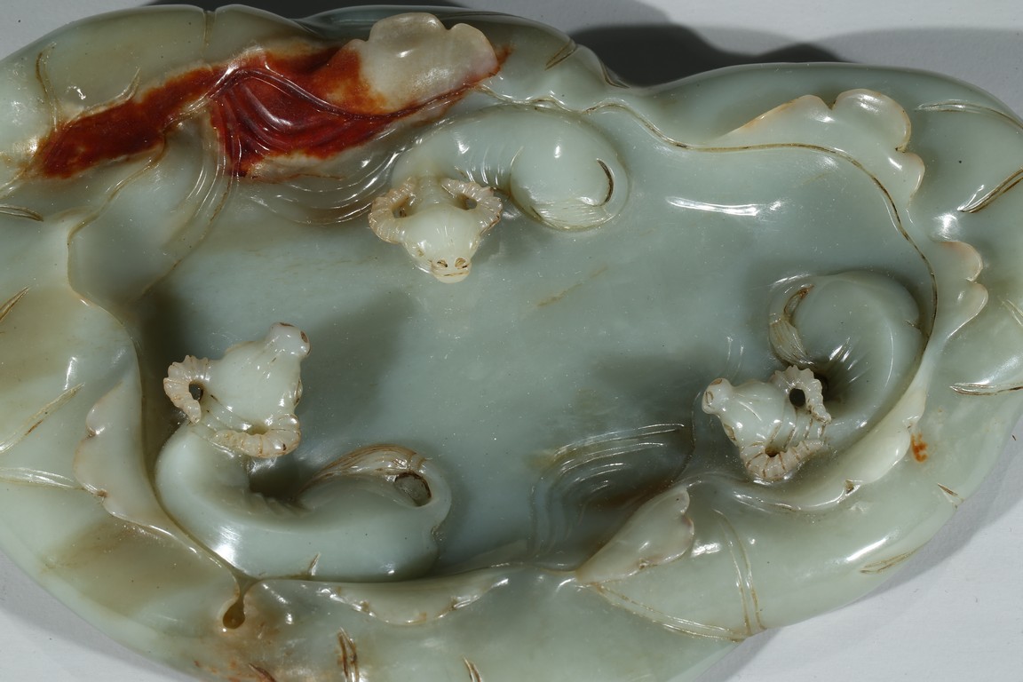 本件器物以青玉雕制而成,材質緻密溫潤,局部有帶紅褐色沁色。器物扁平隨形設計,以舒展內斂的荷葉形成筆洗,荷莖及葉脈紋理清晰。另在洗池內浮雕三牛相望,造型圓潤厚重,沉穩大方。整器情趣盎然,趣味橫生。