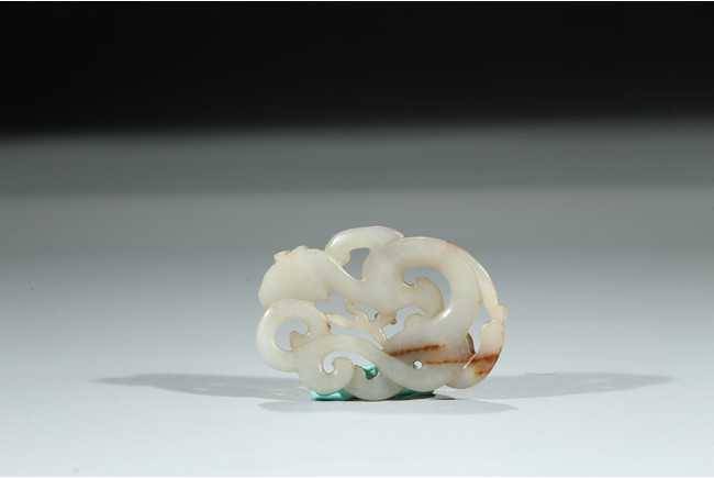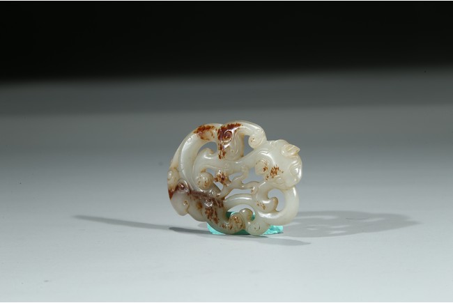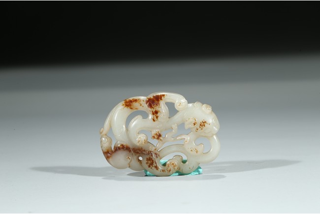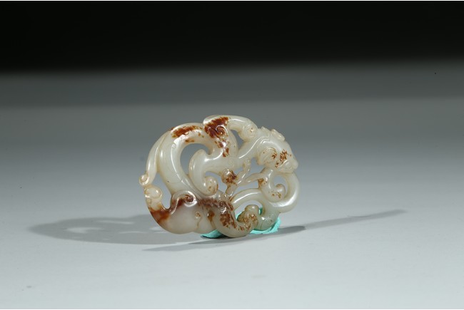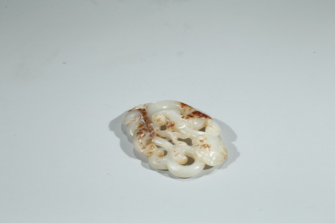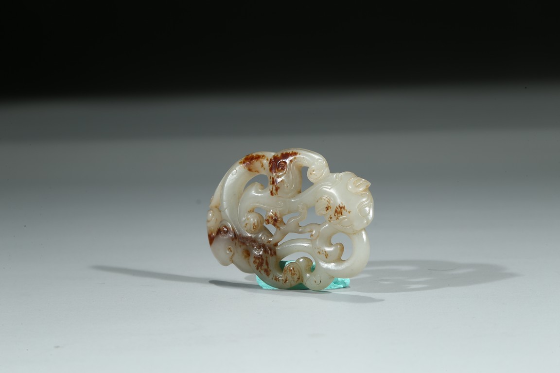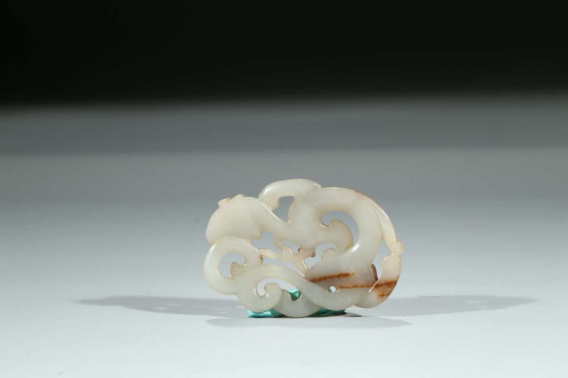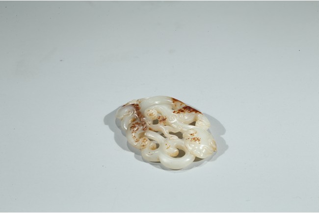 Carved and pierced in the form of openwork sinuous chilong pendant, the polished white tone stone with russet inclusions. Qing Dynasty period.