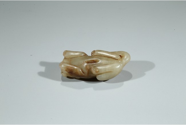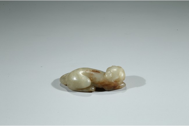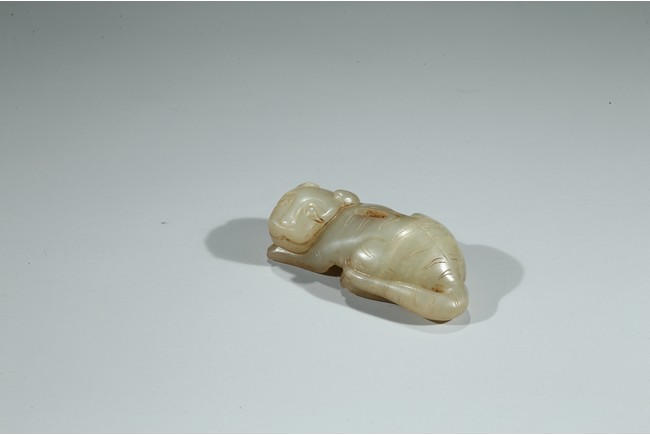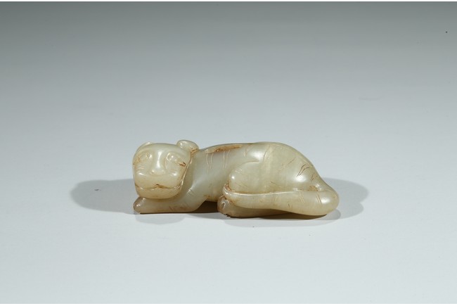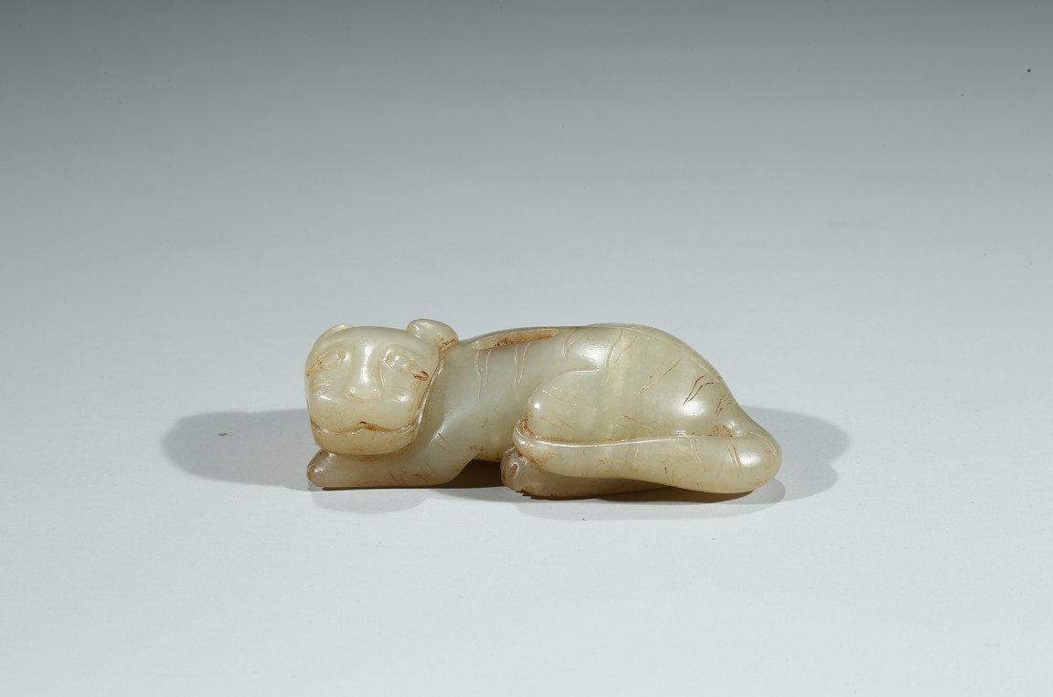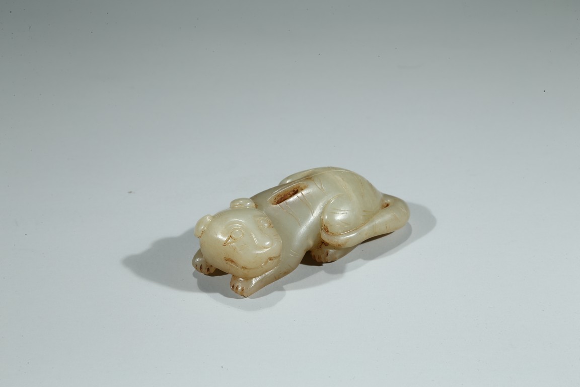 Carved in the form of recumbent tiger with head and tail turned to one side, top drilled with an opening. Song Dynasty period.