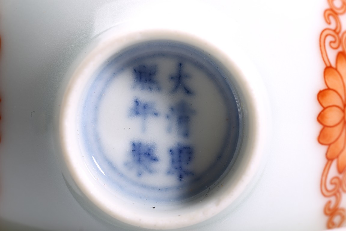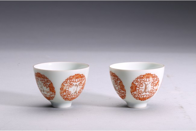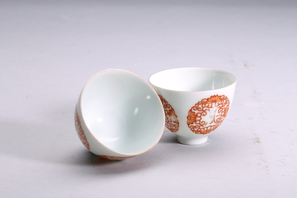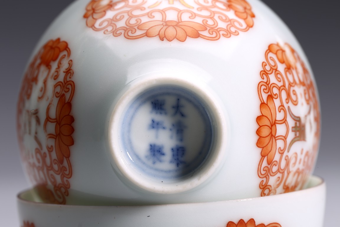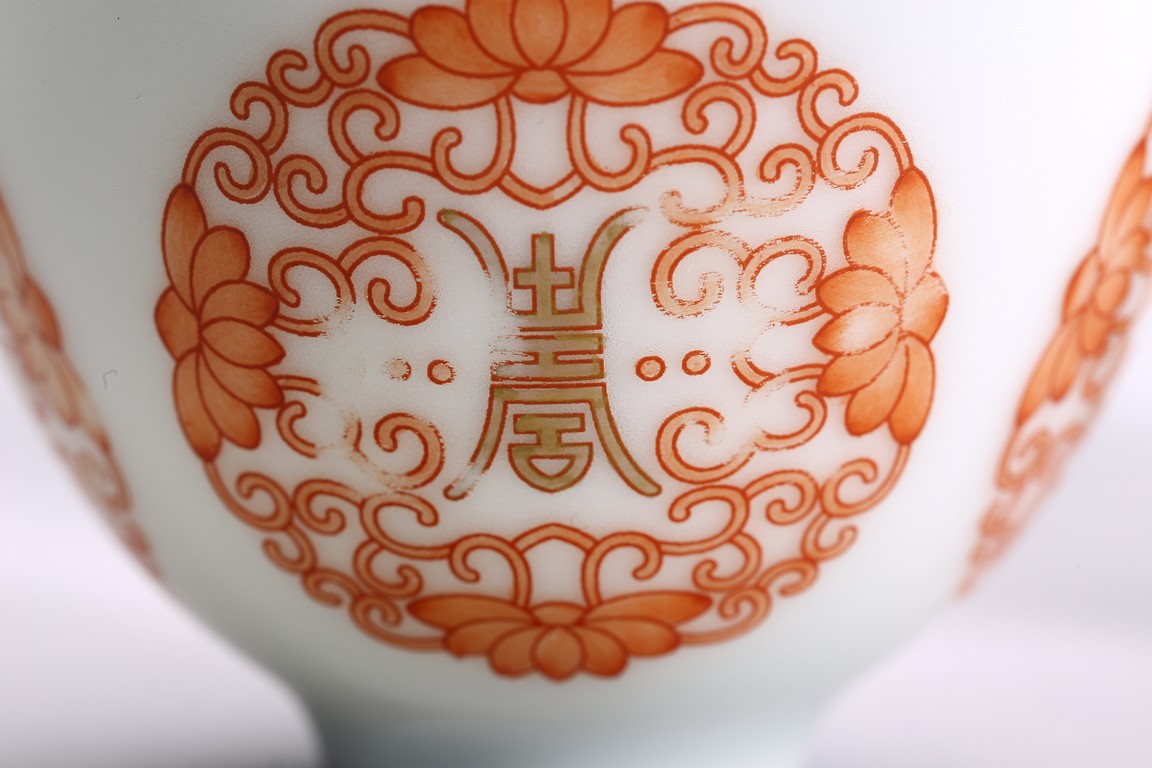 Each cup painted in red glaze depicting medallions of stylized shou surrounded by scrolled lotus, the base with Yongzheng mark. Qing Dynasty period.