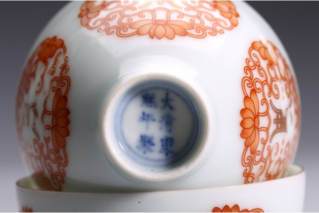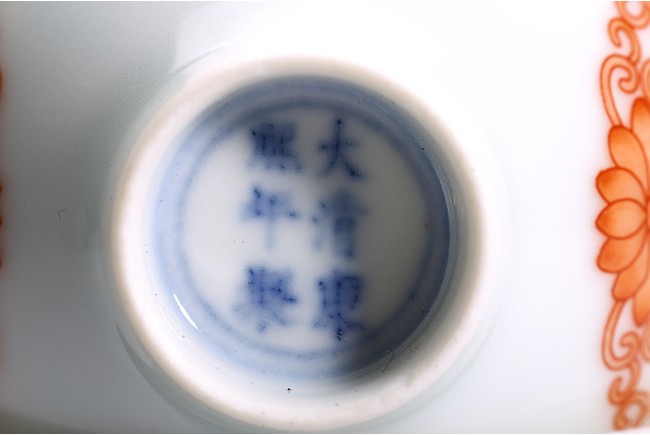 本品造型飽滿,小巧怡人,胎質細膩潔白,釉色滋潤透亮,腹部以釉裡紅描繪紋樣,紋飾清疏有致,妍而不俗,秀而不媚,穆穆之中自有熙朝之英氣撲人眉宇。“大清康熙年製”款識。