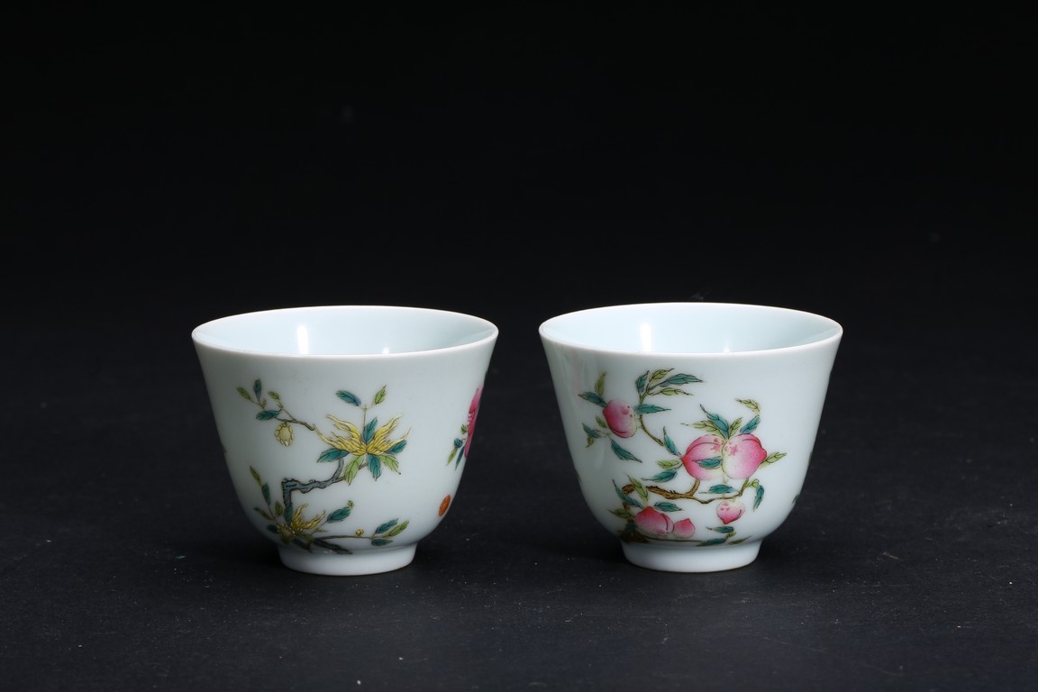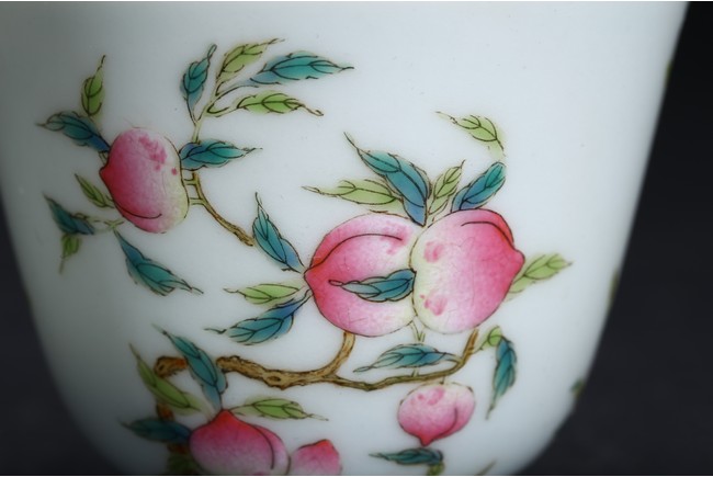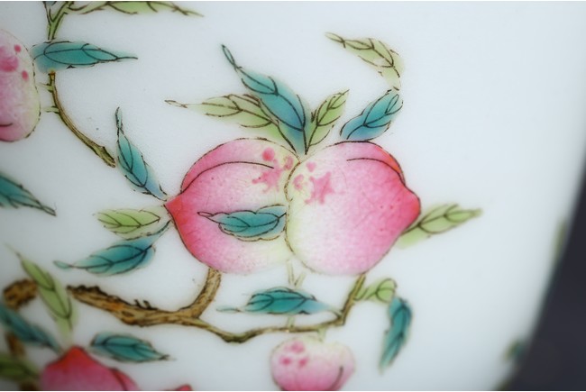 Finely potted and exterior painted with the sanduo fruits, including peach, pomegranate, and finger citron borne on leafy branches. Base with mark. Qing Dynasty period.