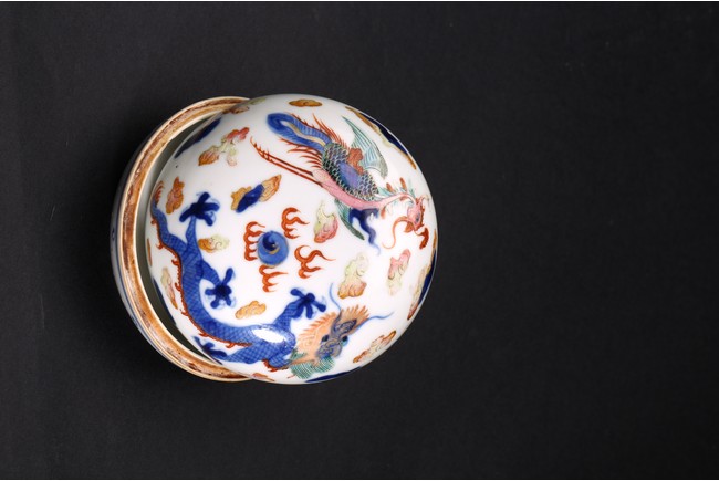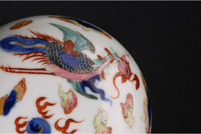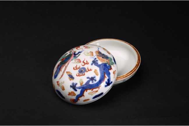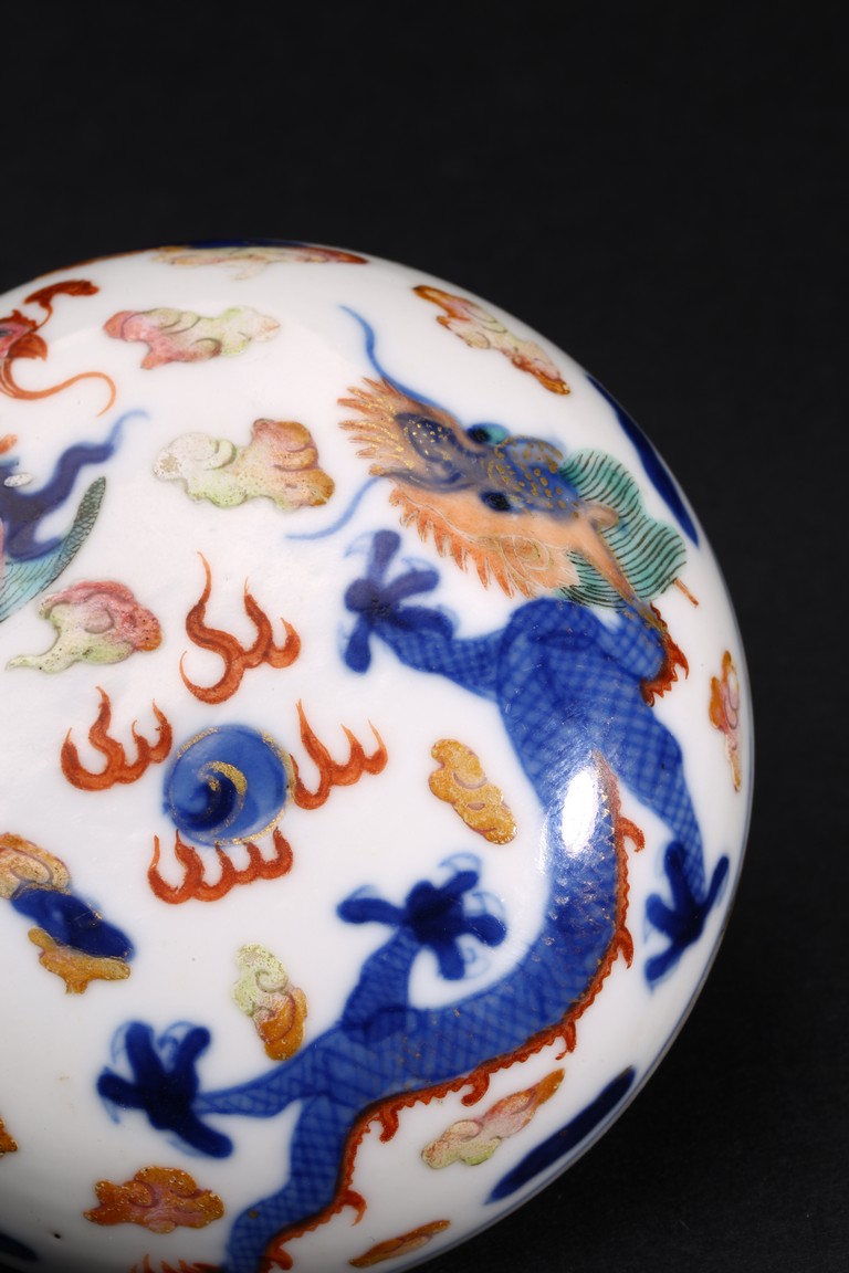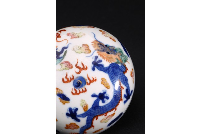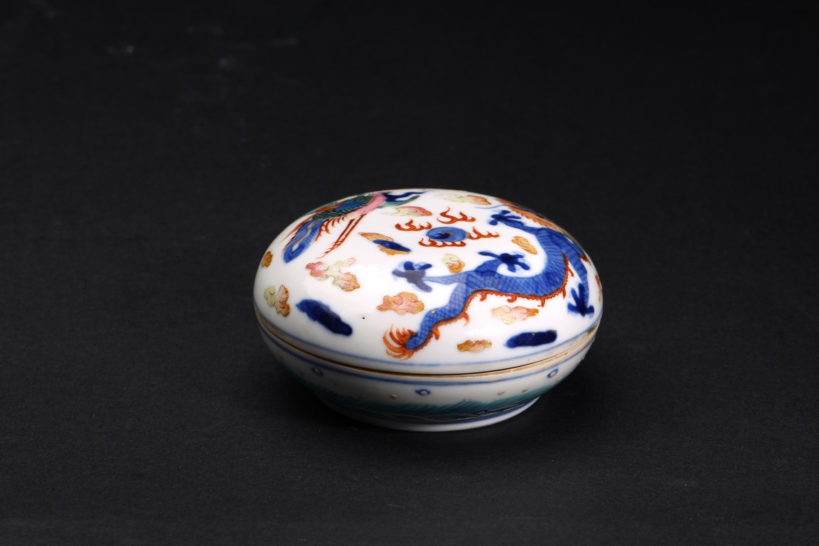 印泥盒呈扁圓形,蓋面與盒身以子母口相合。胎質潔白堅實,器身外壁繪青花加粉彩繪龍鳳紋,富麗堂皇,華美奪目,寓意龍鳳呈祥,雍容華美。整體佈局繁密,繪畫精湛,色彩鮮艷。“大清康熙年製”款識。
