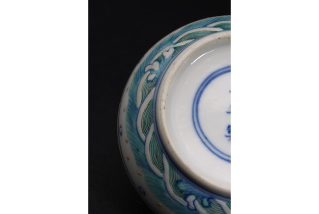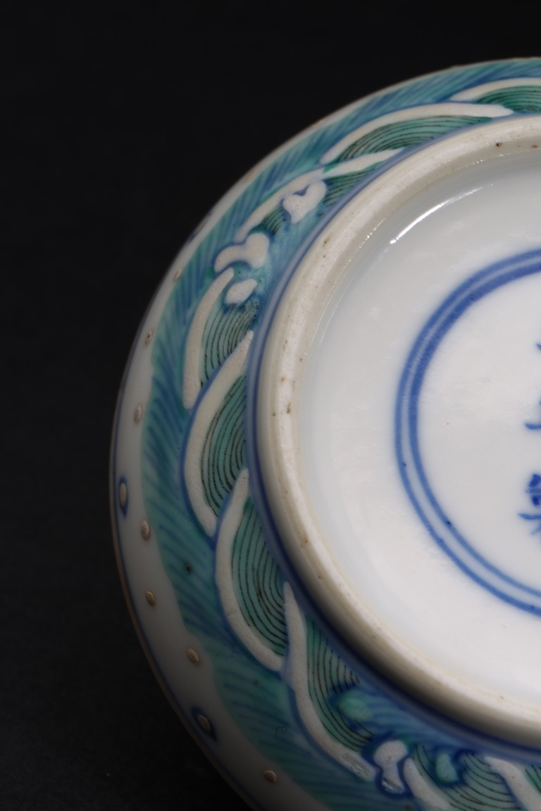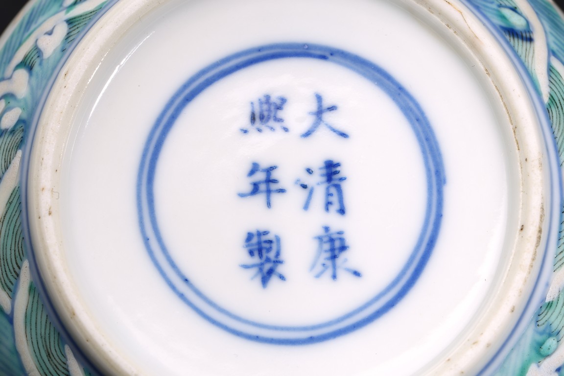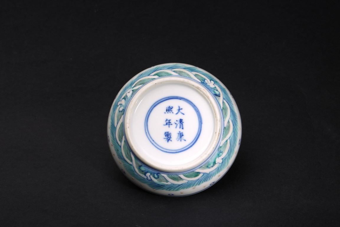 Of circular form, the box top enamelled with a four-clawed dragon and a phoenix chasing a flaming pearl, the exterior decorated with ocean wave pattern, the base inscribed with six character Kangxi mark. Qing Dynasty period.