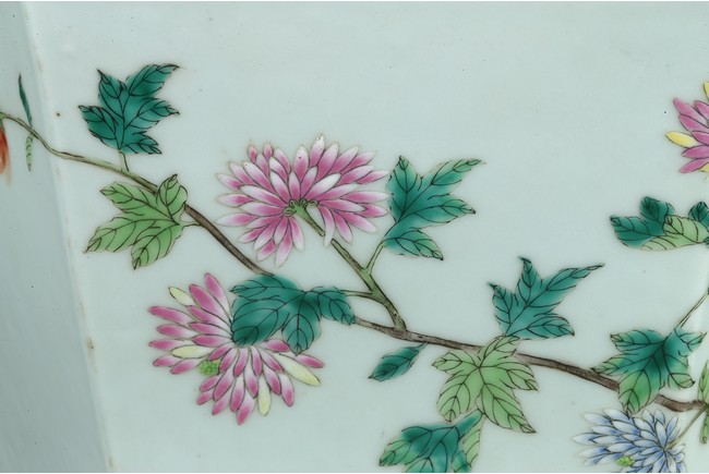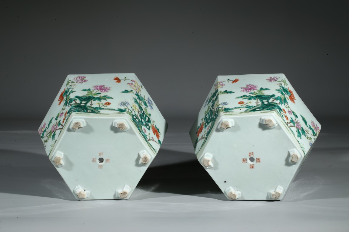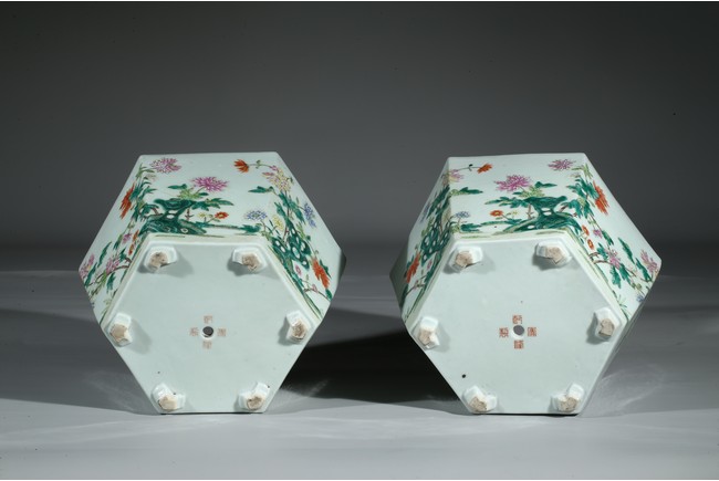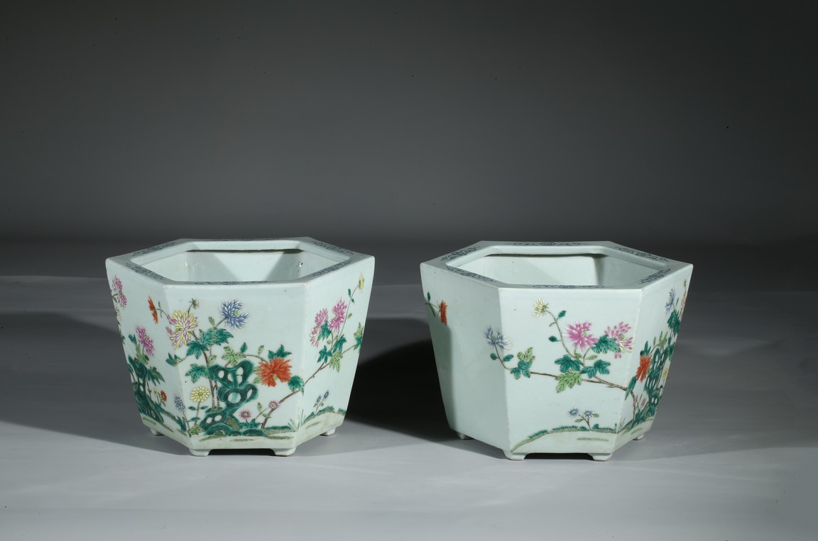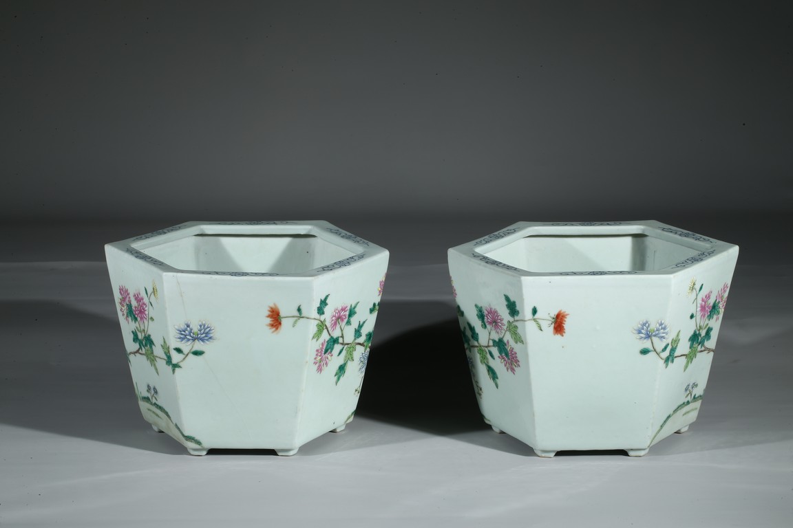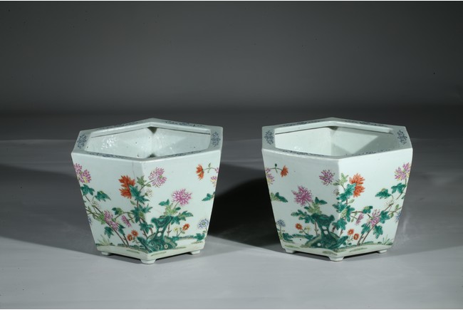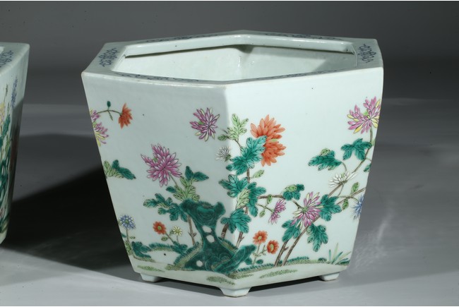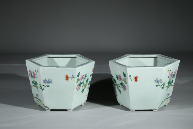 入清以來,花盆逐漸成為宮中非常重要的陳設瓷器,到乾隆時期,各種花盆的製作不惜工本、精工細作,特別是用於宮中嬪妃居所陳設的小型花盆,更是登峰造極、空前絶後。此盆敞口,六方形,深腹,平底,底有小足,中有圓孔,內外施白釉,釉色白中泛青,盆腹壁上彩繪各種花卉,用色典雅,佈局巧妙,繪工精細,線條流暢自然。成對保存,有小殘。“乾隆年制”款識。