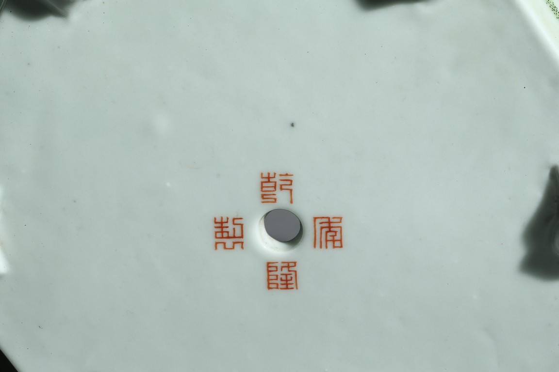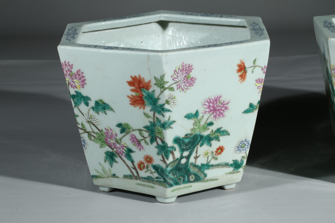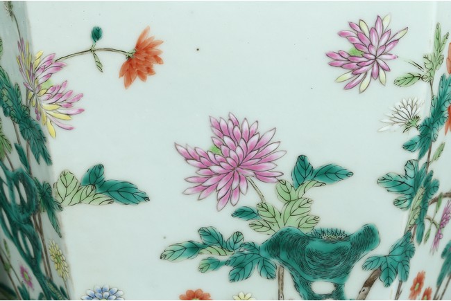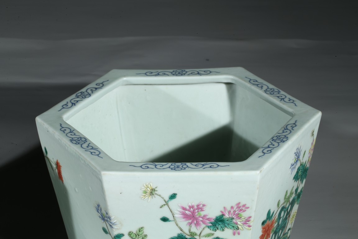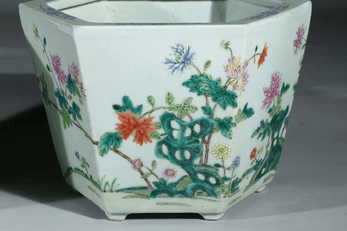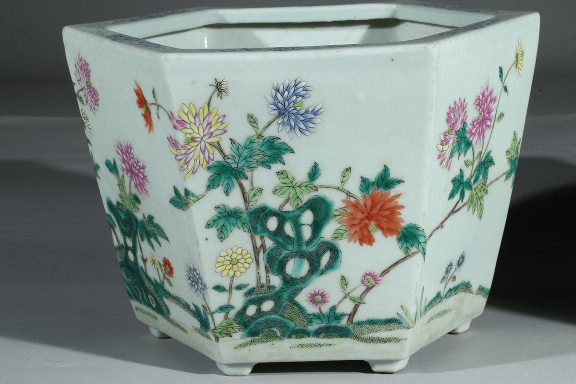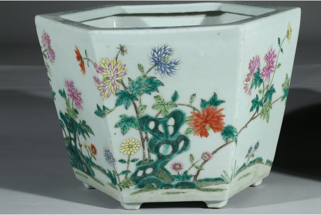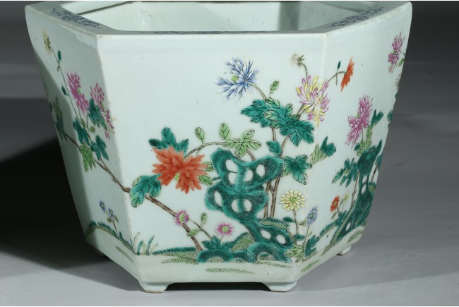 Of hexagonal form, each side of the exterior decorated with various leafy chrysanthemum and rockworks, mouth rim decorated with scrolled pattern, the base inscribed with four character Qianlong mark. Qing Dynasty Qianlong period.