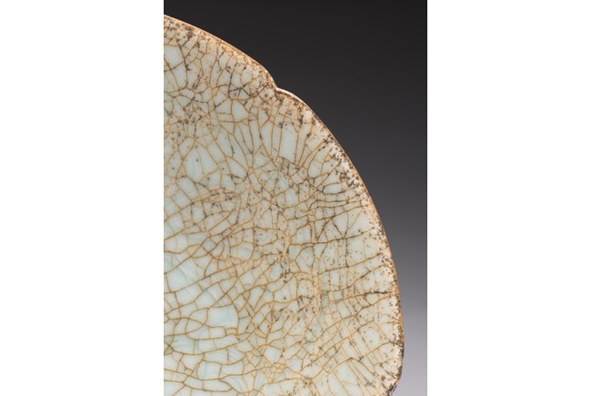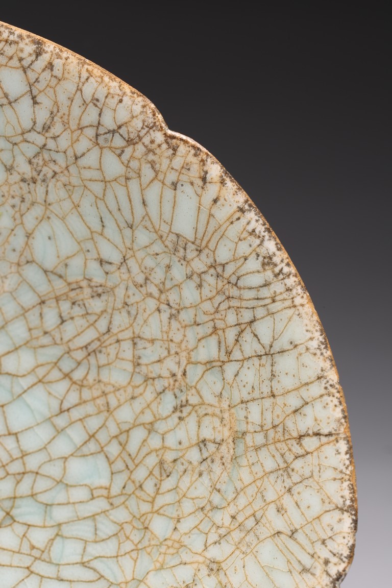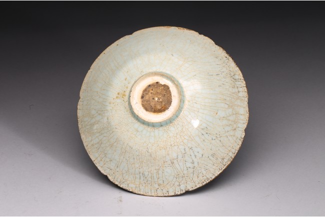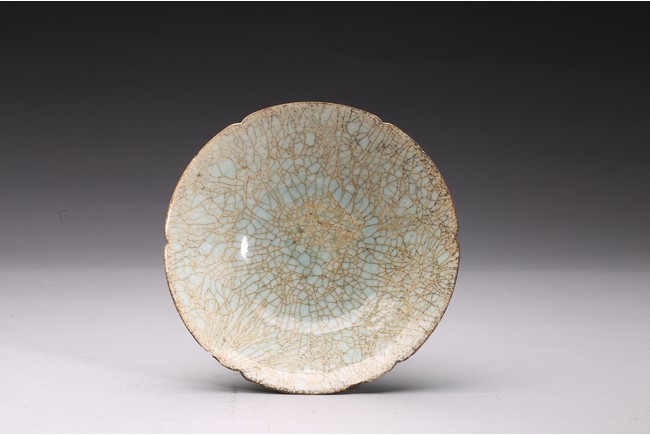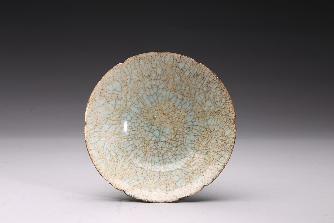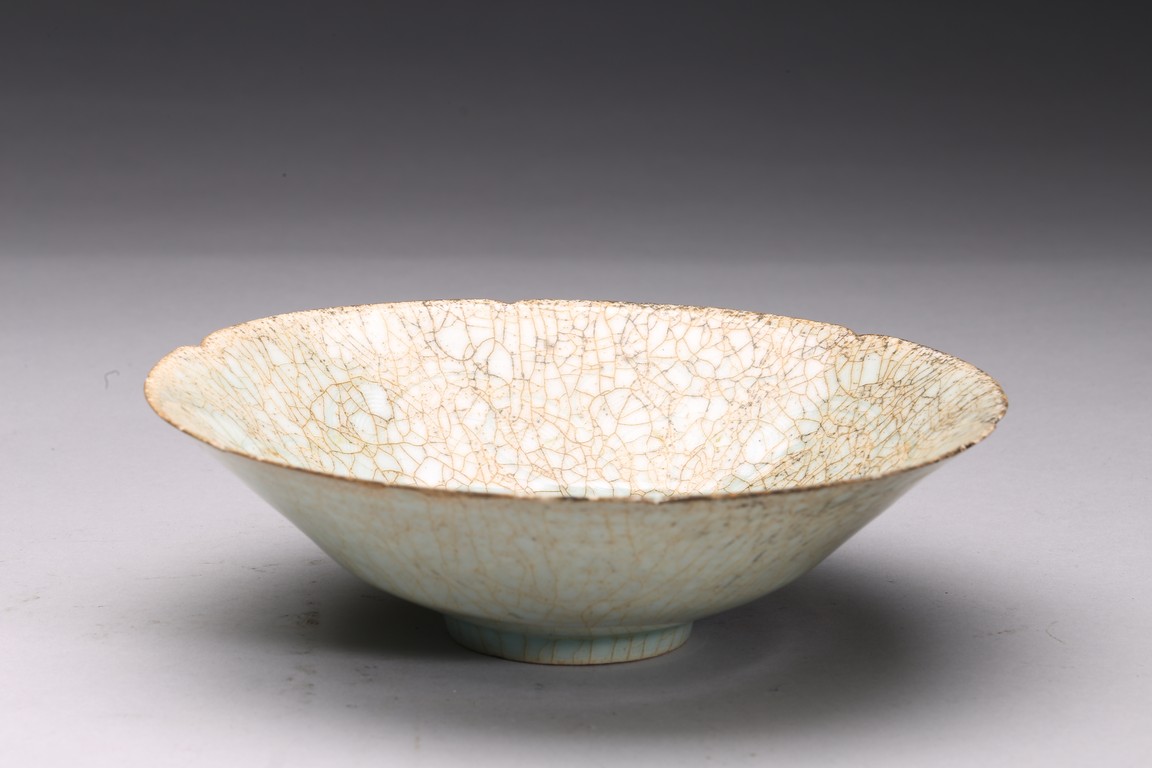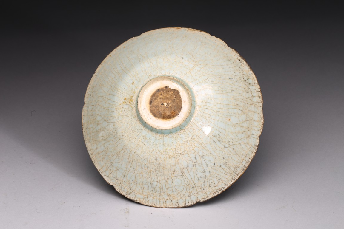 With deep flaring sides rising to a lobed rim, evenly covered with a light blue glaze with dense light brown crackles. Ming Dynasty period.