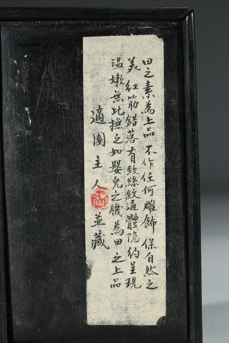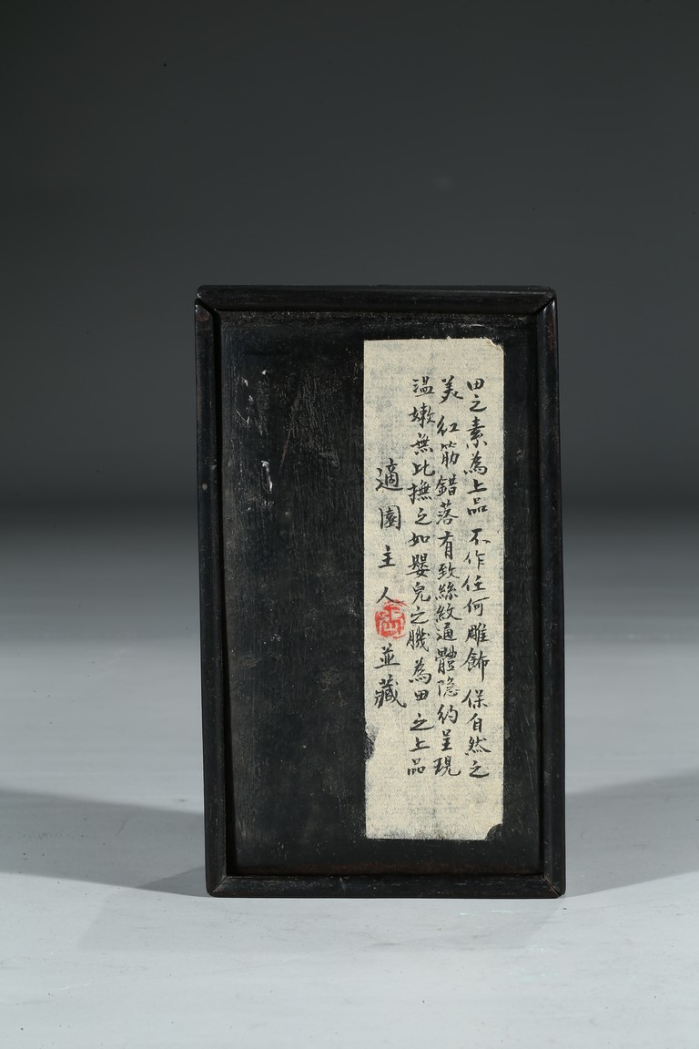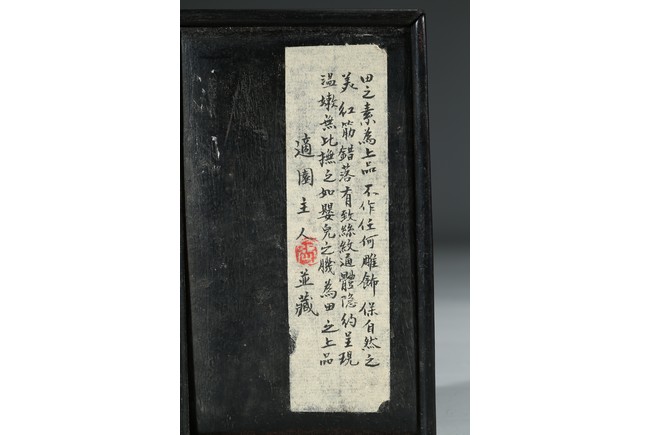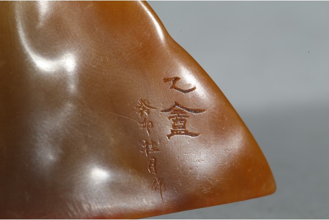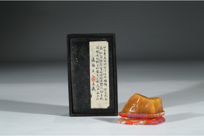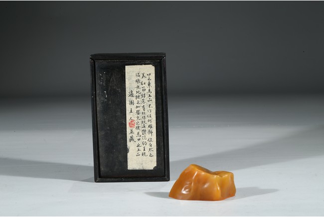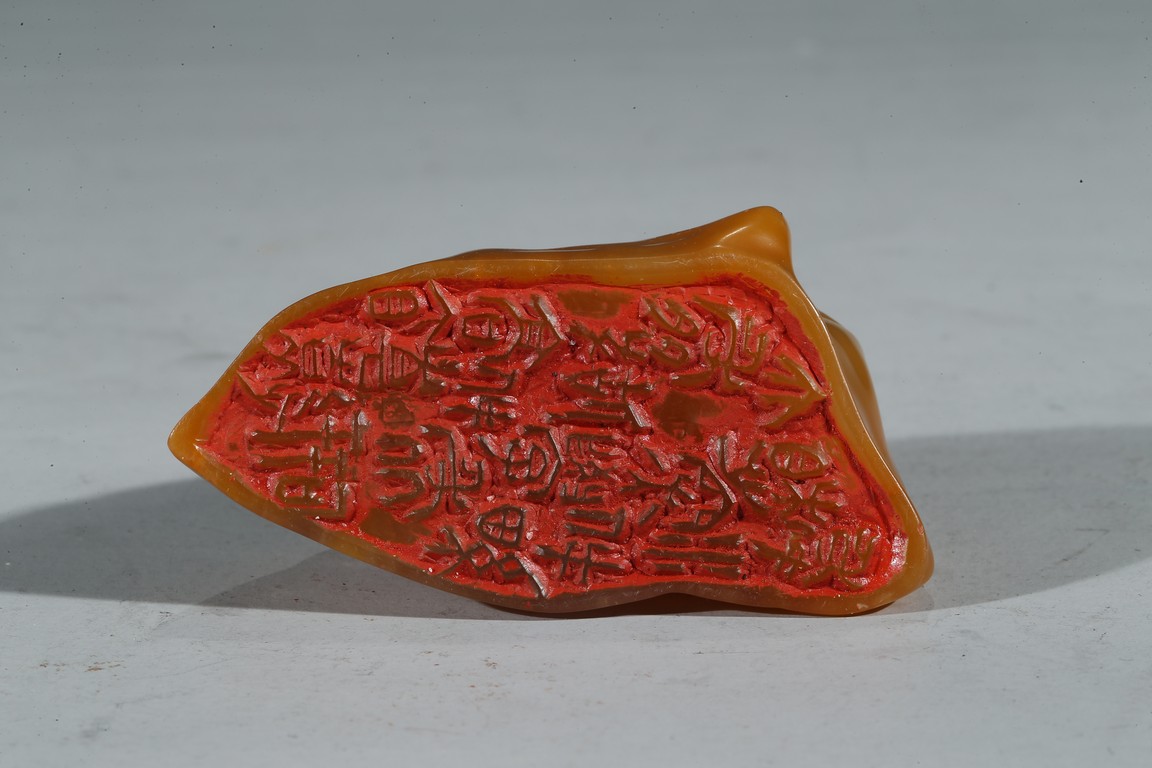 Modelled in the form of a naturalistic mountain, the seal inscribed with inscriptions, the base carved with inscriptions. Qing Dynasty period.