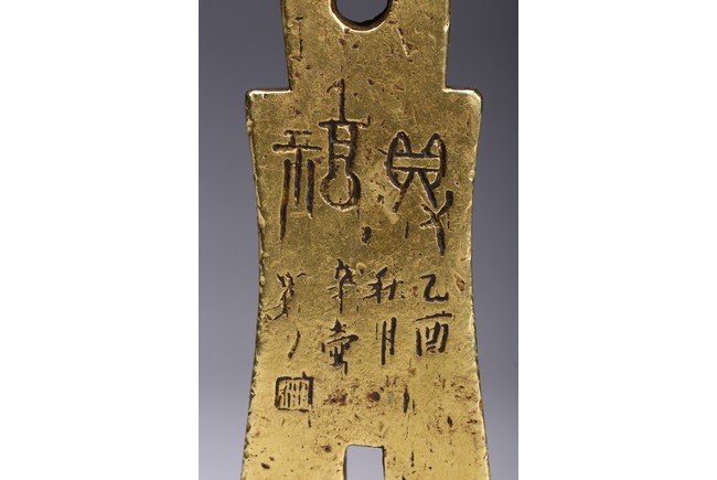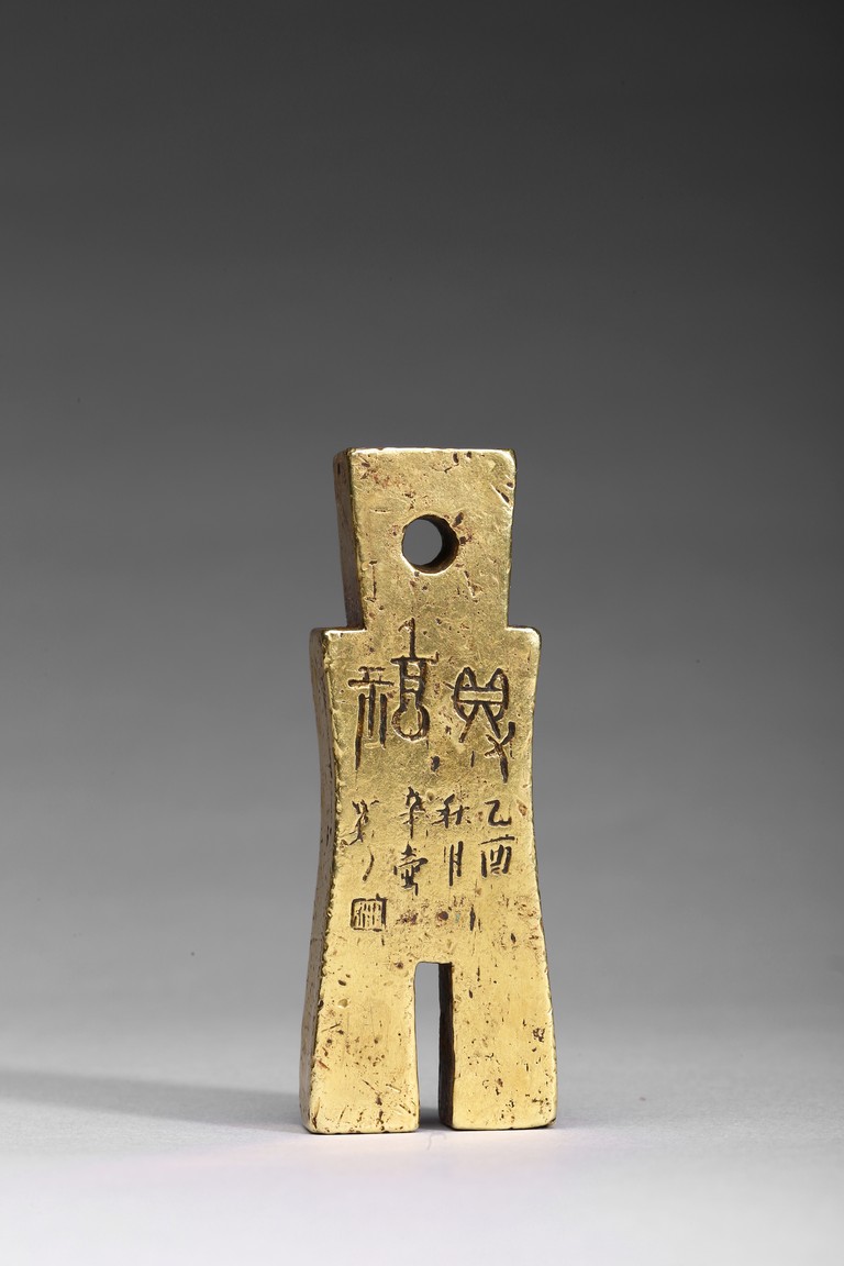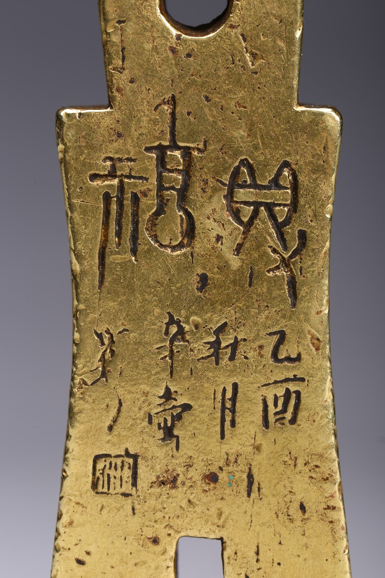 Modelled in the form of archaistic spade money, inscribed and seal base with two characters. Ming Dynasty period.