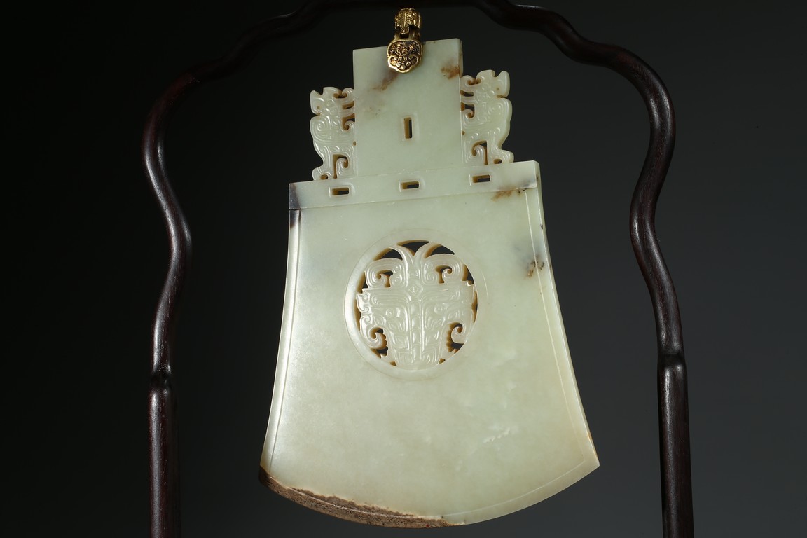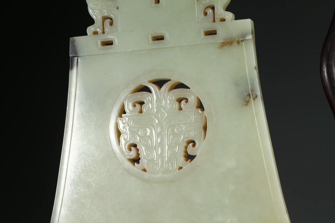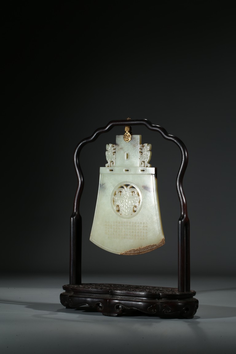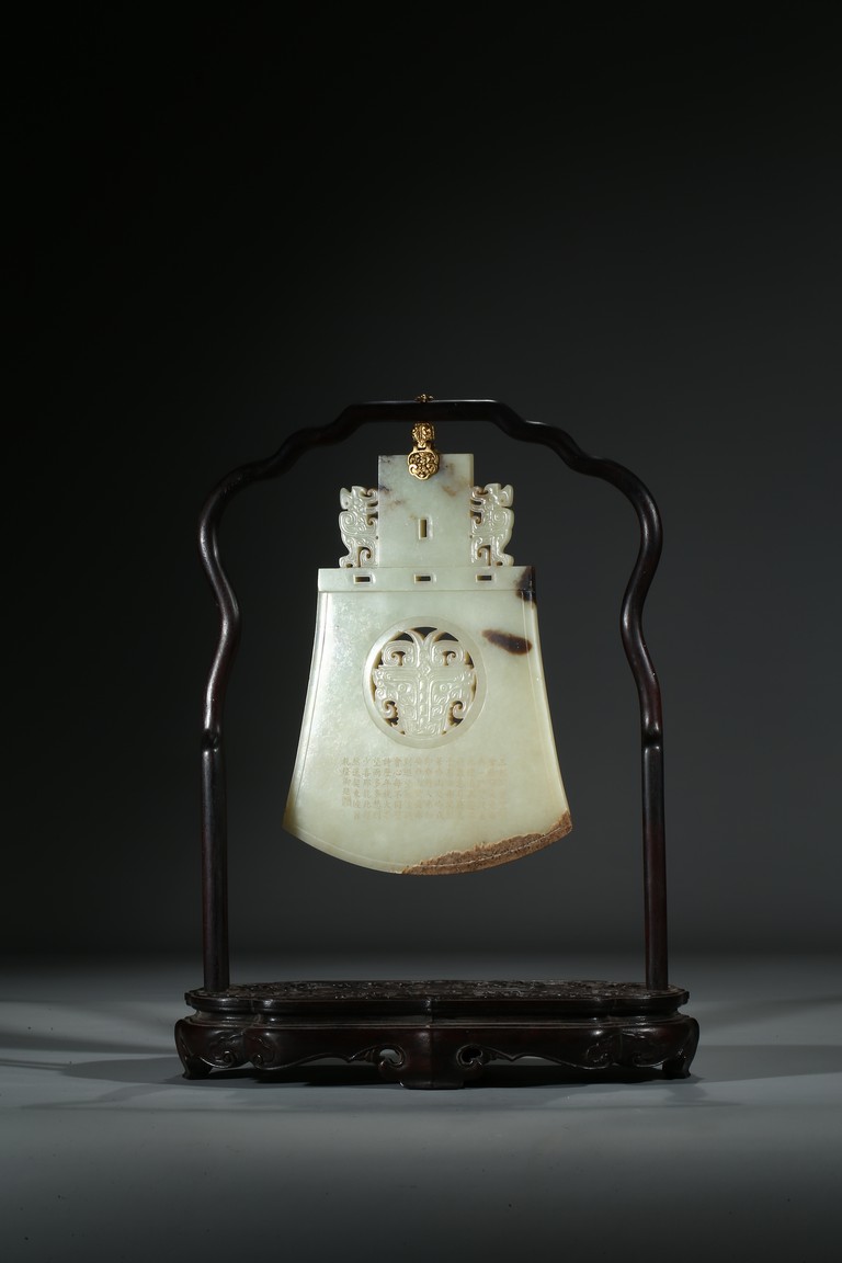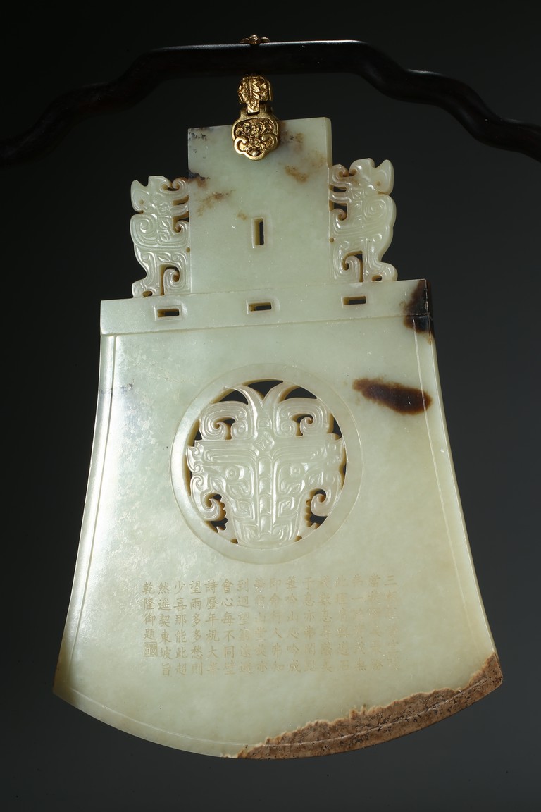 Carved to imitate an archaic axe-blade with an openwork medallion of stylized taotie mask to the center, above inscribed Imperial poem composed by Qianlong Emperor in regular script, surmounted on the top with a pair of phoenix flanking the rectangular axe handle, all suspended on a hardwood stand. Qing Dynasty Qianlong period.
