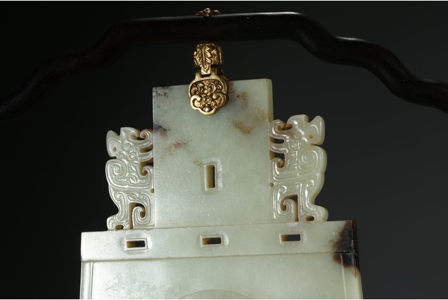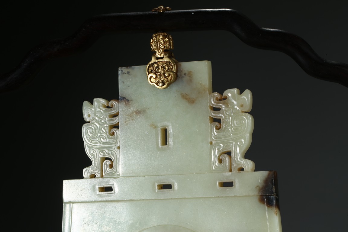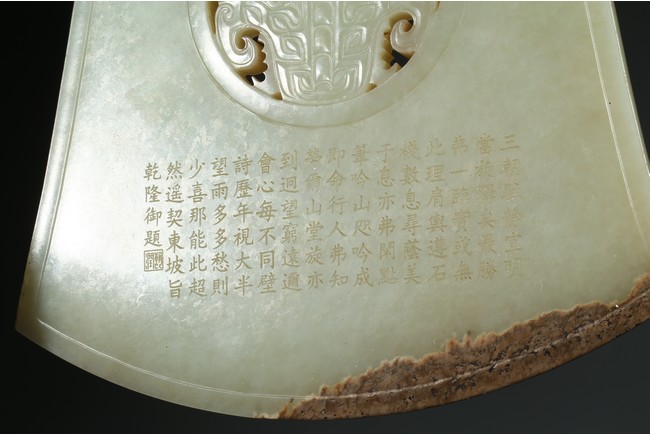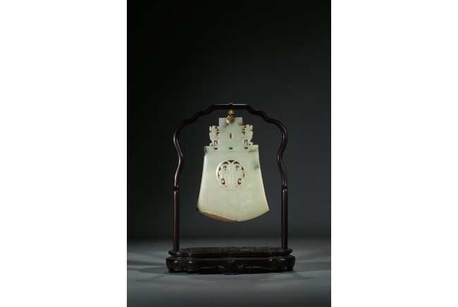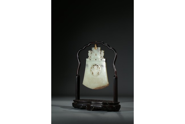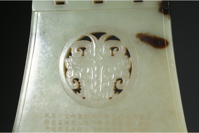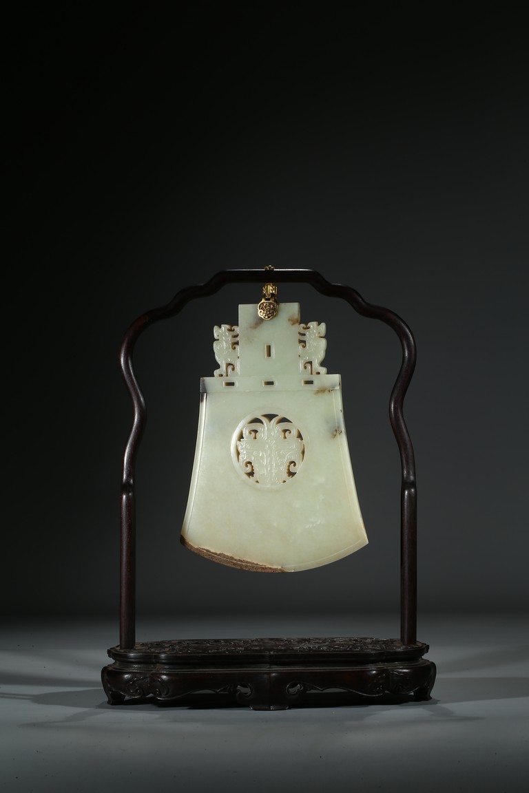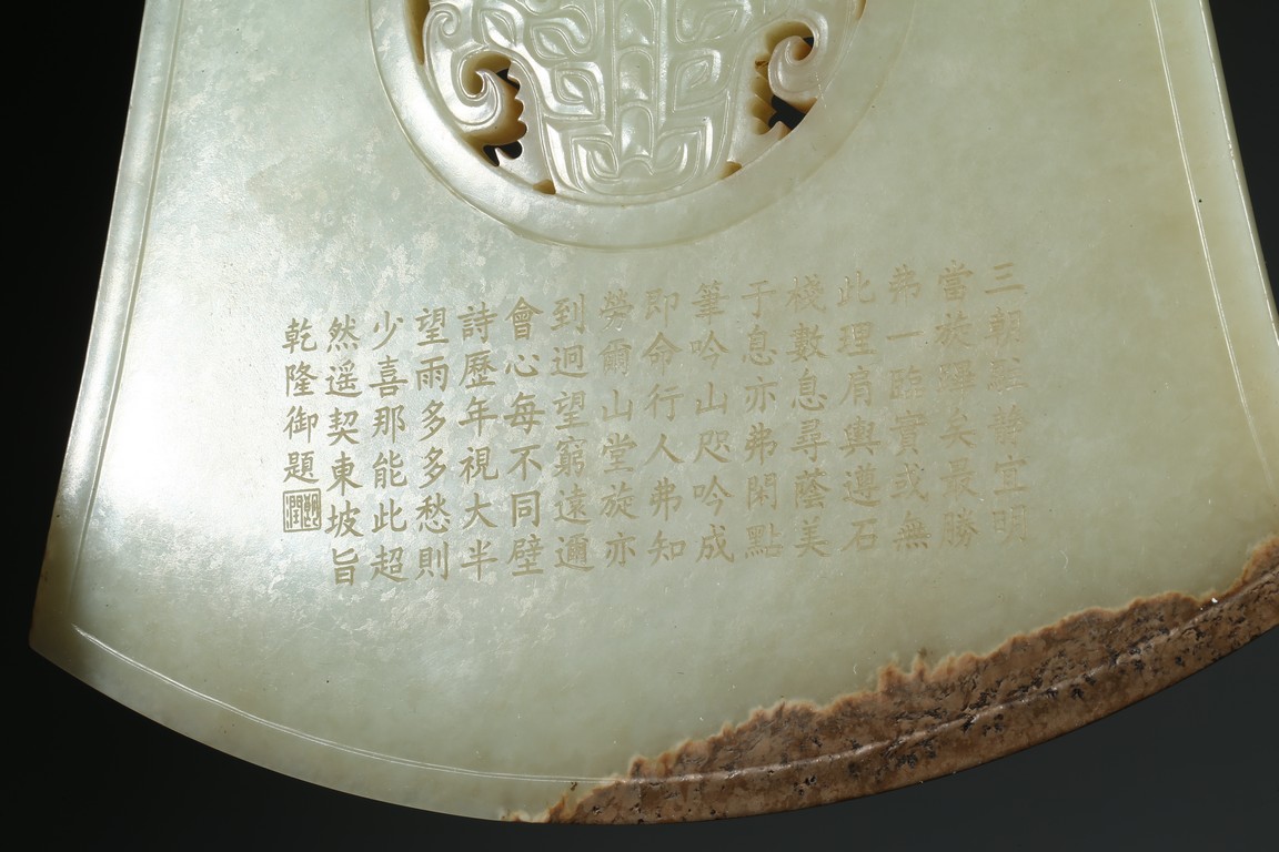 Carved to imitate an archaic axe-blade with an openwork medallion of stylized taotie mask to the center, above inscribed Imperial poem composed by Qianlong Emperor in regular script, surmounted on the top with a pair of phoenix flanking the rectangular axe handle, all suspended on a hardwood stand. Qing Dynasty Qianlong period.