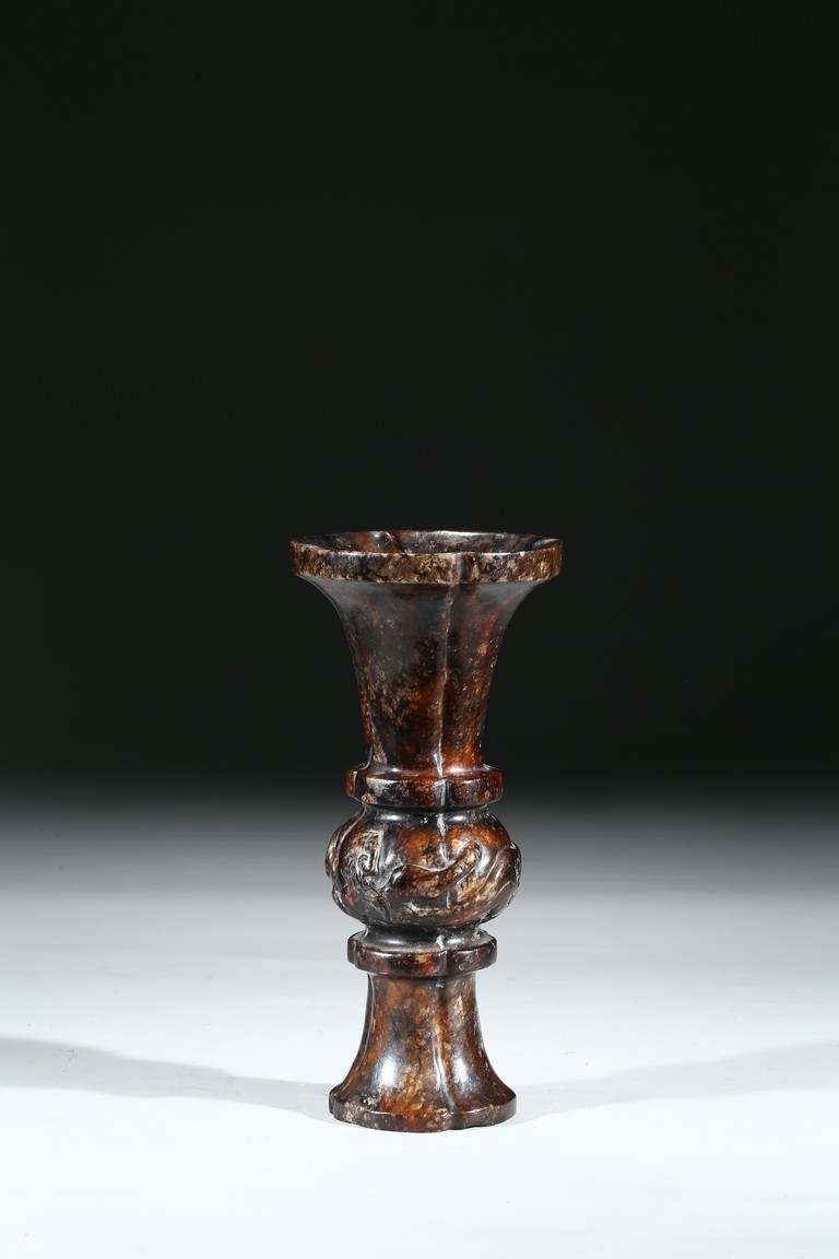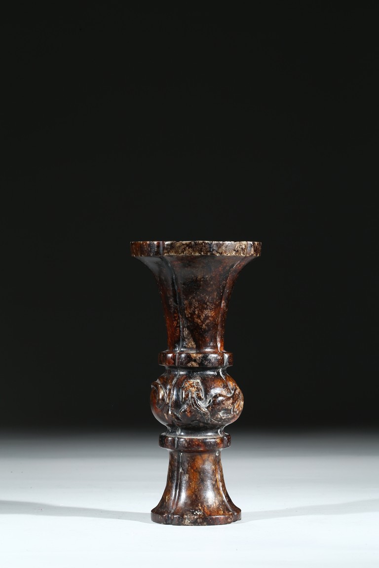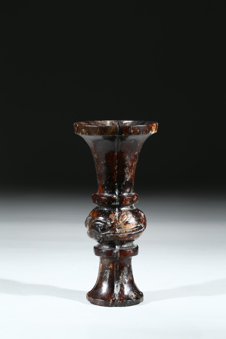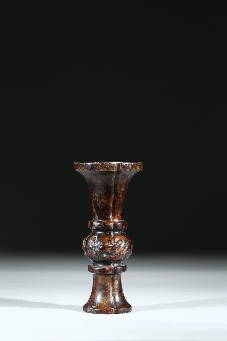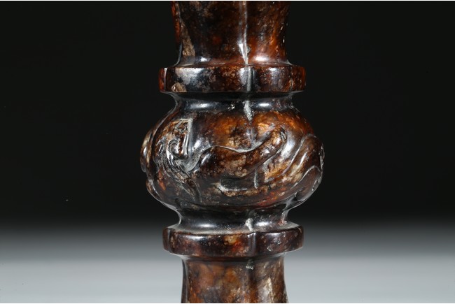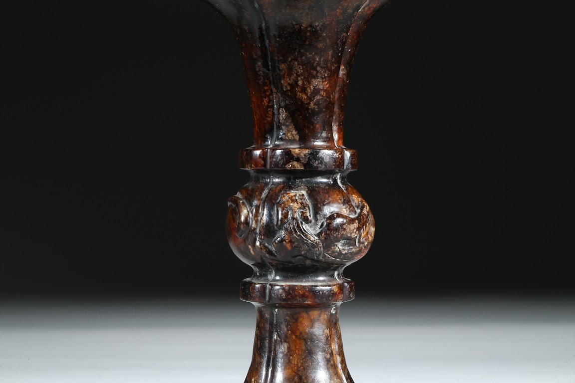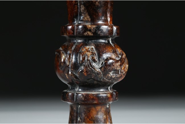 Modelled in archaistic gu-vessel form, the waisted body at the center carved in relief with sinuous chilong decoration.
