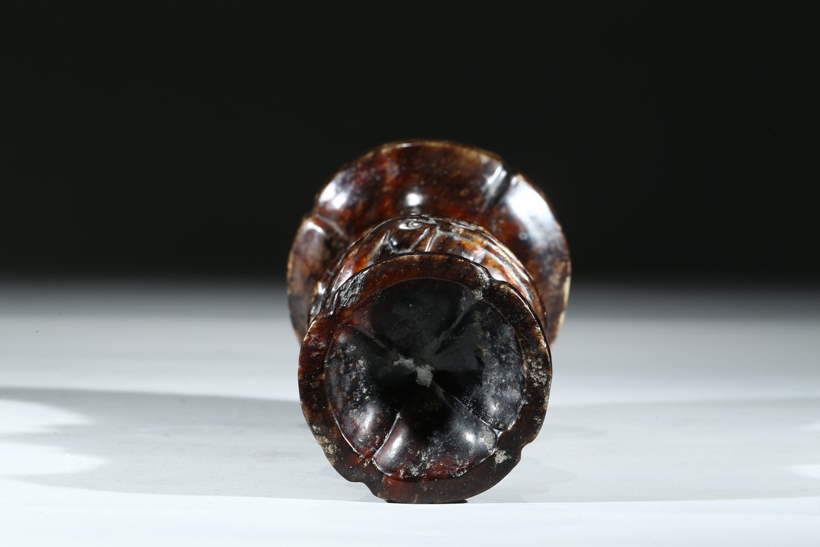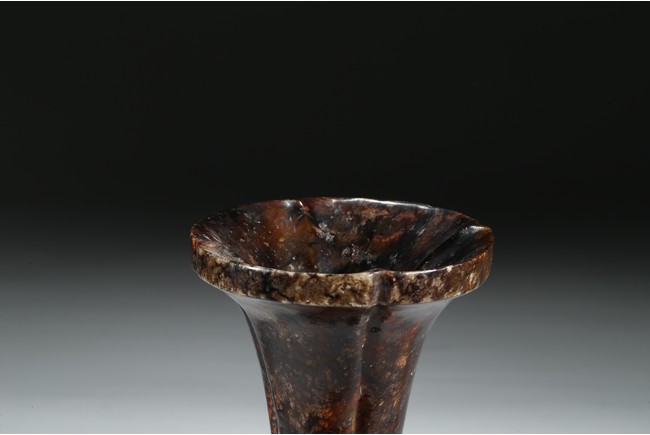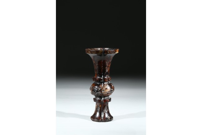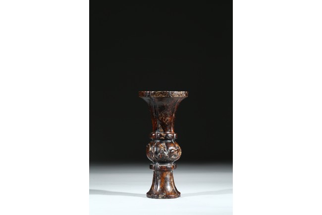 敞口,束頸,鼓腹,高圈足外撇,通體紅褐色沁色,局部鈣化。保存完好,實為難得,宜藏宜賞。