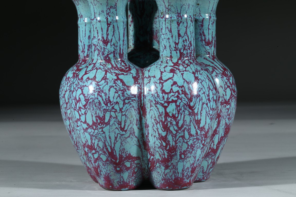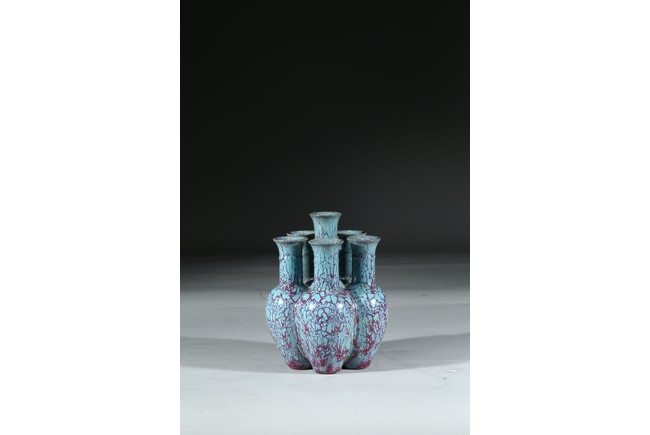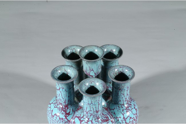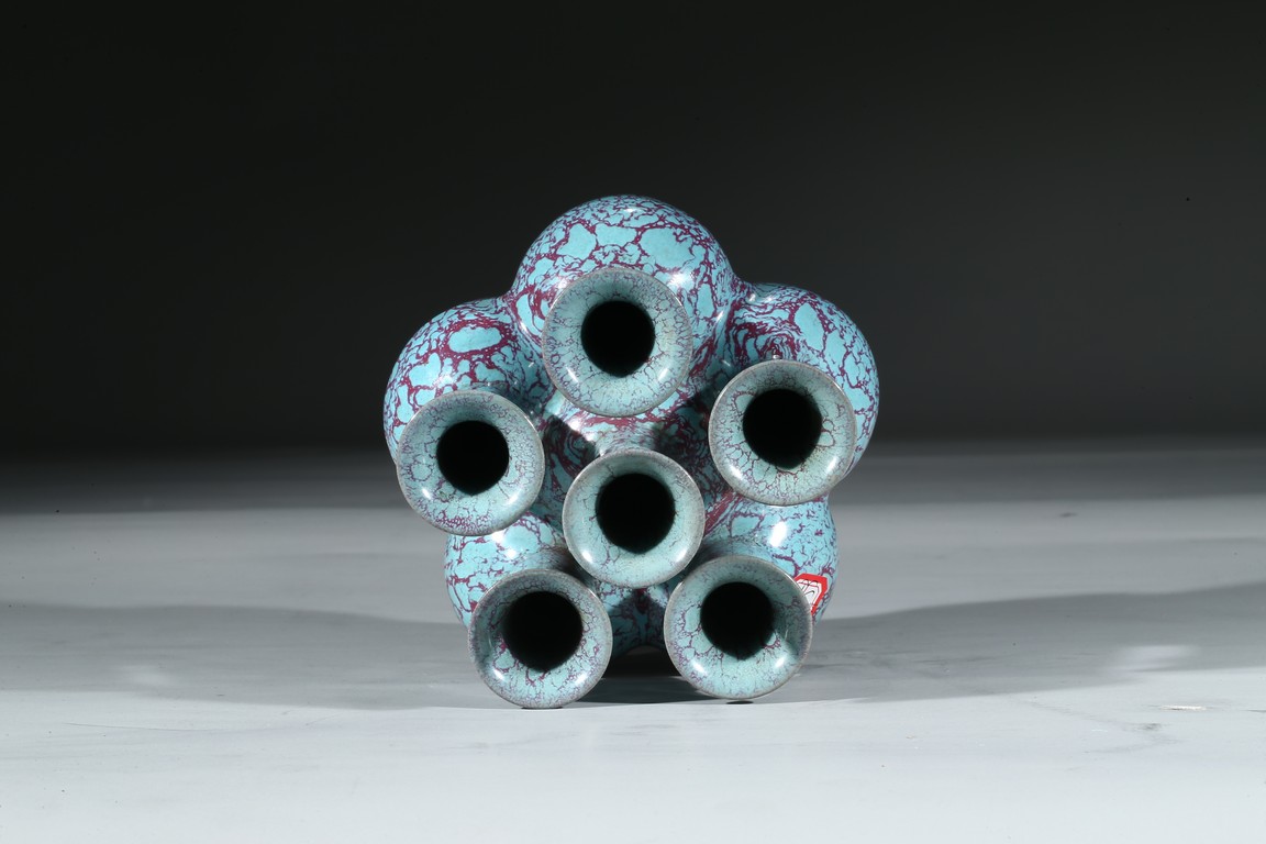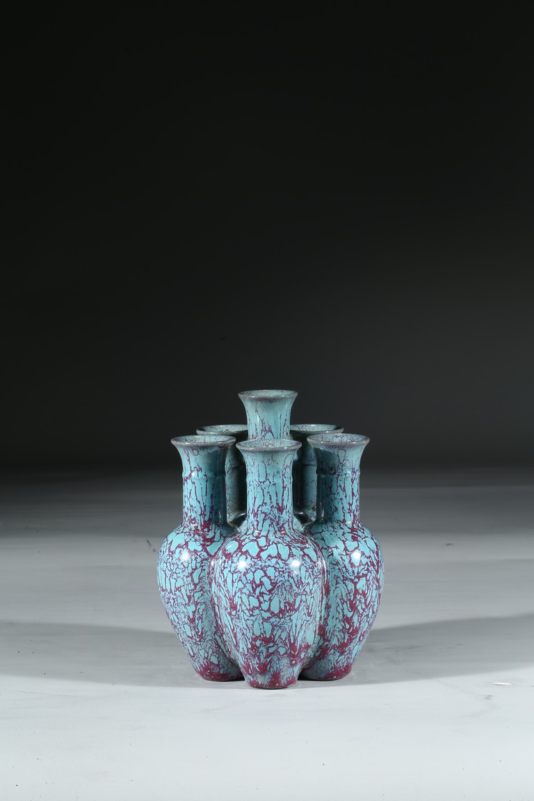 拍品造型獨特,由六瓶緊密相連而成,每支小瓶均敞口,長頸部各有凸起弦紋一道,圓肩,弧腹下垂,圈足。通體施爐鈞釉,釉面均勻凝潤,釉面失透滋潤,釉色深沉,流淌的綠釉交混點點紅斑。中間一瓶底刻“雍正年製”款識,更添古意。