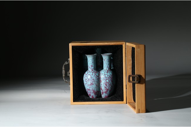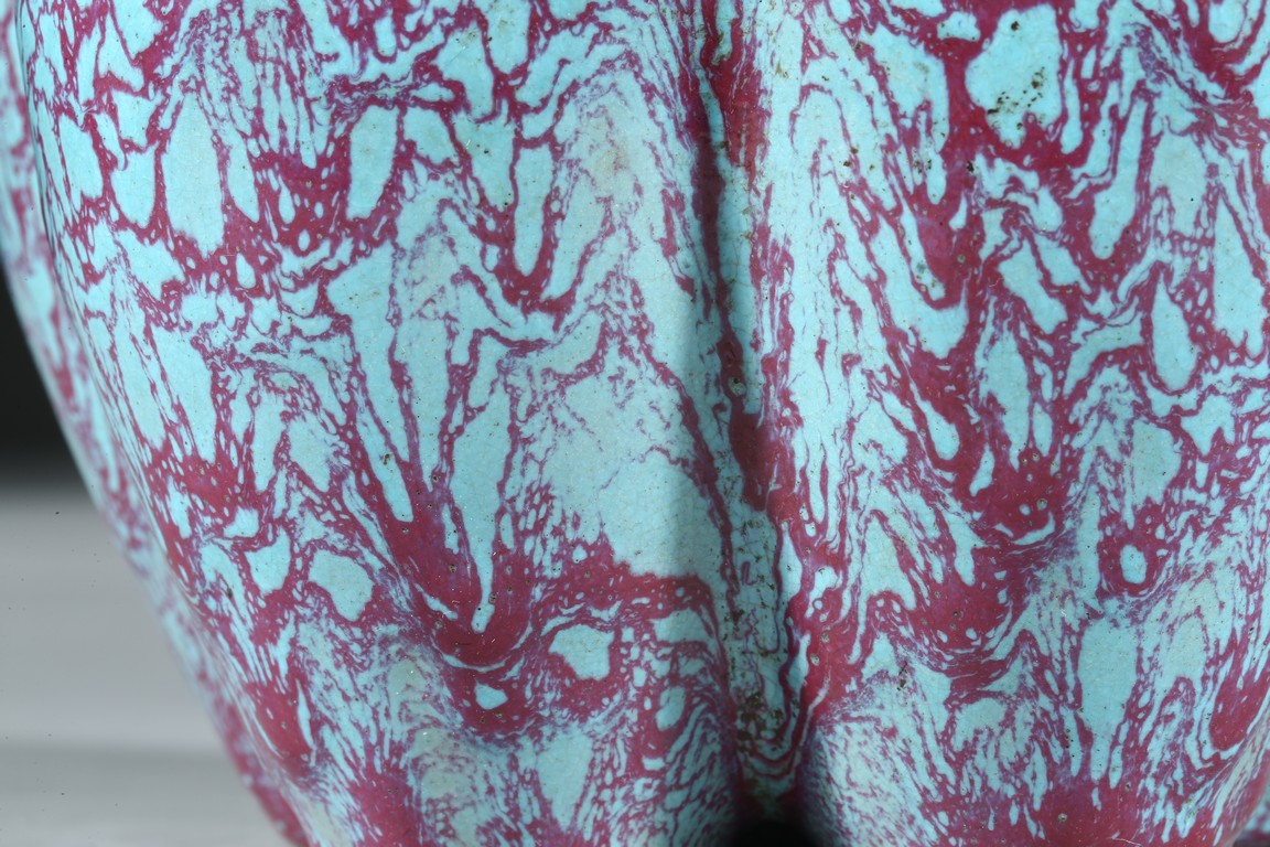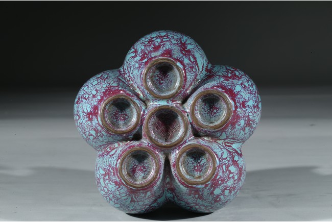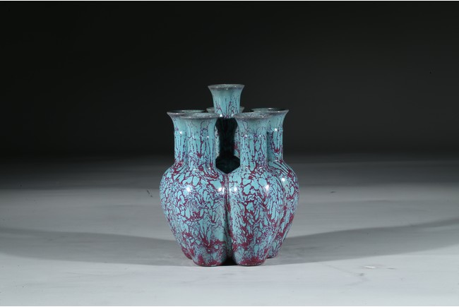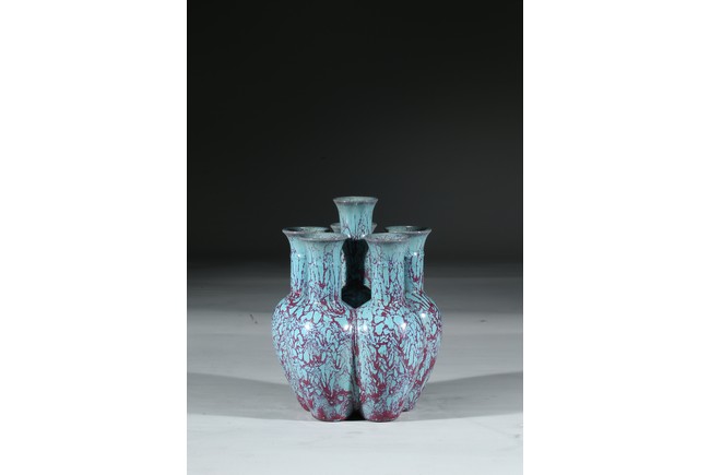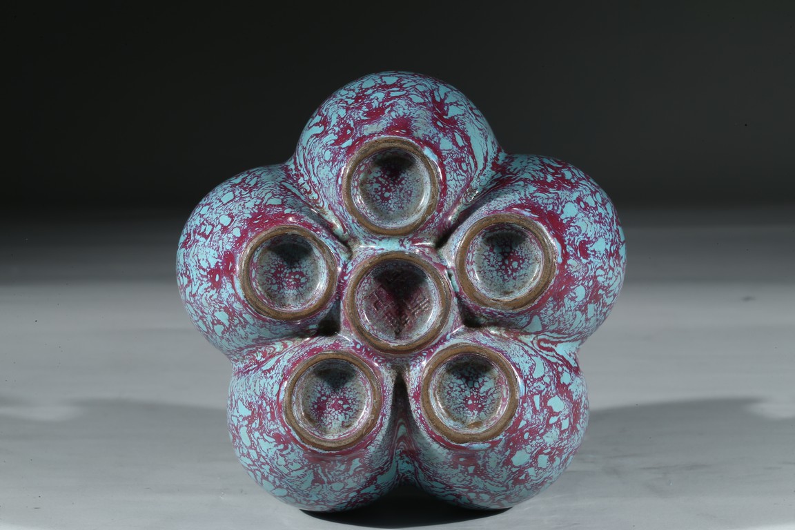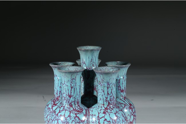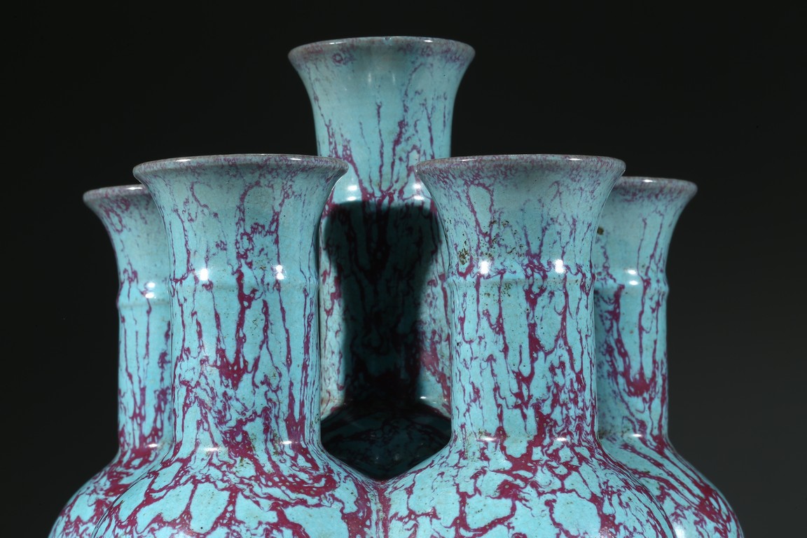 拍品造型獨特,由六瓶緊密相連而成,每支小瓶均敞口,長頸部各有凸起弦紋一道,圓肩,弧腹下垂,圈足。通體施爐鈞釉,釉面均勻凝潤,釉面失透滋潤,釉色深沉,流淌的綠釉交混點點紅斑。中間一瓶底刻“雍正年製”款識,更添古意。