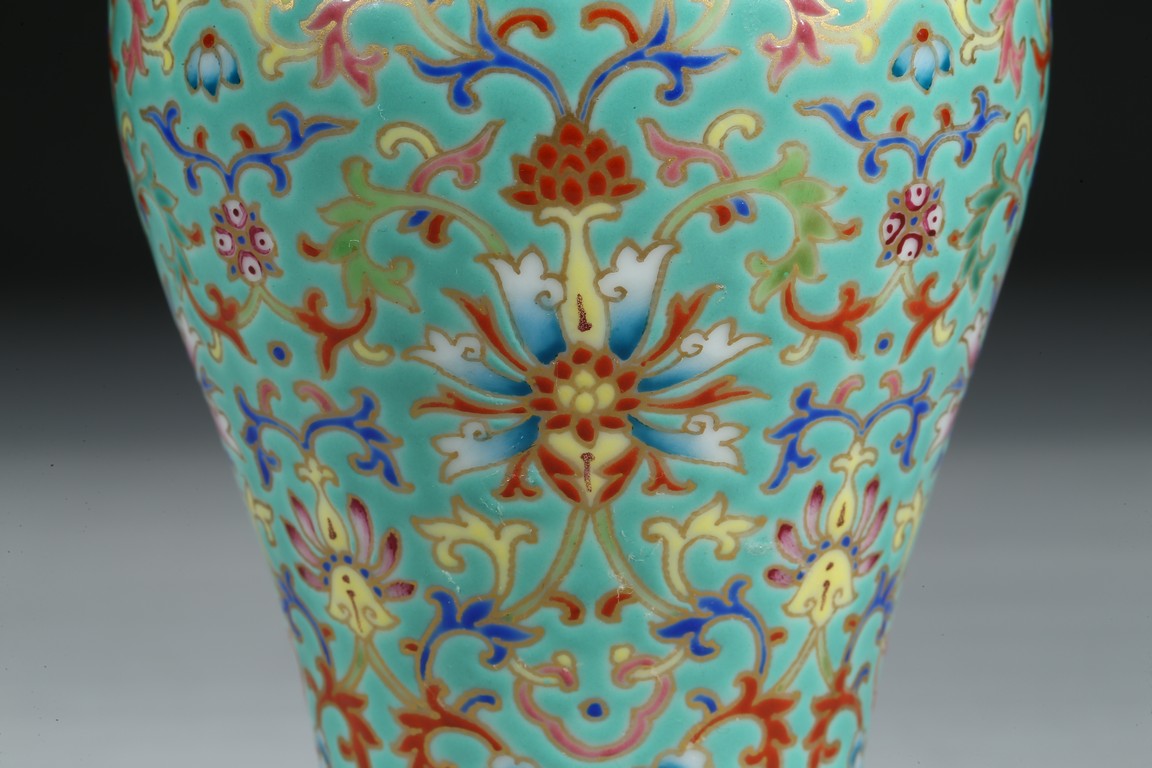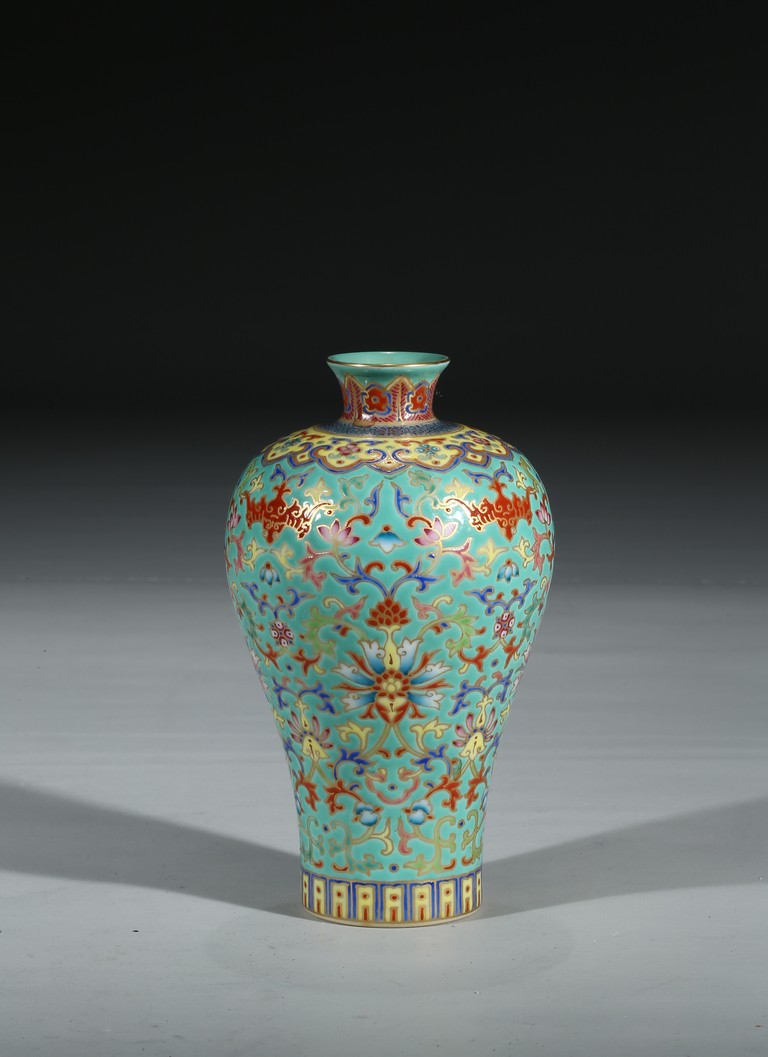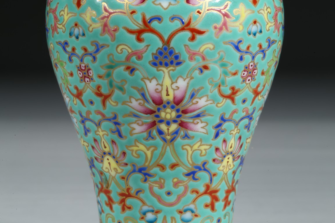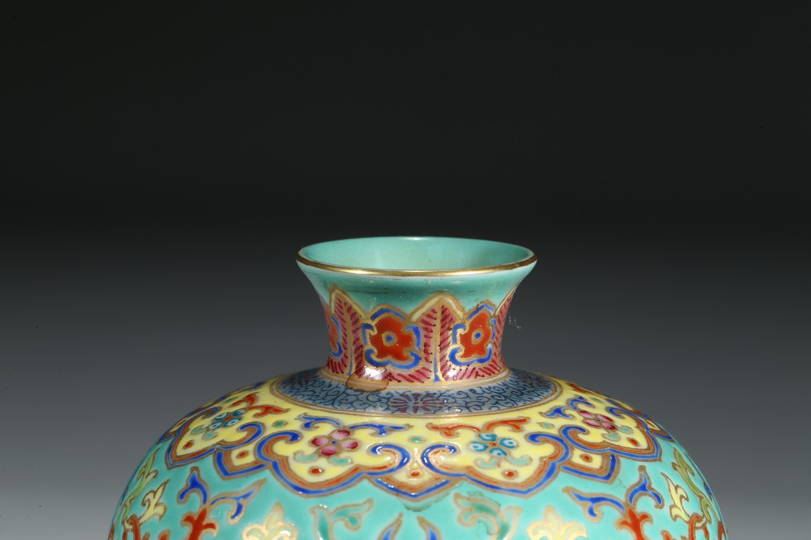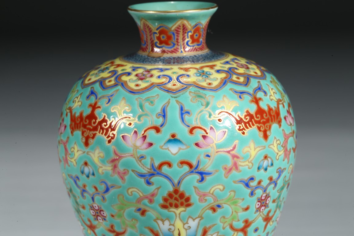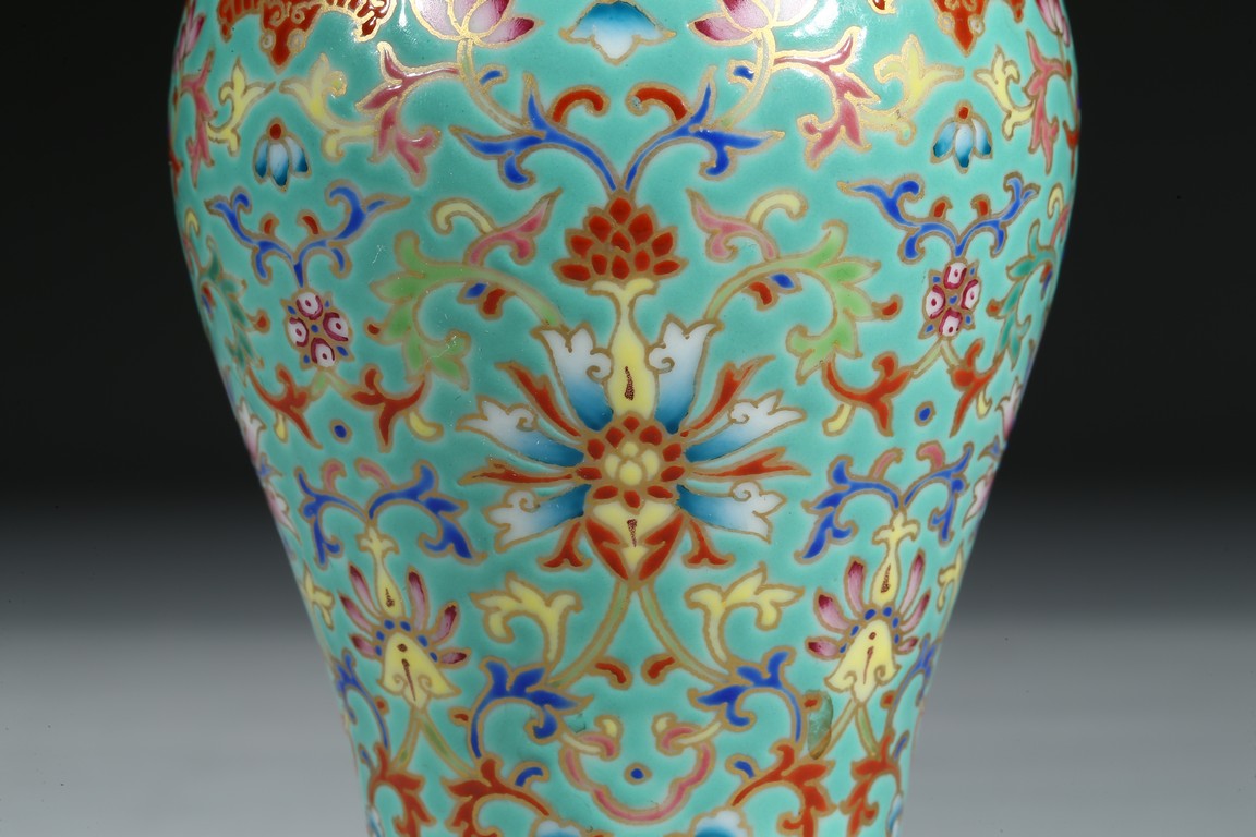 Well potted with a short narrow neck set on high broad shoulders tapering to a slightly flared foot, brightly enamelled in the famille-rose palette and gilt overall with leafy scrolls bearing stylised lotus blossoms, a stylised iron-red bat depicted with outstretched wings on both sides, all against an even turquoise ground, the base inscribed in gilt with six character Qianlong mark. Qing Dynasty Qianlong period.