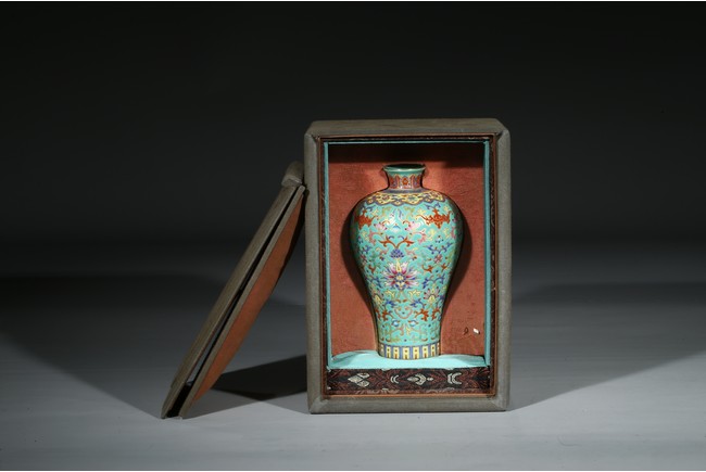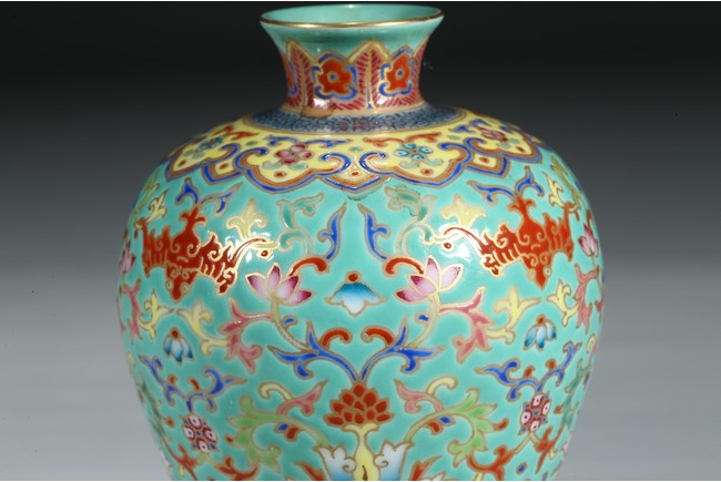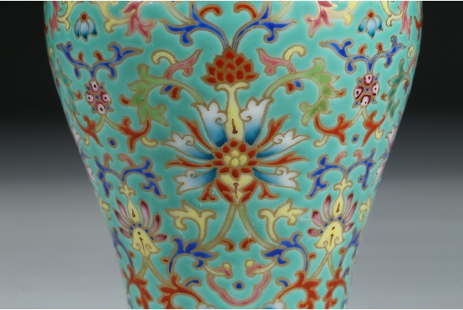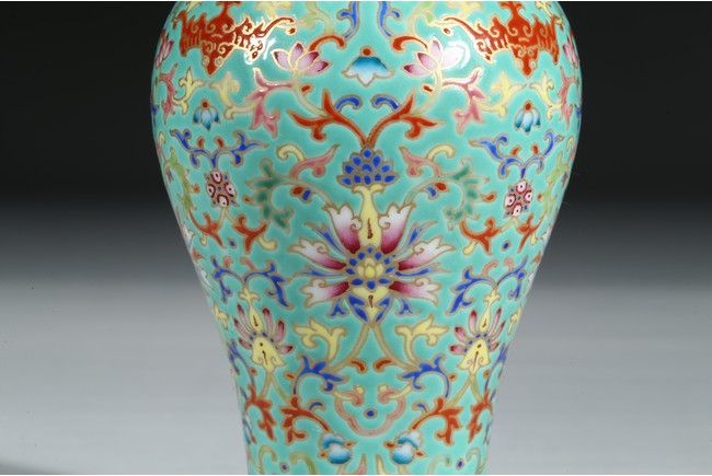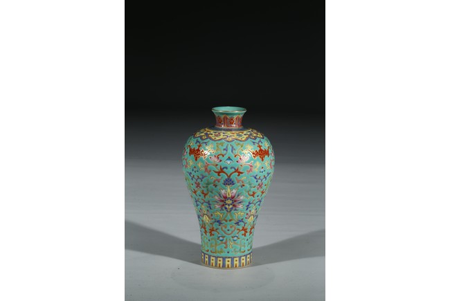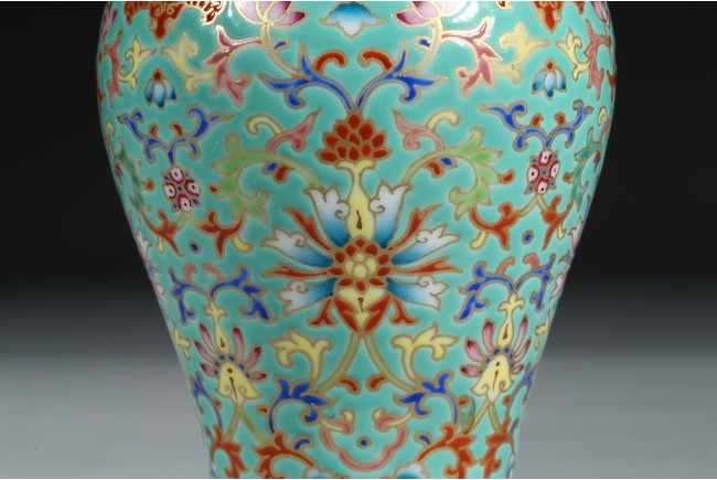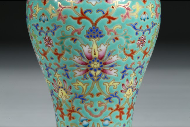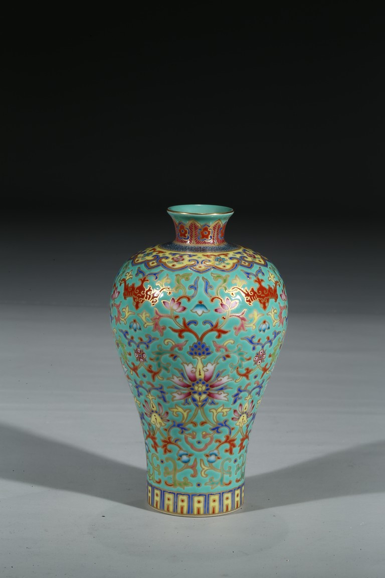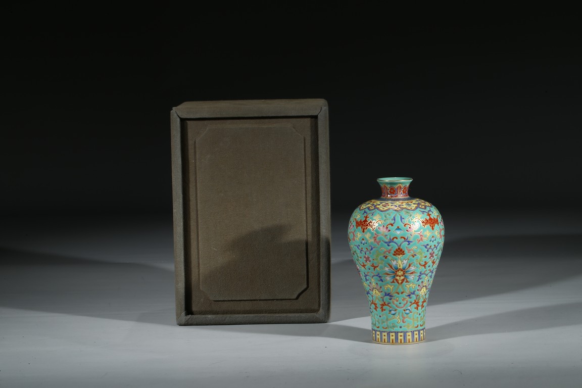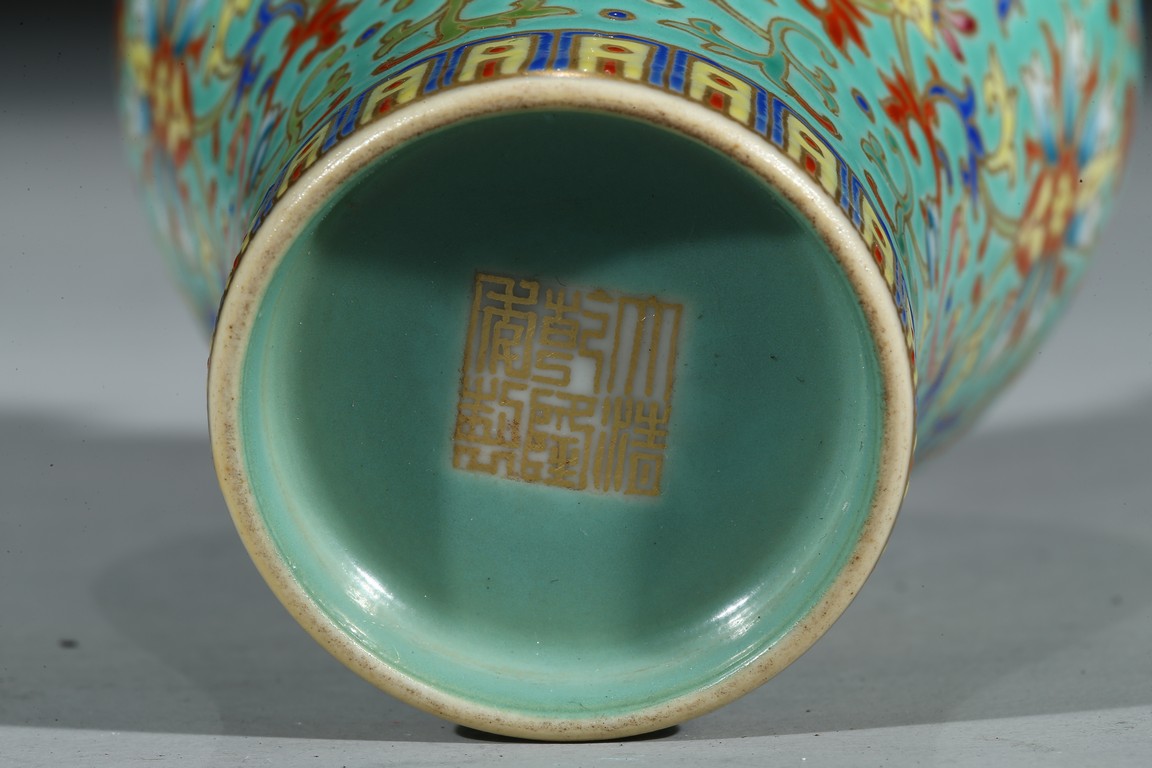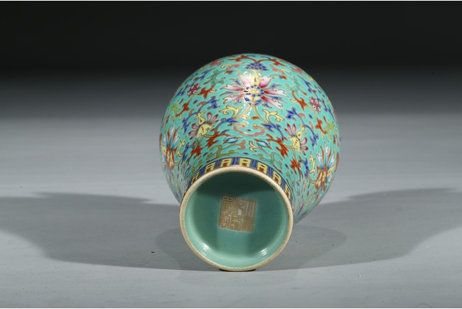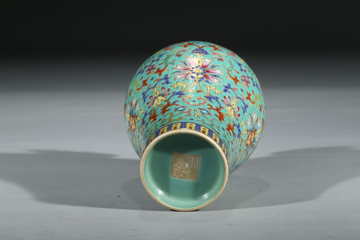 小口,唇微撇,短頸,豐肩,腹部下斂,瓶體修長,精美雅緻。內裡與外底通施松石綠釉,厚潤均勻。外壁粉彩繪纏枝花卉紋,紋飾佈局繁密,彩料鮮妍絢麗。“大清乾隆年制”款識。