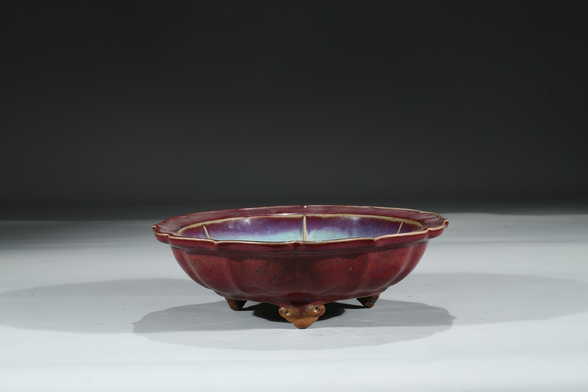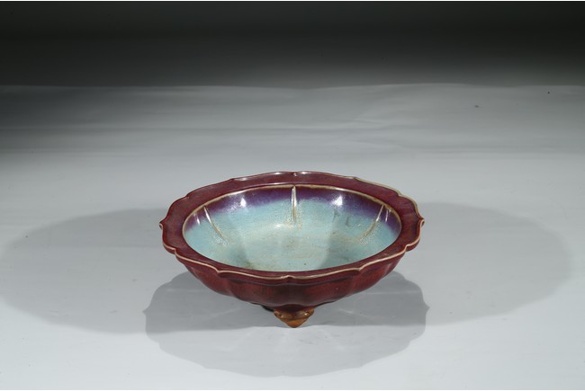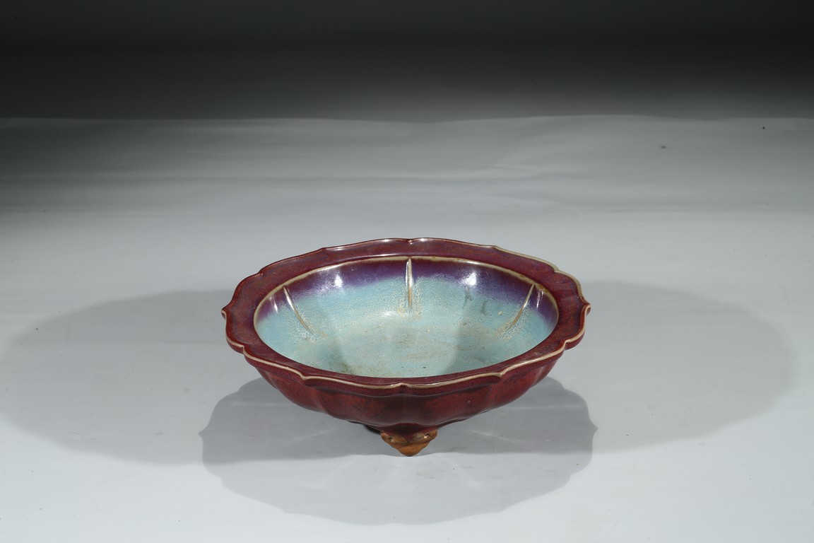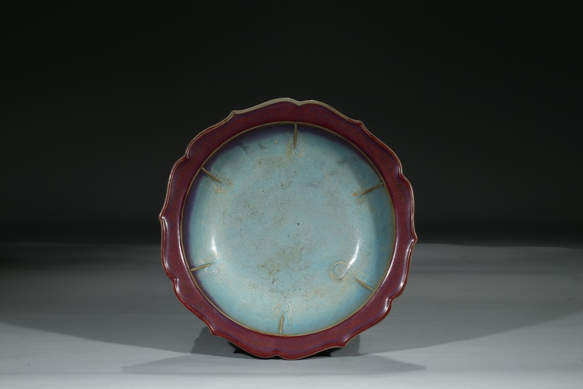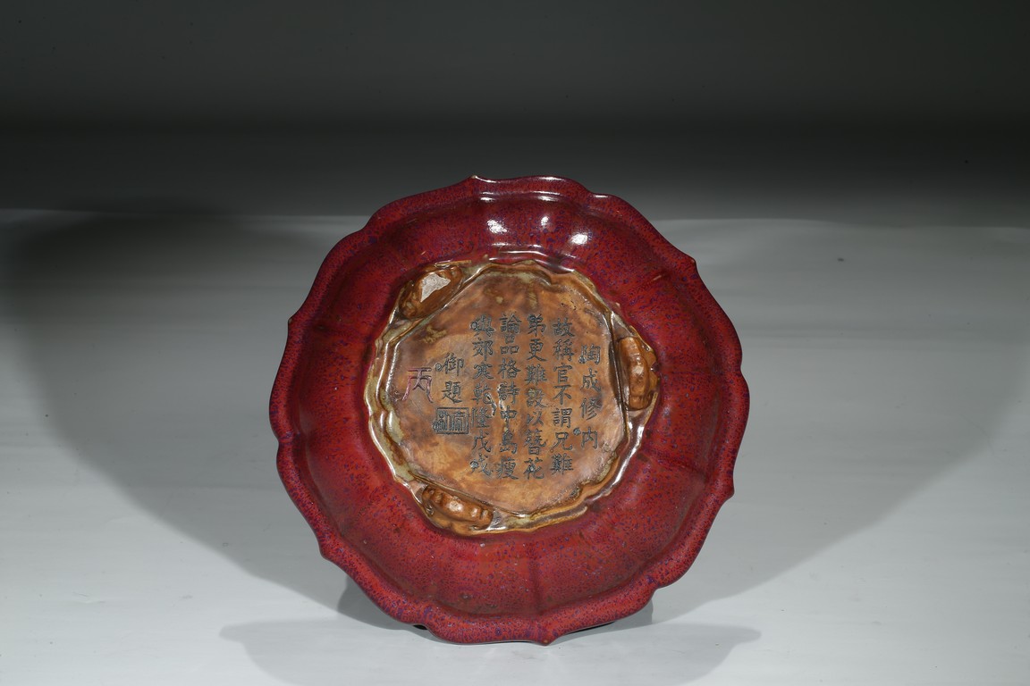 鈞窯,即鈞台窯,是在柴窯和魯山花瓷的風格基礎上綜合而成的一種獨特風格,受道家思想深刻影響,在宋徽宗時期達到高峰,其工藝技術發揮到極致。無論是呈色和各種紋理的表現,做到窯變可控隨心所欲的表現技術,至今無人能仿造。此件器物葵口,胎質細膩,釉色絢麗奪目。底部“陶成修內故稱官不謂兄難弟更難設以簪花論品格詩中島瘦與郊寒”“乾隆戊戌御題”“丙”。