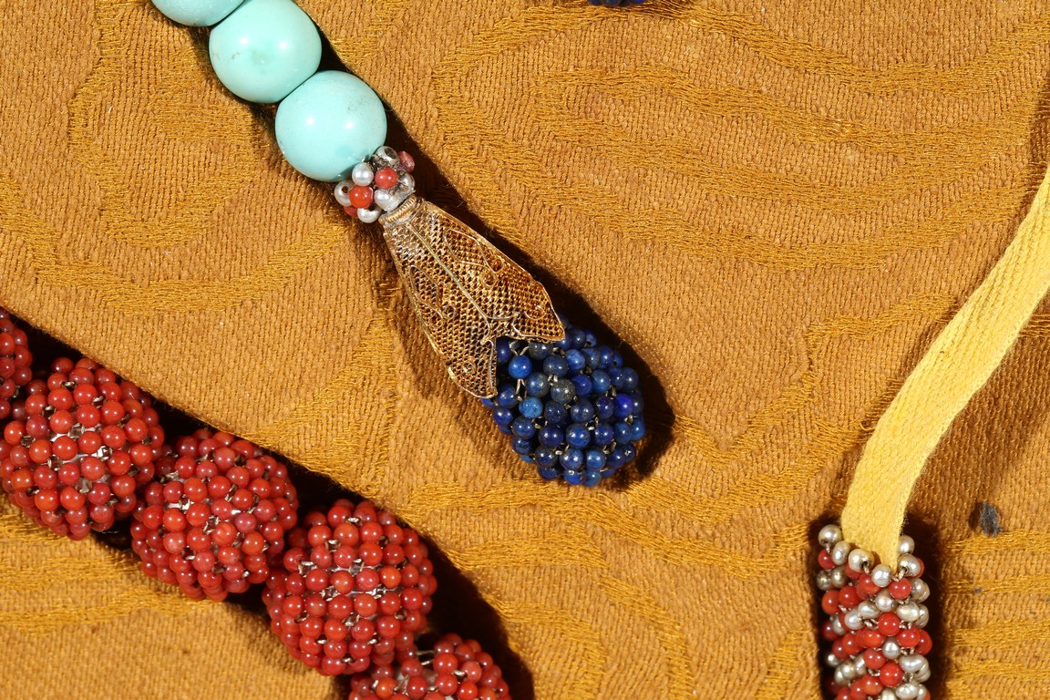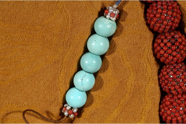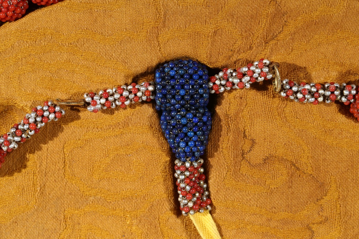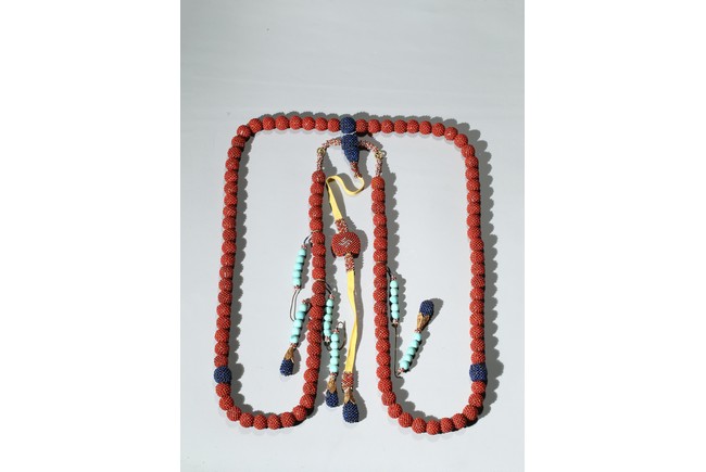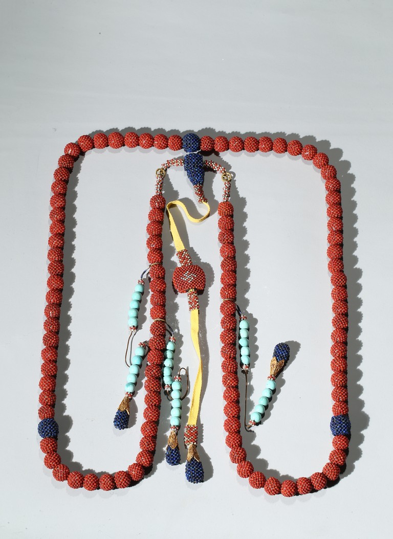 朝珠是清朝皇帝和官員著禮服(朝服、衰服)、吉服(龍袍) 和常服時佩戴的一種裝飾物,掛在頸項垂於胸前,是顯示身份和地位高低的重要標誌之一。此朝珠以紅瑪瑙、青金石、珍珠、綠松石為材製作而成。各色珠子圓潤飽滿,大小一致,色澤鮮亮,保存完好,彌足珍貴。