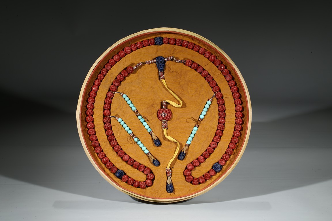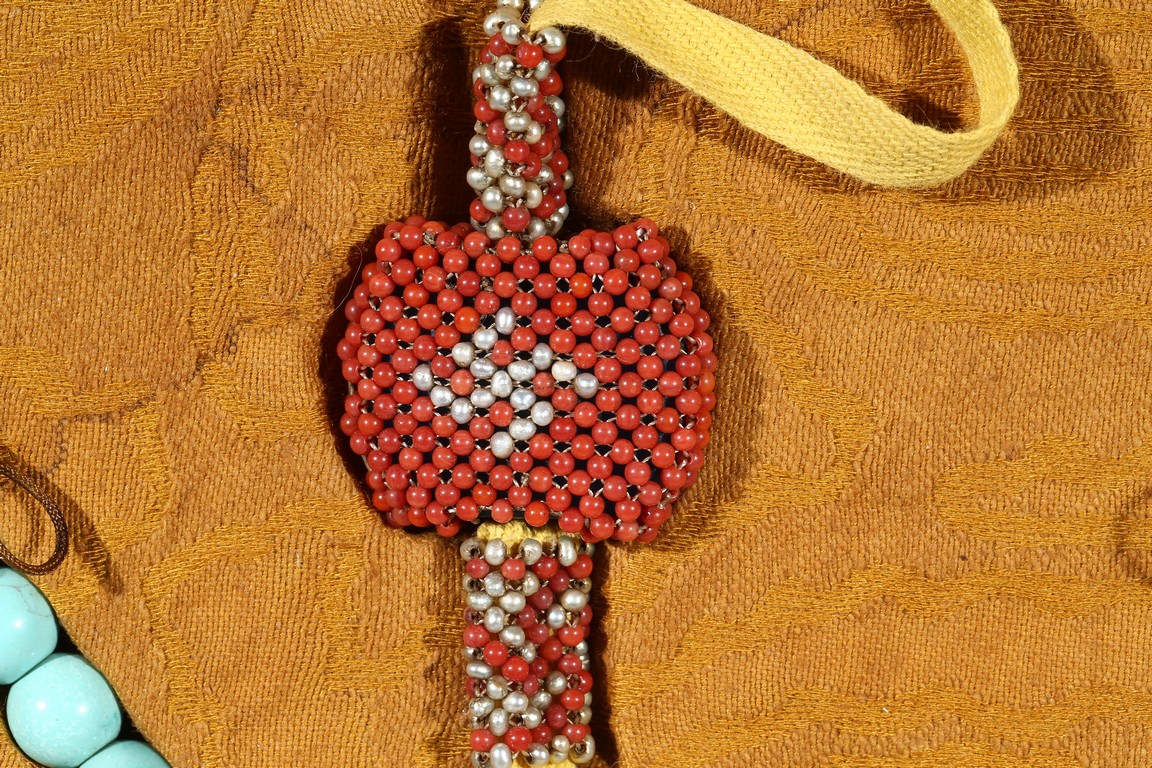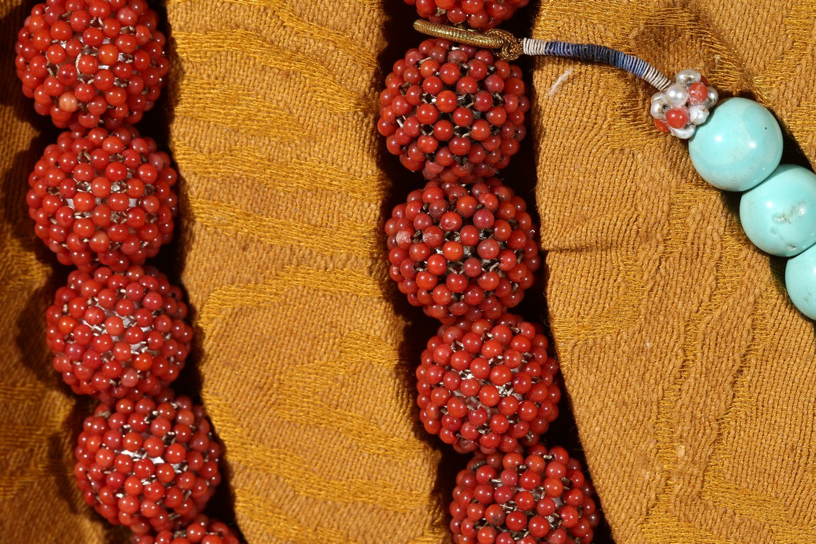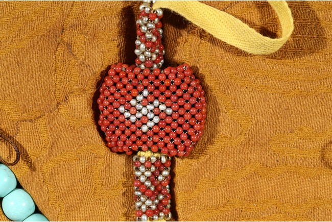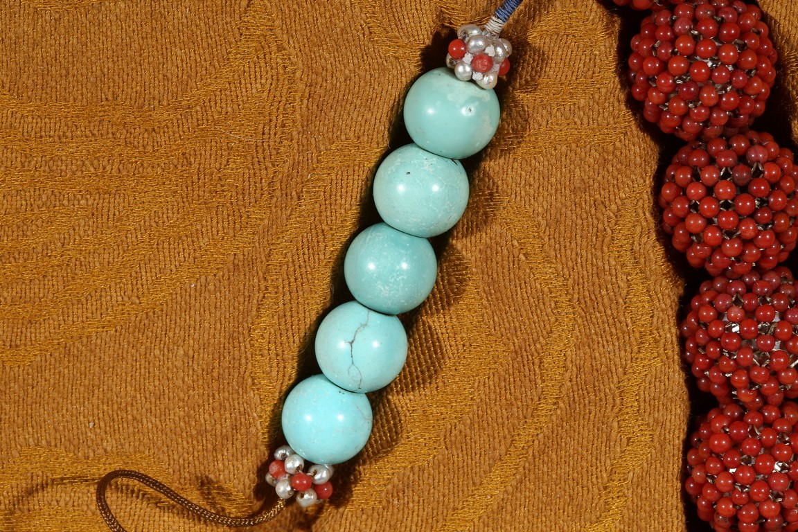 朝珠是清朝皇帝和官員著禮服(朝服、衰服)、吉服(龍袍) 和常服時佩戴的一種裝飾物,掛在頸項垂於胸前,是顯示身份和地位高低的重要標誌之一。此朝珠以紅瑪瑙、青金石、珍珠、綠松石為材製作而成。各色珠子圓潤飽滿,大小一致,色澤鮮亮,保存完好,彌足珍貴。